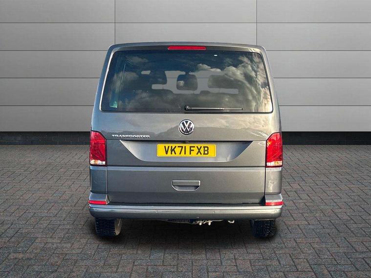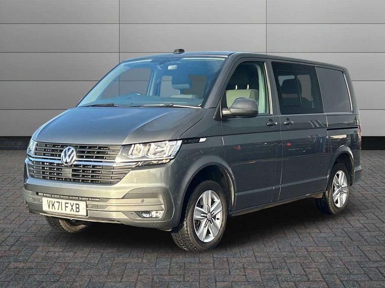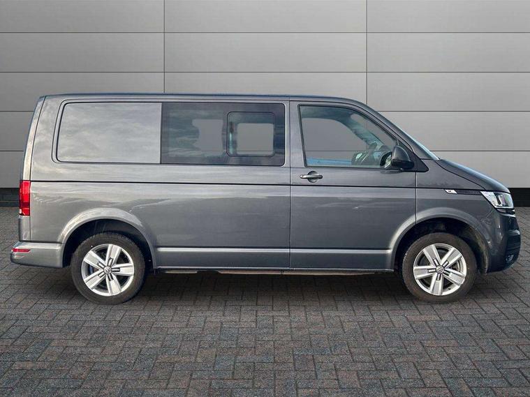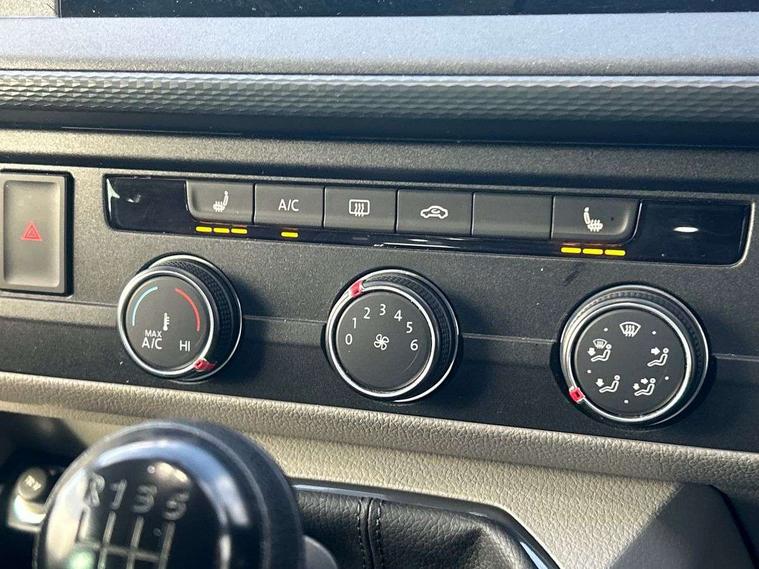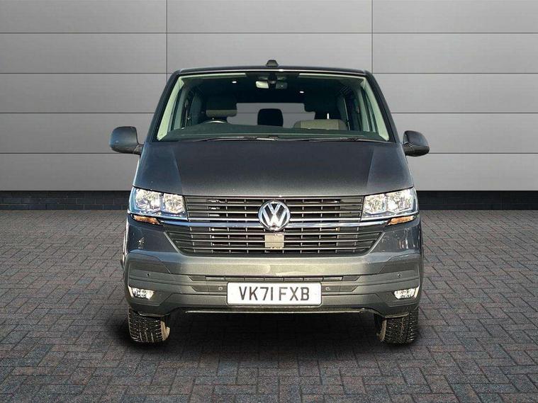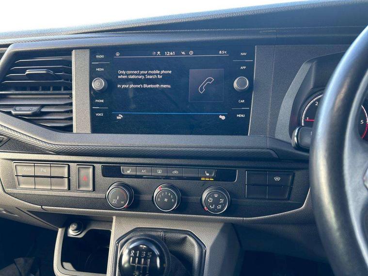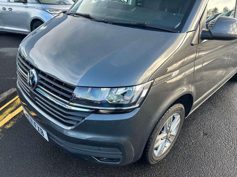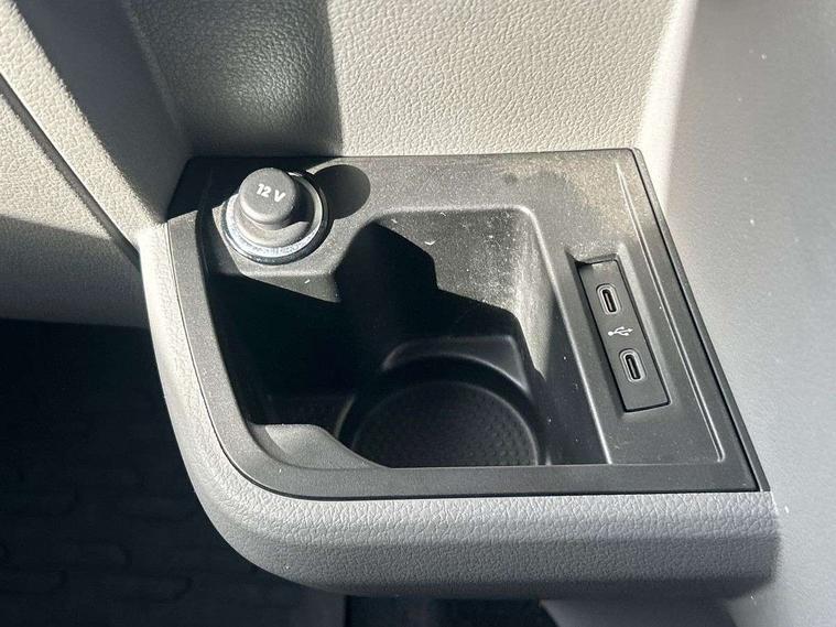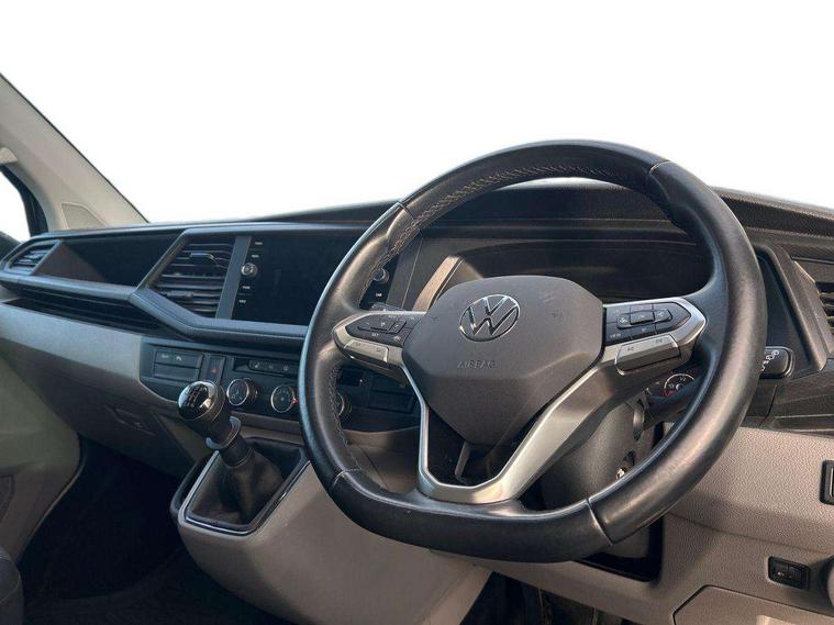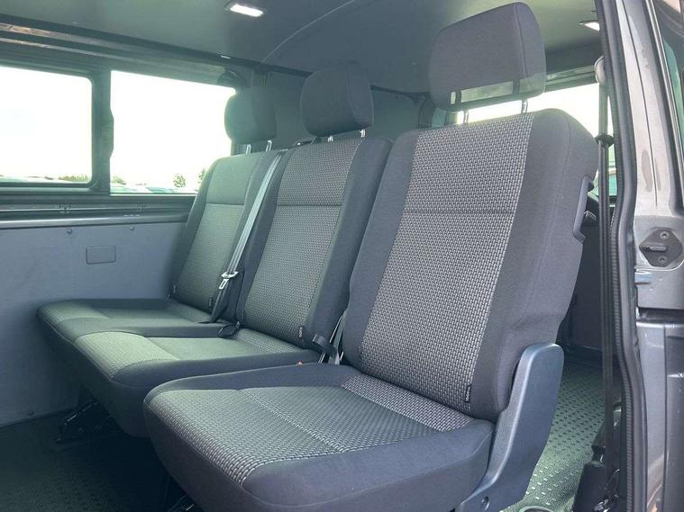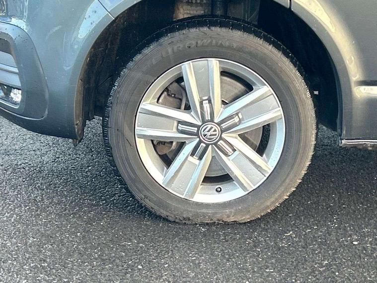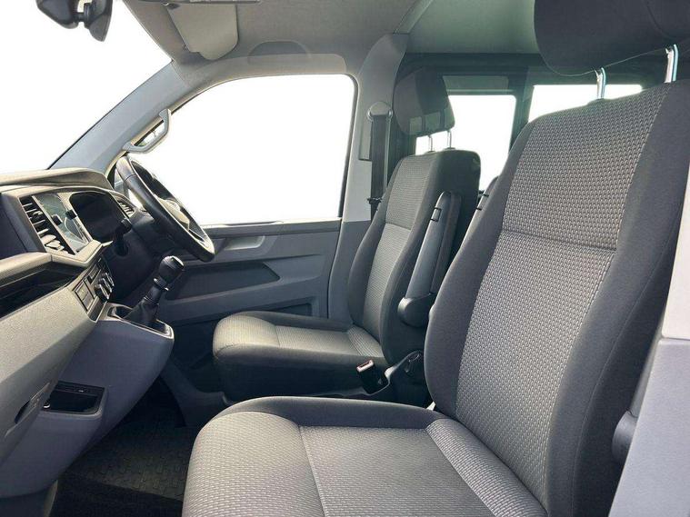 Adaptive cruise control, Child seat anchors ISOFIX and top tether in 2nd row of seats, Cross wind assist, Dimmable illuminated instruments, Driver alert with black and white multi function display plus, eCall emergency system, Electromechanical speed sensitive power steering, height and longitudinally adjustable steering column, Forward collision warning front assist with autonomous emergency braking, Headlight range control, Mobile phone interface, Without voice control, 2 USB interfaces type C in dashboard, 4 speakers with 2 tweeters and 2 woofers, Composition colour radio with 6.5" touchscreen, Digital radio reception (DAB+), Volkswagen app connect, Automatic headlight control, leaving home and manual coming home feature, Front fog lamps with cornering light, Green heat insulating glass, Heated front windscreen, Illuminated steps in passenger/load compartment, Left convex exterior mirror, Power adjustable and heated exterior mirrors, Power folding door mirrors, Privacy glass in passenger compartment, Radiator grille with 2 chrome trims, Rear window with heated insulating glass, heated rear window wiper and washer system, Right convex exterior mirror, Tailgate closing with unlatching from the inside, Tailgate with window aperture, Transporter nameplate on the rear fender, Windshield wiper intermittent control with rain sensor for windshield wipers, Without adhesive film, 3 spoke leather wrapped multi function steering wheel, Additional sound deadening measures in cab and passenger compartment, Auto dimming breakaway interior rear view mirror, Comfort headliner in cab, hardboard roof trim in passenger and load compartment, Dust/pollen filter, Folding grab handles and storage compartments on cab seats, reading light, Front seats on the right in 1st row of seat, Glove compartment with illumination, Heavy duty tool kit and jack, Interior plastic loading edge protection, Lashing rings for load restraint system, LED Interior lighting in load and passenger compartment, Medium height for vehicles with window aperture hardboard side trim panels in passenger/load compartment, Refrigerant R134a, Rubber floor covering in cab, Rubber floor covering in passenger/load compartment with loading edge protection in rear, Standard lower part dashboard in palladium, Without partition, Without seats in 3rd row of seats, Exterior pack without fog light- Transporter, Non smoker pack - Transporter, 3 point height adjustable seat belts on outer seats cab with electric pretensioners, Driver and front passenger airbag with front passenger airbag deactivation, Power operated child safety lock, Single tone horn, Warning buzzer and light for driver seat belt not fastened, Anti theft alarm system with interior monitoring in cab, backup horn and towing protection, Lockable wheel bolts, 16" chassis with 16" brake system, 70 L volume fuel tank, Additional 12V socket, Diesel particulate filter, Electronic stability control, ABS, ASR with deactivation button, hill start assist and brake assist system, Speed limiter, Start/stop system with regenerative breaking, 17" Devonport silver alloy wheels, Wheel trims,