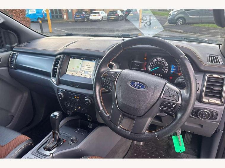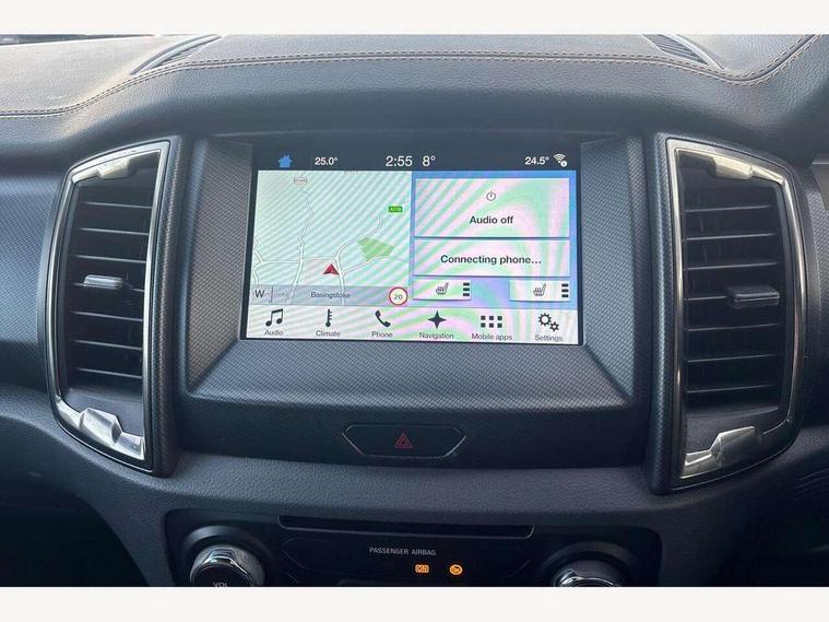 Bluetooth hands free kit with voice control, Digital tachograph, Easy fuel capless refuelling system, Multifunction colour display, Outside air temperature display with ice warning, PAS, Rear view camera, Reverse parking sensor, Satellite navigation system, SD card slot, Seatbelt warning indicator, SYNC 3.0 with 8" Colour touch screen, Trip computer, Tyre pressure monitor, 6 speakers, Aux input socket, DAB with CD and MP3 player, Steering wheel mounted audio controls, USB connection, Aerodynamic sports bar, Aluminium finish roof rails, Auto dimming rear view mirror, Black tailgate handle, Body colour bumpers, Body colour wheel arch mouldings, C-channel loadbox tie downs, Chrome effect scuff plates, Daytime running lights, Door mirror mounted LED turn signals, Electric folding door mirrors, Electric rear windows, Electric windows, one touch lowering + anti trap device (Driver only), Front fog lights, Front mud flaps, Headlamp levelling, Heated front window, Heated rear cab window, Pick up box sports rail extension, Plastic side steps, Privacy glass, Puddle lights in door mirrors, Rain sensitive wipers and auto headlights, Rear step in bumper, Steel double skinned pick up box with 2 position tailgate and inner fenders, Titanium coloured electrically adjustable and heated door mirrors with memory, Titanium grille, Under hood engine cover, 4 speed air recirculation fan + heater, 8 way adjustable and heated driver/single passenger seat with lumbar support, Ambient interior lighting, Caliber cloth/Journey grain leather upholstery, Centre console coolbox, Door operated dome light with courtesy switches on all doors, Driver and passenger sunvisors with illuminated vanity mirrors, Electronic air temperature control (EATC), Fixed bench with 2 height adjustable head restraints, Front centre armrest with storage bin, Front centre console with dual cup holders and armrest with double lidded storage box, Front door storage pockets, Front passenger grab handle, Front seat back map pockets, Graphite finish instrument panel, High performance bedliner with protective side wall, Illuminated glovebox, Interior tie down hooks and load rest, Leather gearknob, Leather wrapped steering wheel with contrast stitching, Load area light, Map reading lights, Overhead stowage with mood lighting, Overhead sunglasses holder, Premium carpet mats, Reach and rake adjustable steering column, Rear cup holders, Tie down rails and rope hooks, 3x3 point rear seatbelts, Child proof rear door locks, Driver and passenger airbag, Front passenger airbag deactivation, Front seatbelt pre-tensioners with load limiters, ISOFIX child seat mountings, Knee airbag, Side curtain airbags, Side Thorax Airbags, Speed sensing door locks, Additional flip key, Immobiliser, Lockable tailgate, Locking wheel nuts, Remote central locking, Spare wheel lock, Thatcham category 1 alarm, 2 x 12V power outlets, ABS + EBD, Emergency brake assist, ESP including traction control, Rear 12v plug, Centre console bezel with graphite finish, 18" Machined alloy wheels,