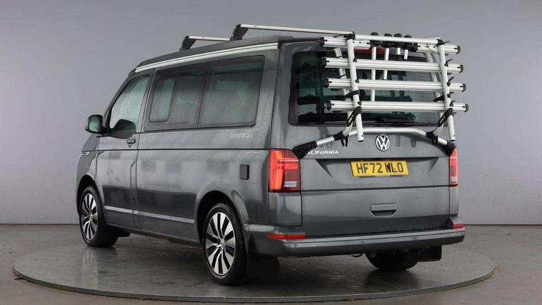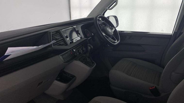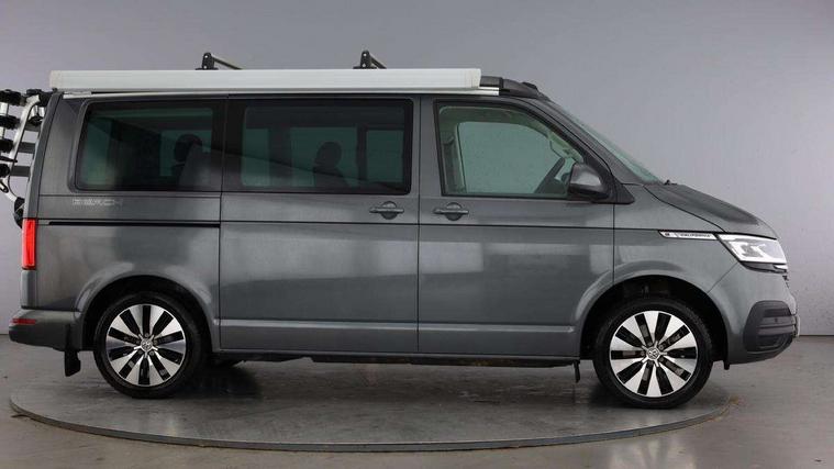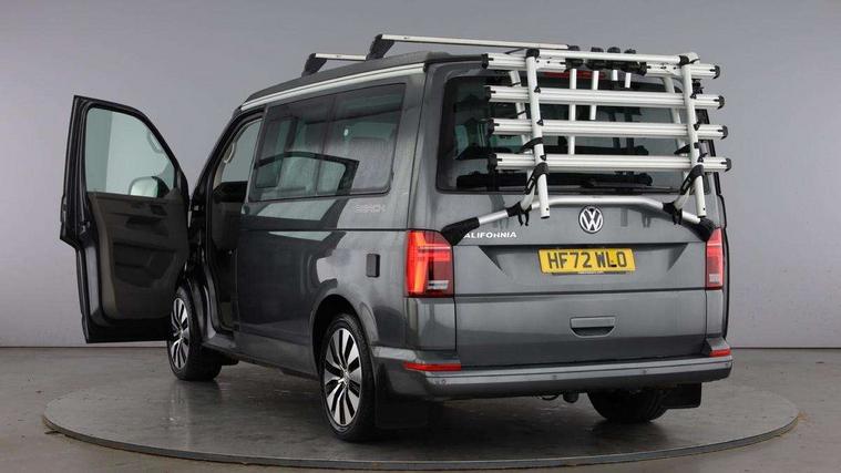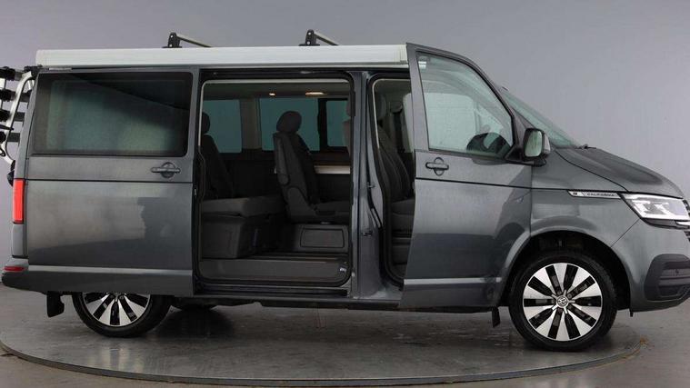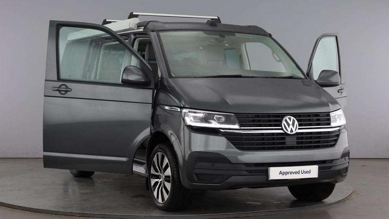 Cross wind assist, Driver alert system, eCall emergency system, Mobile phone interface, Multifunction display premium with color display, Service interval indicator, Speed limiter, Start/stop system with regenerative braking, Tailgate latch without unlocking function from inside, Tailgate with window aperture, Volkswagen app connect, Without lane change system side Assist, Without voice control, Without washerfluid level indicator and without heated washer nozzles, 17 inch chassis with 17 inch disc brakes in front and 16 inch disc brake in rear, 2 (type C) USB interfaces in dashboard, 8 speakers (4 tweeters + 4 woofers), Composition colour radio with 6.5 inch touchscreen, Digital radio reception (DAB+), Regional code ECE for radio, Additional dust seals on the outside, Body colour bumpers, Body coloured door handles, Body coloured door mirrors, California nameplate on the fender and on the rear, Fixed front and rear side windows in load/passenger compartment on driver side, Headlight range control, High level 3rd brake light, Left convex exterior mirror, Mounting rails on the roof (preparation for movable roof rack), Radiator grille with 2 chrome trims, Rear boot, Rear heated window with window wiper and washer system, Red LED rear combination lamps, Right convex exterior mirror, Without left sliding door in load/passenger compartment, 1 waste bin in door storage compartment of the cab, 12V outlets in dashboard X 2, 230V inlet with charging feature for vehicle batteries and 230V outlet in the interior, 3 spoke leather wrapped multifunction steering wheel, Allergen filter, Armrest for both cab seats, Camping table for inside/outside in sliding door and 2 folding chairs in tailgate, Child seat anchors ISOFIX and top tether for Multivan/California in 2nd to 4th row of seats, Dimmable illuminated instruments, Electromechanical speed sensitive power steering, height and longitudinally adjustable steering column, Front head restraints, Glove compartment with illumination, Grab handles on A pillar for access, on driver and front passenger side, Illuminated steps in passenger/load compartment, Illuminated sun visors with mirror and airbag label on front passenger sun visor, Interior loading edge protection in plastic, Jack and tool kit, Manually adjustable lumbar supports for left and right single seat in the 1st row of seats, Mini kitchen (on side panel between B and C pillar) with 1 gas cooking plat, Operating voltage 12V including 230V outlet on driver seat, Plastic floor covering in passenger/load compartment, Rear head restraints, Refrigerant R1234yf, Roof bed (2000 x 1200 mm) with spring plates and mattress, Soft folding grab handles on roof frame, Special interior noise suppression measures, Special sound deadening measures in cab and passenger compartment, Step illumination with California lettering, Swivel seat on the left, with lumbar support in 1st row of seats, Swivel seat on the right, with lumbar support in 1st row of seats, Without floor mats, Without height adjustment for driver and single passenger seats, Without insulating box and without refrigerated glove compartment, Smokers pack - California, 3x3 point rear seat belts, Airbags - Drivers and front passengers side and curtain airbags, Driver/Front Passenger airbags, Electronic stability control, ABS, ASR, EDL, brake assist system, Front assist with Autonomous emergency braking for Adaptive cruise control (ACC), Height adjustable 3 point seat belts on outer seats in cab with electric pretensioners, Hill start assist, Manual passenger airbag deactivation function, Power operated child safety locks, Single tone horn, Warning buzzer and light for driver seat belt not fastened, Anti theft alarm system with interior monitoring in cab, backup horn and towing protection, Central locking system with radio remote control, system controls inside and safelock, Lockable wheel bolts,