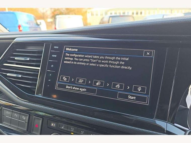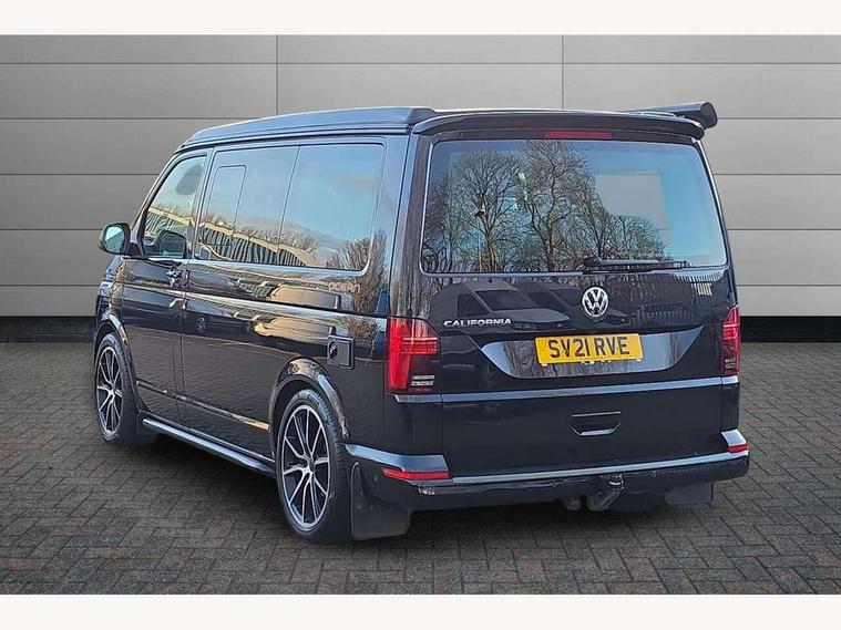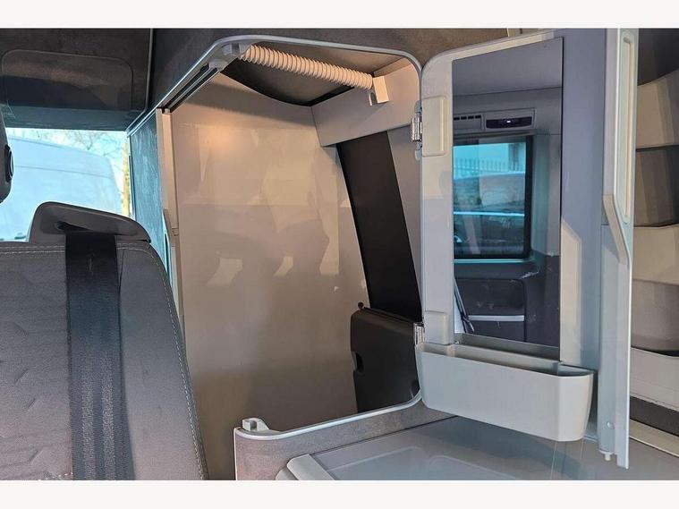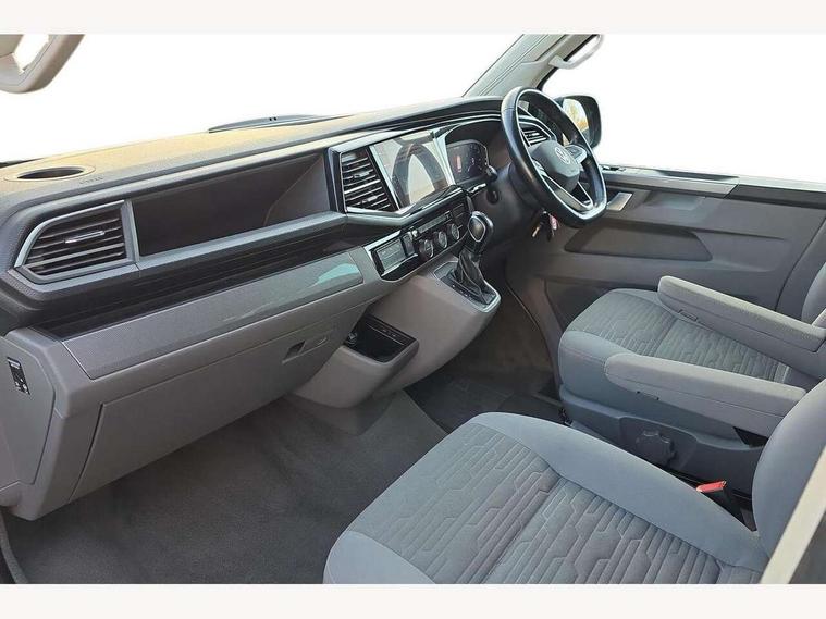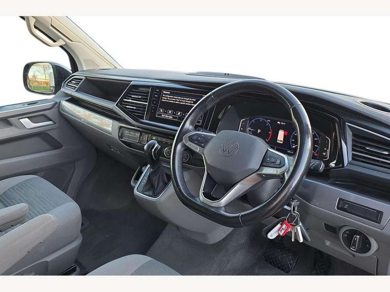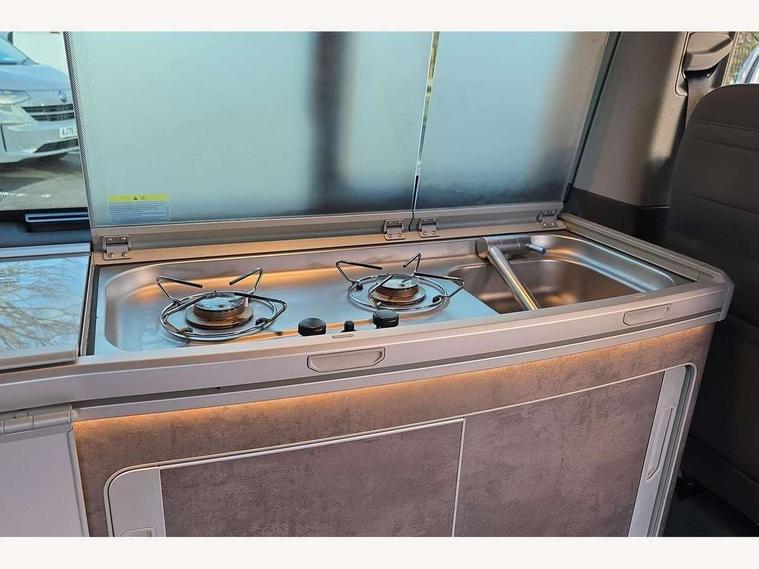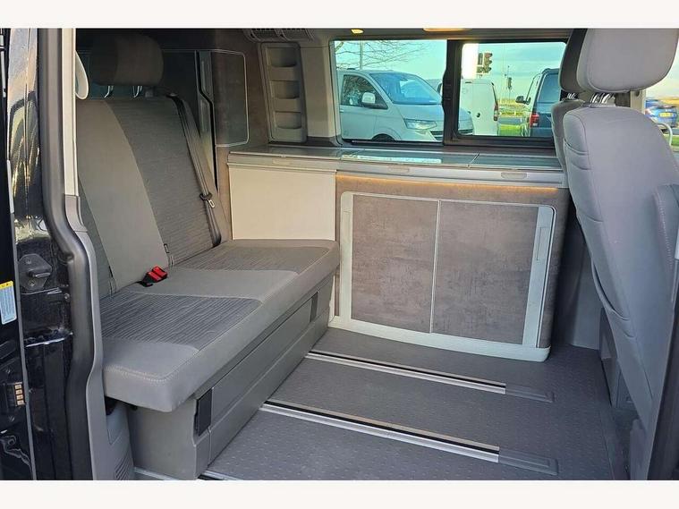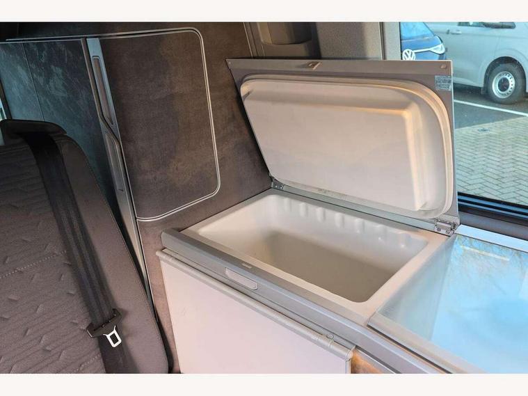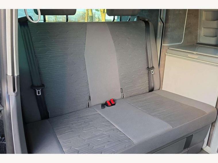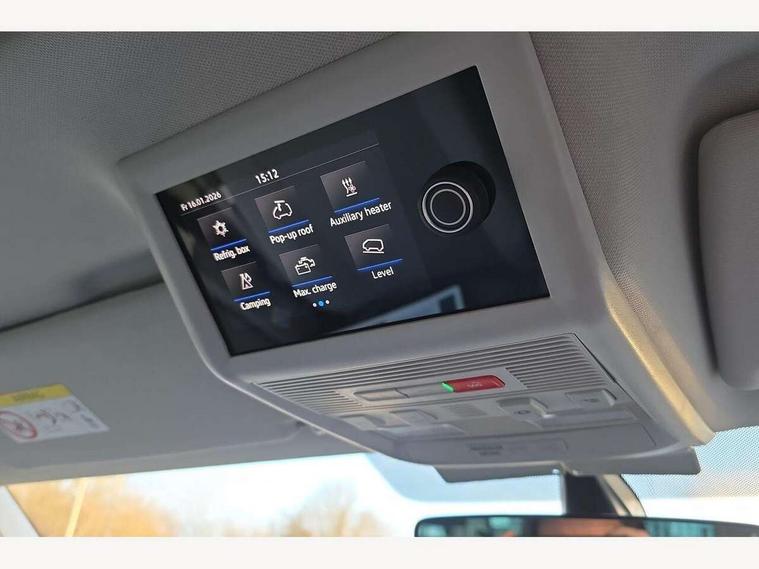 Cross wind assist, Digital cockpit and driver alert system, eCall emergency system, Mobile phone interface, Navigation system preparation, Service interval indicator, Speed limiter, Start/stop system with regenerative braking, Tailgate latch without unlocking function from inside, Tailgate with window aperture and with power latching, Voice control system, Wired and wireless app connect, 17 inch chassis with 17 inch disc brakes in front and 16 inch disc brake in rear, 2 (type C) USB interfaces in dashboard, 8 speakers (4 tweeters + 4 woofers), Digital radio reception (DAB+), Regional code ECE for radio, Additional dust seals on the outside, Automatic headlight range control, Body colour bumpers, Body coloured door handles, California nameplate on the fender and on the rear, Electrohydrolic operated pop up roof with 3 windows and 1 front aperture, canvas in basalt grey, Front fog lights with cornering light, Heat insulating cab side windows, passenger compartment side windows tinted and with double glazing, Heated washer nozzles in front and washer fluid level indicator, LED headlamps with LED separate daytime running light, Left convex exterior mirror, Mounting rails on the roof (preparation for movable roof rack), Power adjustable, heated, power folding exterior mirrors, folding possible via vehicle key, Privacy glass with heat insulation, Radiator grille painted in black with 5 chrome trims, additional chrome trim at lower radiator grille, Rear window with insulating glass, rear window wiper and washer system, Right convex exterior mirror, Sliding window in front with fly screen and fixed window in rear in load passenger compartment left, Sliding window in front with fly screen and fixed window in rear in load passenger compartment right, Without left sliding door in load/passenger compartment, 1 waste bin in door storage compartment of the cab, 12V outlets in dashboard X 2, 2 seater bench/bed (camper), movable and folding to build 2 beds, in 3rd row of seats, 2 velour floor mats, 230V inlet with charging feature for vehicle batteries and 230V outlet in the interior, 3 spoke leather wrapped multifunction steering wheel, Allergen filter, Armrest for both cab seats, Camping table for inside/outside in sliding door and 2 folding chairs in tailgate, Child seat anchors ISOFIX and top tether for Multivan/California in 2nd to 4th row of seats, Climatronic 3 zone air conditioning with 2nd evaporator, auxiliary heater, air conditioned headliner and additional passenger control, Dimmable illuminated instruments, Electromechanical speed sensitive power steering, height and longitudinally adjustable steering column, Front head restraints, Glove compartment with illumination, Grab handles on A pillar for access, on driver and front passenger side, Heated driver and front passenger seats, Illuminated steps in passenger/load compartment, Illuminated sun visors with mirror and airbag label on front passenger sun visor, Interior light concept for camper with comfort in passenger compartment, Interior loading edge protection in plastic, Jack and tool kit, Manually adjustable lumbar supports for left and right single seat in the 1st row of seats, Operating voltage 12V including 230V outlet on driver seat, Plastic floor covering in passenger compartment, Programmable parking heater with radio remote control and auxiliary heater, Rear head restraints, Refrigerant R1234yf, Roof bed (2000 x 1200 mm) with spring plates and mattress, Soft folding grab handles on roof frame, Special interior noise suppression measures, Special sound deadening measures in cab and passenger compartment, Step illumination with California lettering, Swivel seat on the left, with lumbar support in 1st row of seats, Swivel seat on the right, with lumbar support in 1st row of seats, Waeco compressor fridge, Without height adjustment for driver and single passenger seats, Lights and vision pack - California, Smokers pack - California, Airbags - Drivers and front passengers side and curtain airbags, Driver/Front Passenger airbags, Electronic stability control, ABS, ASR, EDL, brake assist system, Front assist with Autonomous emergency braking for Adaptive cruise control (ACC), Height adjustable 3 point seat belts on outer seats in cab with electric pretensioners, Hill start assist, Passenger airbag deactivation system, Power operated child safety locks, Single tone horn, Warning buzzer and light for driver seat belt not fastened, Anti theft alarm system with interior monitoring in cab, backup horn and towing protection, Central locking system with radio remote control, system controls inside and safelock, Lockable wheel bolts, Comfort dashboard lower part in palladium with chrome elements and bezels painted in black,