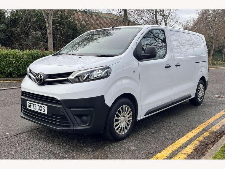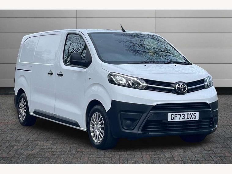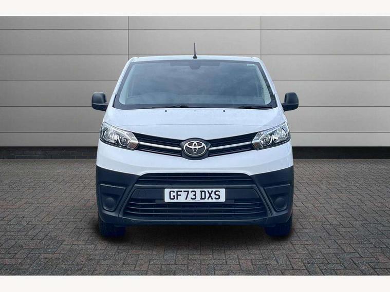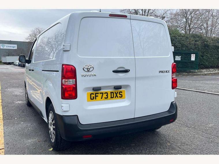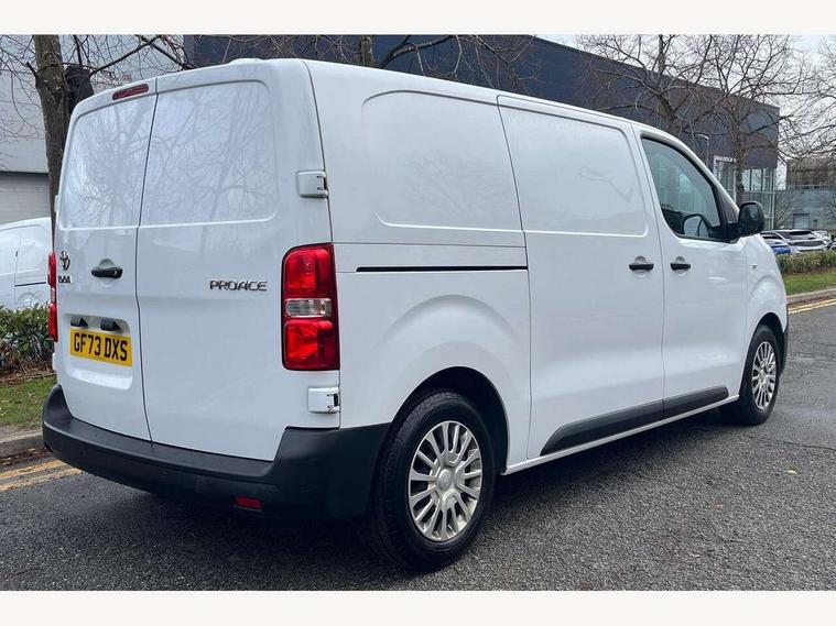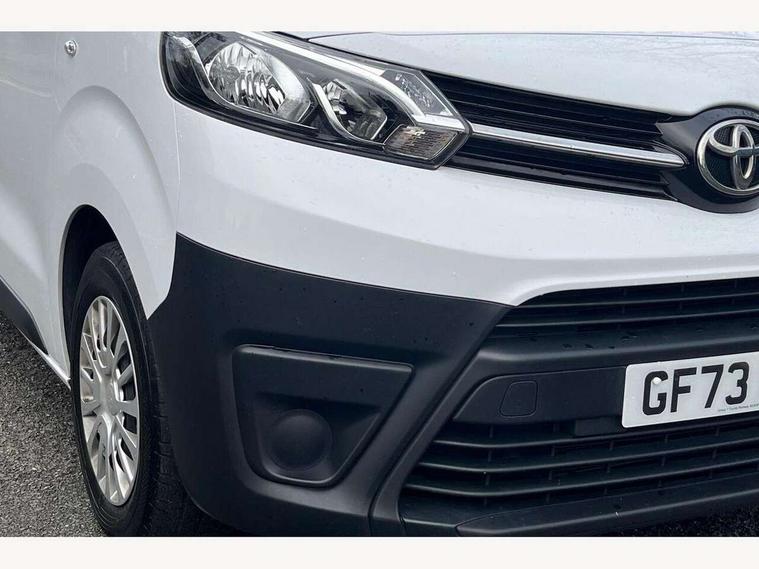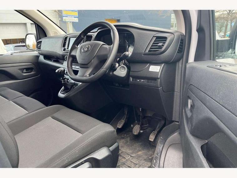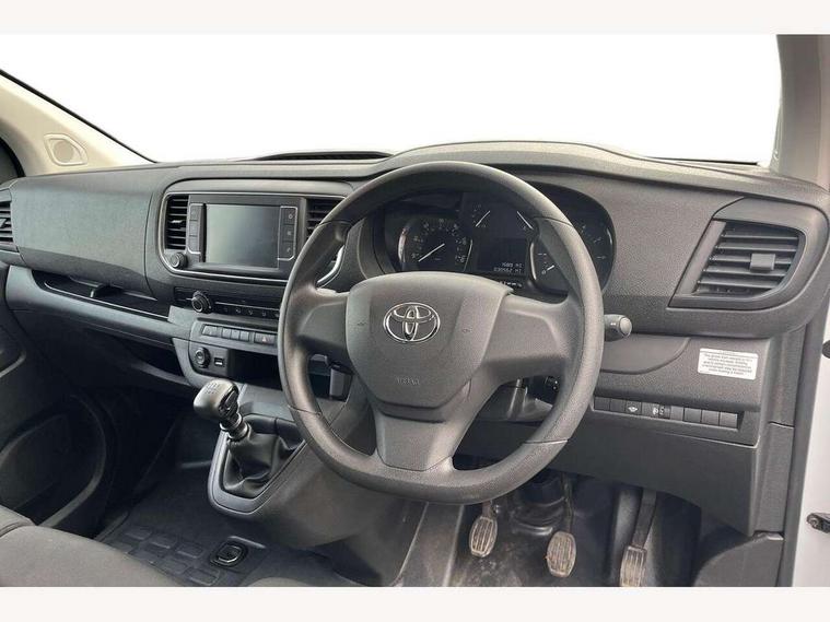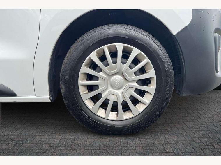 Bluetooth handsfree connectivity, Cruise control, PAS, Tyre pressure warning system (TPWS), 4 speakers, Digital radio (DAB), Radio/CD player, USB connector, 180 degree opening rear doors, Acoustic windscreen, Auto Headlights, Auto wipers, Black bumpers, Black door handles, Black protection moulding on side door, Body Coloured roof, Daytime running lights, Front power windows, Headlight cut-off reminder, Heated door mirrors, LED High mounted stop light, Manually adjustable day/night rear view mirror, Multi reflector halogen headlights, Panel rear wing doors, Power adjustable door mirrors, Rear combination lights, Short Antenna, Smoke tinted (30%) privacy glass on rear passenger window, Two manual sliding side doors, 2 seat front passenger bench, Driver seat armrest, Fabric seats, Front cup holders, Front room lights, Glovebox light, LED Driver and front passenger personal lights, Lighted and chilled upper glove box, Manually reclining and sliding driver and front passenger seats, Open upper dashboard storage compartment, Panel bulkhead with window and protective grille, Storage under passenger bench, Air conditioning and Smart cargo pack - Proace, Parking pack - Proace, Double front passenger airbag, Front passenger airbag on/off switch, Supplement restraint system (SRS) 2 airbags, Alarm, Deadlocks + 2 remote keys, Power door locks, 12V power front outlet, 12v socket in dashboard and rear, Adjustable speed limiter (ASL), Anti lock braking system (ABS), Brake Assist (BA), Stop/start function, Toyota traction select, Vehicle stability control (VSC) and hill start assist control (HAC), Full size spare wheel, Full wheel covers,