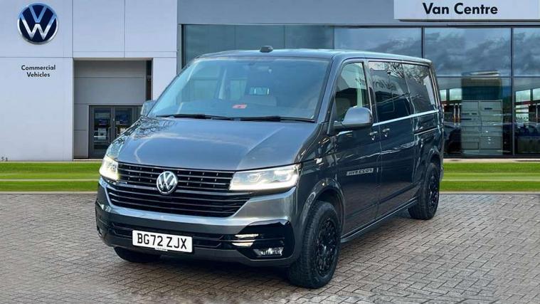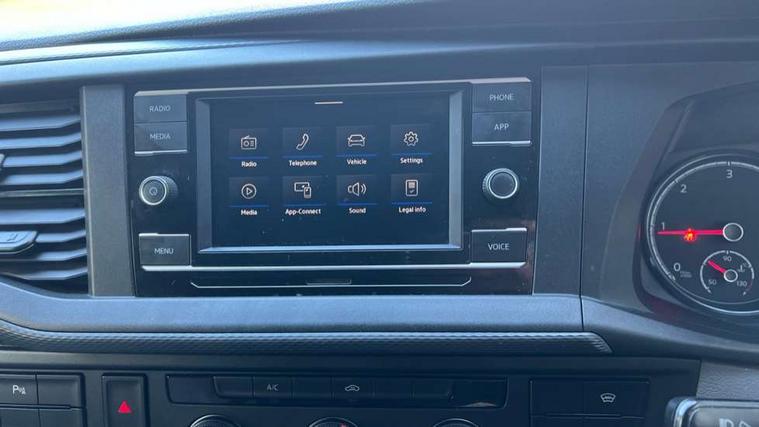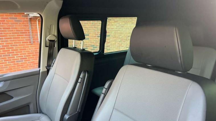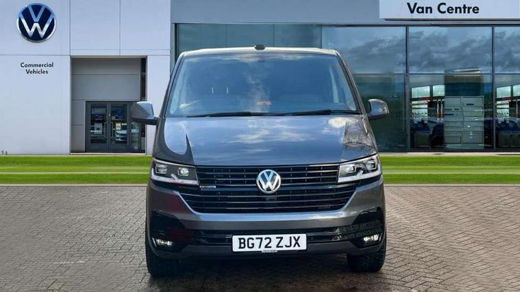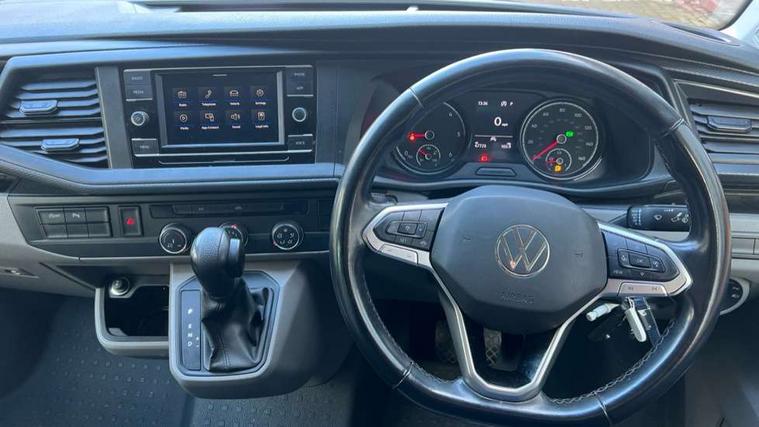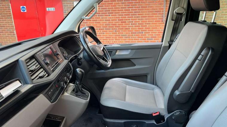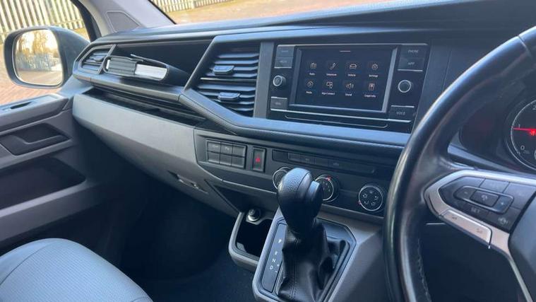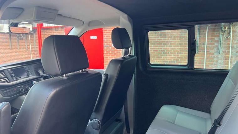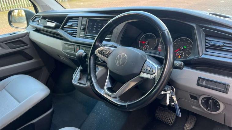 Adaptive cruise control, Child seat anchors ISOFIX and top tether in 2nd row of seats, Cross wind assist, Dimmable illuminated instruments, Driver alert with black and white multi function display plus, eCall emergency system, Forward collision warning front assist with autonomous emergency braking, Headlight range control, Mobile phone interface, Without voice control, 2 USB interfaces type C in dashboard, 4 speakers with 2 tweeters and 2 woofers, Composition colour radio with 6.5" touchscreen, Digital radio reception (DAB+), Volkswagen app connect, Automatic headlight control, leaving home and manual coming home feature, Front fog lamps with cornering light, Green heat insulating glass, Heated front windscreen, Illuminated steps in passenger/load compartment, Left convex exterior mirror, Power folding adjustable door mirrors with separately heated, Privacy glass from the B-pillar and heat-insulating glass in front, Radiator grille with 2 chrome trims, Rear window with heated insulating glass, heated rear window wiper and washer system, Right convex exterior mirror, Tailgate closing with unlatching from the inside, Transporter nameplate on the rear fender, Windshield wiper intermittent control with rain sensor for windshield wipers, Without adhesive film, 3 spoke leather wrapped multi function steering wheel, Additional sound deadening measures in cab and passenger compartment, Auto dimming breakaway interior rear view mirror, Comfort headliner in cab, hardboard roof trim in passenger and load compartment, Dust/pollen filter, Folding grab handles and storage compartments on cab seats, reading light, Front seats on the right in 1st row of seat, Glove compartment with illumination, Heavy duty tool kit and jack, Interior plastic loading edge protection, Lashing rings for load restraint system, LED Interior lighting in load and passenger compartment, Medium height for vehicles with window aperture hardboard side trim panels in passenger/load compartment, Refrigerant R134a, Standard lower part dashboard in palladium, Without partition, Without seats in 3rd row of seats, Comfort pack - Transporter, Exterior pack without fog light- Transporter, Light and vision pack - Transporter, Non smoker pack - Transporter, 3 point height adjustable seat belts on outer seats cab with electric pretensioners, Driver and front passenger airbag with front passenger airbag deactivation, Power operated child safety lock, Warning buzzer and light for driver seat belt not fastened, Anti theft alarm system with interior monitoring in cab, backup horn and towing protection, Lockable wheel bolts, 16" chassis with 16" brake system, Diesel particulate filter, Electronic stability control, ABS, ASR with deactivation button, hill start assist and brake assist system, Speed limiter, Start/stop system with regenerative breaking, 17" Devonport silver alloy wheels, Wheel trims,