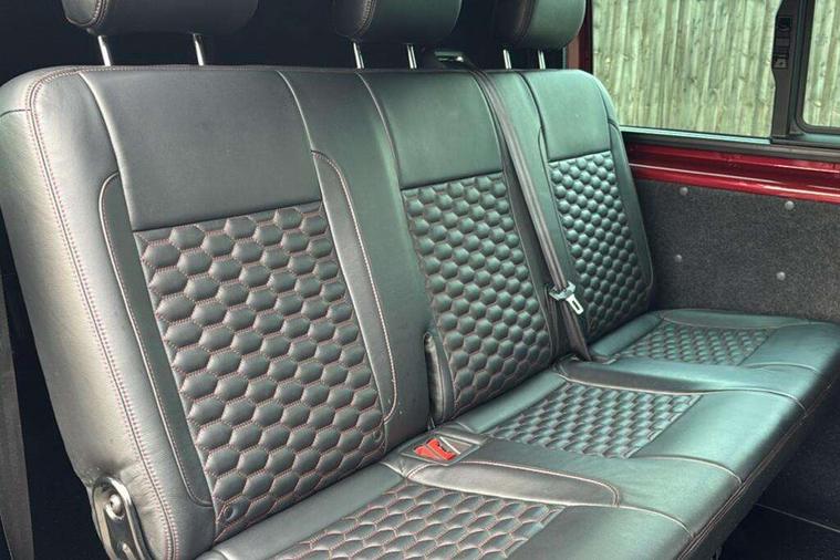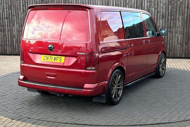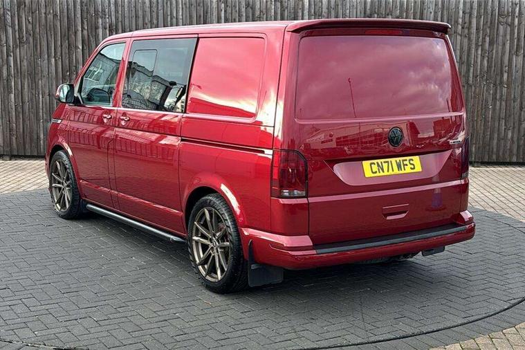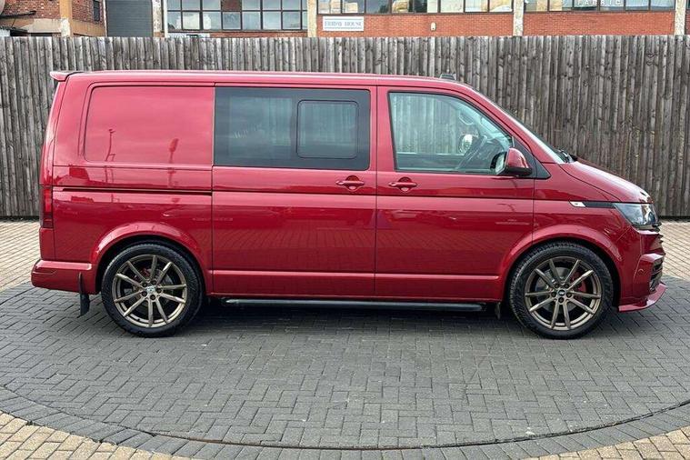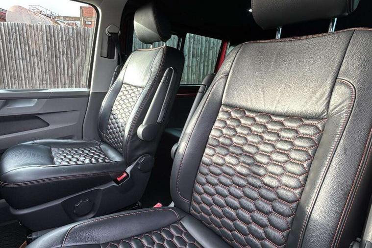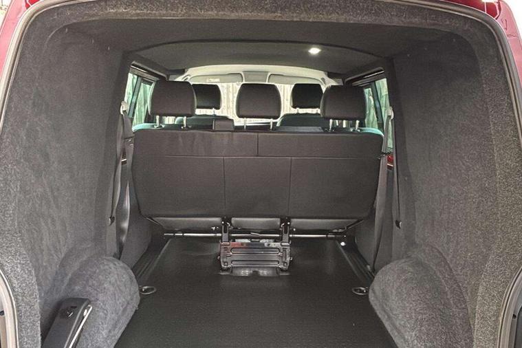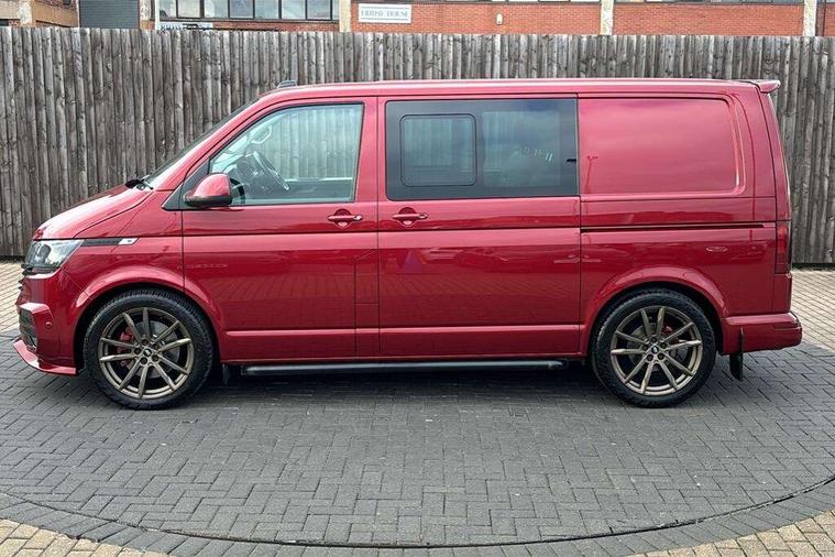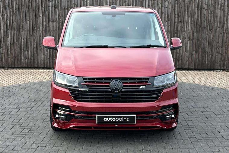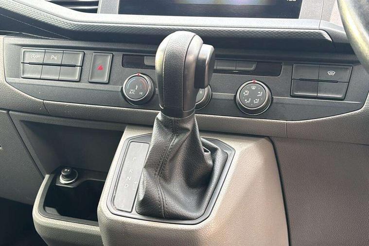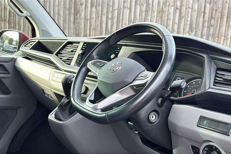 Adaptive cruise control, Child seat anchors ISOFIX and top tether in 2nd row of seats, Cross wind assist, Dimmable illuminated instruments, Driver alert with black and white multi function display plus, eCall emergency system, Electromechanical speed sensitive power steering, height and longitudinally adjustable steering column, Forward collision warning front assist with autonomous emergency braking, Headlight range control, Mobile phone interface, Without voice control, 2 USB interfaces type C in dashboard, 4 speakers with 2 tweeters and 2 woofers, Composition colour radio with 6.5" touchscreen, Digital radio reception (DAB+), Volkswagen app connect, Automatic headlight control, leaving home and manual coming home feature, Front fog lamps with cornering light, Green heat insulating glass, Heated front windscreen, Illuminated steps in passenger/load compartment, Left convex exterior mirror, Power adjustable and heated exterior mirrors, Power folding door mirrors, Privacy glass in passenger compartment, Radiator grille with 2 chrome trims, Rear window with heated insulating glass, heated rear window wiper and washer system, Right convex exterior mirror, Tailgate closing with unlatching from the inside, Tailgate with window aperture, Transporter nameplate on the rear fender, Windshield wiper intermittent control with rain sensor for windshield wipers, Without adhesive film, 3 spoke leather wrapped multi function steering wheel, Additional sound deadening measures in cab and passenger compartment, Auto dimming breakaway interior rear view mirror, Comfort headliner in cab, hardboard roof trim in passenger and load compartment, Dust/pollen filter, Folding grab handles and storage compartments on cab seats, reading light, Front seats on the right in 1st row of seat, Glove compartment with illumination, Heavy duty tool kit and jack, Interior plastic loading edge protection, Lashing rings for load restraint system, LED Interior lighting in load and passenger compartment, Medium height for vehicles with window aperture hardboard side trim panels in passenger/load compartment, Refrigerant R134a, Rubber floor covering in cab, Rubber floor covering in passenger/load compartment with loading edge protection in rear, Standard lower part dashboard in palladium, Without partition, Without seats in 3rd row of seats, Exterior pack without fog light- Transporter, Non smoker pack - Transporter, 3 point height adjustable seat belts on outer seats cab with electric pretensioners, Driver and front passenger airbag with front passenger airbag deactivation, Power operated child safety lock, Single tone horn, Warning buzzer and light for driver seat belt not fastened, Anti theft alarm system with interior monitoring in cab, backup horn and towing protection, Lockable wheel bolts, 16" chassis with 16" brake system, 70 L volume fuel tank, Additional 12V socket, Diesel particulate filter, Electronic stability control, ABS, ASR with deactivation button, hill start assist and brake assist system, Speed limiter, Start/stop system with regenerative breaking, 17" Devonport silver alloy wheels, Wheel trims,