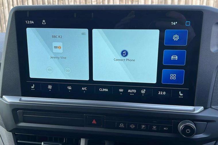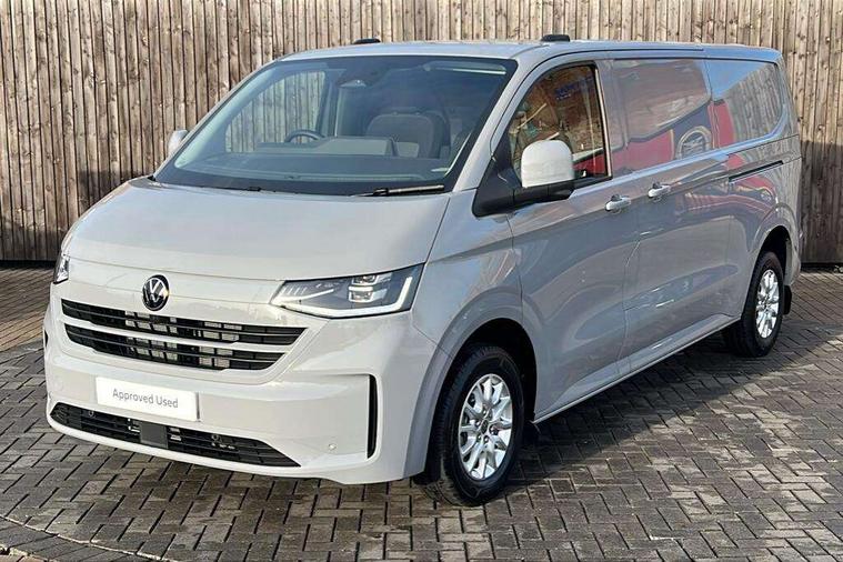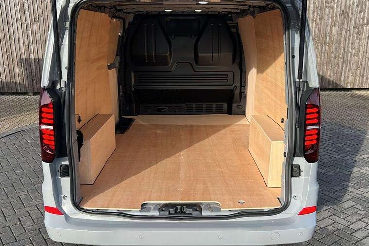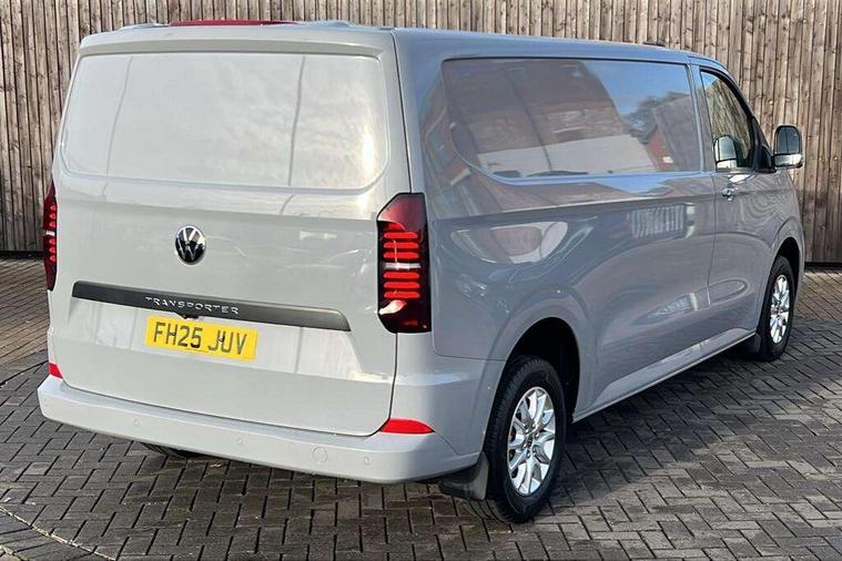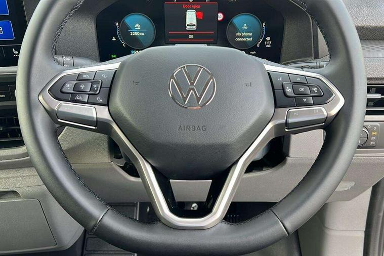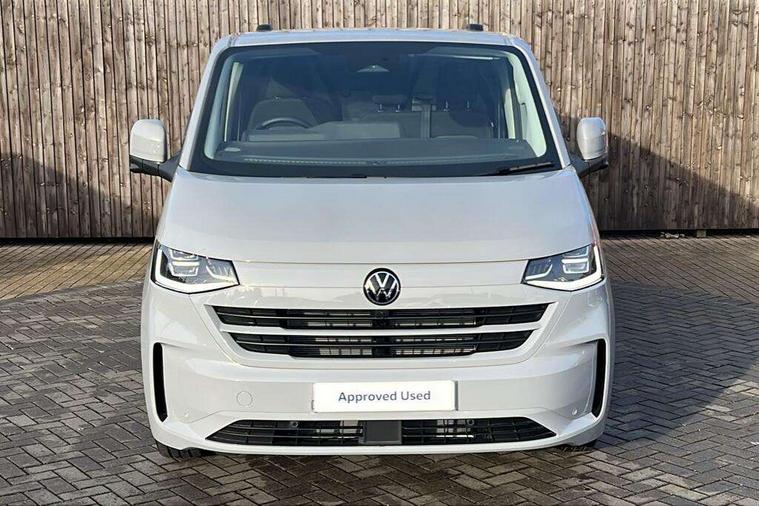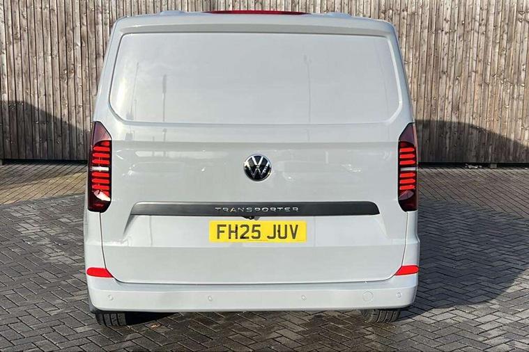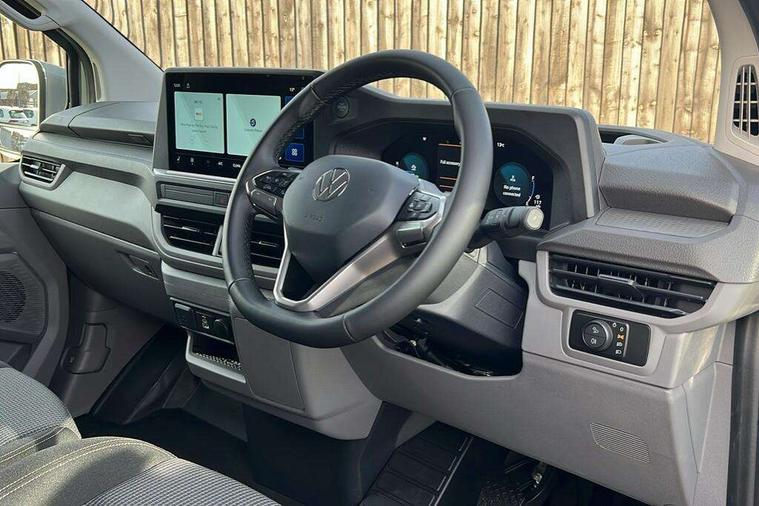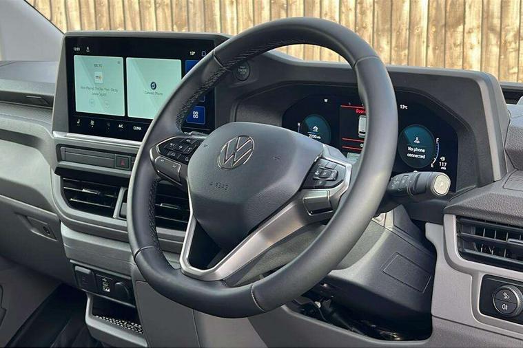 12" digital drivers display, 13" touchscreen infotainment display with wireless app connect and DAB radio, 5G Modem, Adaptive cruise control, Apple CarPlay and Android Auto, Dynamic road sign display, eCall emergency system, Electromechanical speed sensitive power steering, height and longitudinally adjustable steering column, Lane and blind spot assist with exit warning system, Preparation of VW connect and connect plus, Traffic jam assist, Wireless mobile phone charging, Wrong way driver warning, Body colour bumpers, Body coloured door handles, Body coloured door mirrors, Body coloured radiator grille, Electrically heated, adjustable and folding door mirrors, Heat reflecting side window glass, Mud flaps front and rear, Rear Transporter nameplate in black grained decorative trim, Vehicle opening configuration 1x 1st row of seats, 2x all doors, 12V outlet in centre console and 12V outlet on rear right D-pillar, 2x 15-W USB data/charging ports in dashboard and 1x USB-C, 1x USB-A center bottom, 2x LED lights in load compartment, 3x additional super bright LED lights in load compartment, 4 way height and tilt adjustable head restraints, 5 additional USB-C charging ports, Black plastic scuff plate for sliding door in cargo without illumination, Cabin interior lighting, Gear selector lever on steering wheel, Glasses compartment in driver side roof, Grab handle on A-pillar passenger side, Illuminated lockable glovebox, Lashing rings for reinforced floor covering, Narrow centre console with cup holder and compartment for mobile phone, Overhead storage compartment, Rubber floor covering in cab, Striped fabric upholstery, Without passenger seats in load compartment, Driver and front passenger airbag with front passenger airbag deactivation, Dual tone horn, Front and curtain airbags for driver and front passenger, Seat belt pretensioner for driver seat, Anti theft alarm system with interior monitoring in cab, backup horn and towing protection, Electronic immobiliser, Lockable wheel bolts, Preparation for alcohol ignition interlock, 5+ Promise, Alternator - 230A, Electromechanical brake booster, Electronic stability control, ABS, ASR with deactivation button, hill start assist and brake assist system,