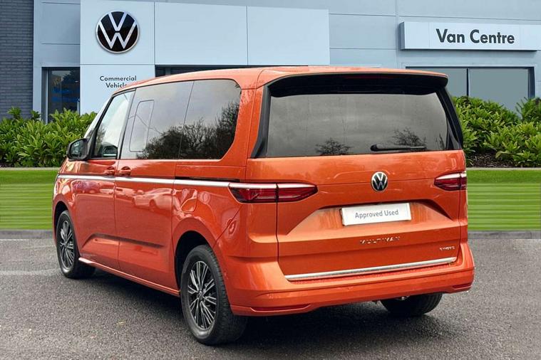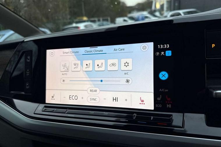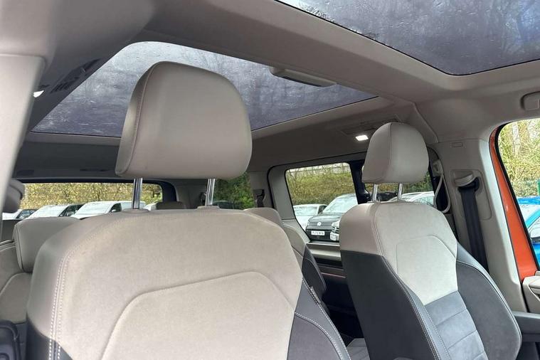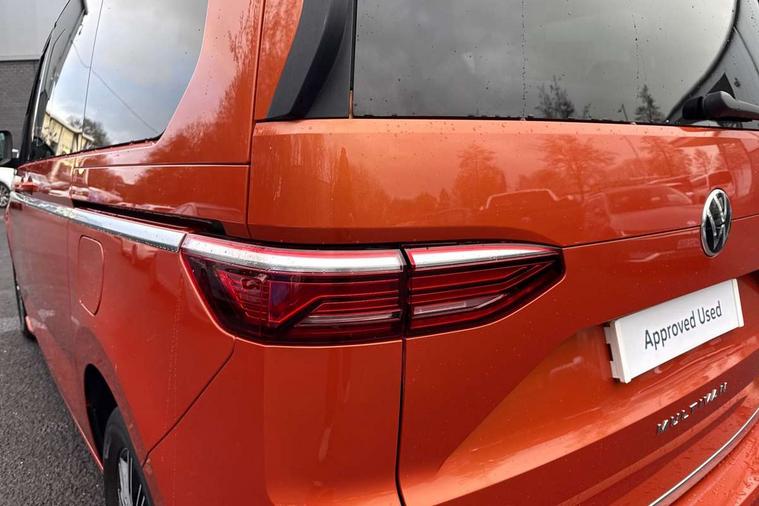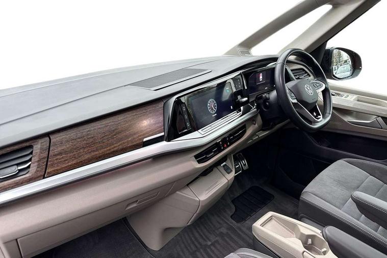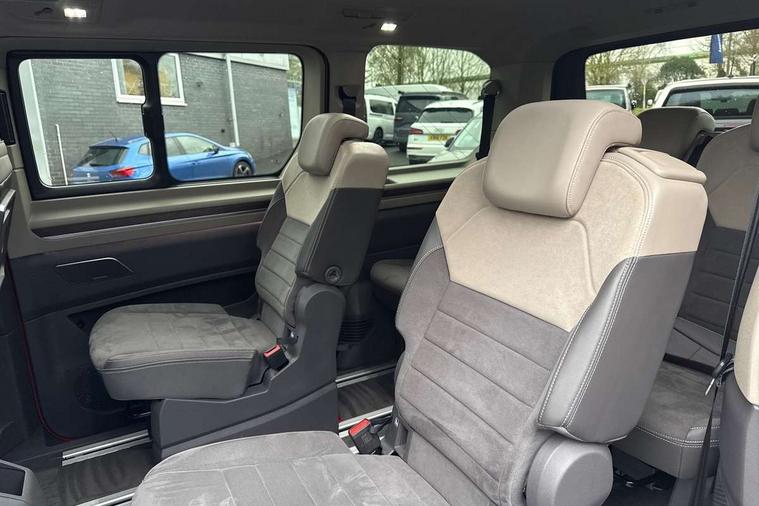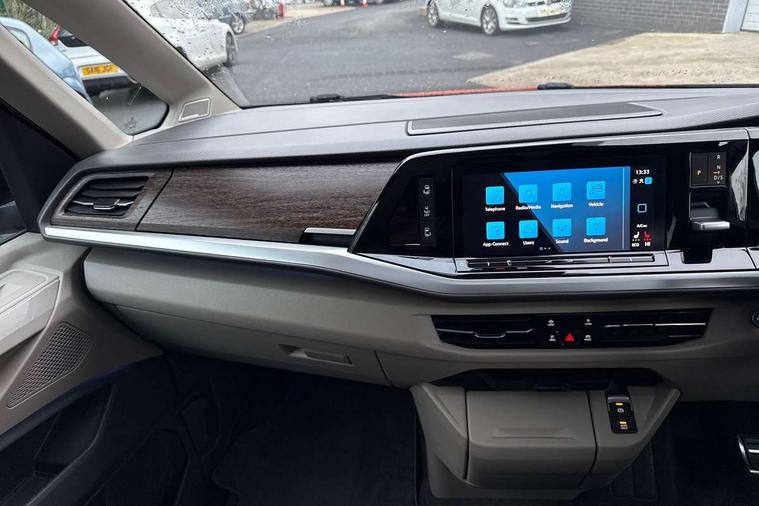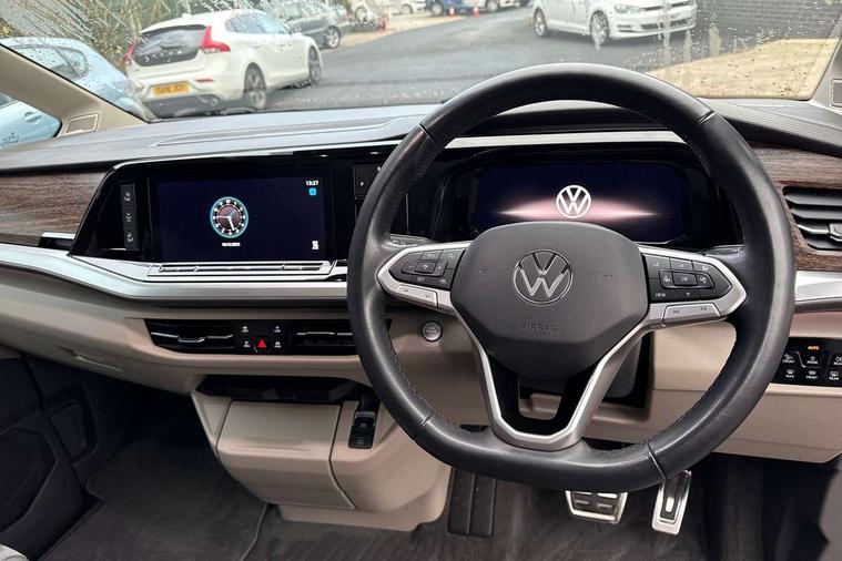 Adaptive cruise control with C2X including front assist and city emergency braking system, App-Connect incl. App-Connect Wireless for Apple CarPlay and Android Auto, Digital Cockpit Pro with 10.25" Display, Driver alert system, Dynamic road sign display, eCall emergency system, Electric tailgate with virtual pedal, Electrically-operated tailgate opening and closing function (Easy open), operated via foot movement under rear tailgate, Emergency assist, Lane keeping system Lane Assist, Mobile phone interface, PAS, Semi-automated driving assistance, Socket AC Type 2, Travel assist, Voice control system including Alexa web app, We connect preparation, 1 x 6 metre charging cables - 16amp AC cable for wallbox chargepoints (mode 3), Electronic differential lock, 2 USB-C ports in front and 4 USB-C ports in passenger compartment, Digital radio reception (DAB+), Additional interior noise reduction measures, Advanced high beam control dynamic light assist for LED matrix headlamps, Automatic headlight control with welcome home lights, Body coloured exterior door handles, Break away auto dimming rear view interior mirror, Chrome trim decorative strip mid-way on side and rear, Dynamic headlight range control with dynamic cornering light, Electric sliding rear side door on the left/right with easy open feature, Electrically adjustable, heated and folding door mirrors, Front fog lights, Glossy black painted radiator grille with 2 illuminated chrome trims, Heated rear window with window wiper and washer system, Heated windscreen, High gloss black exterior mirror housing, IQ.Light LED matrix headlamps with LED separate daytime running light, Laminated safety glass windshield, heat and sound insulating, LED 3rd brake lamp, LED rear combination lamps, Rear wiper, Sliding windows in front sliding doors and fixed rear windows, Stainless steel tailgate trim, Surround lighting in door area and tailgate with logo projection in door area, Windshield wiper intermittent control with rain sensor, 1 x 12V sockets on the dash panel, 12V socket in passenger compartment, 3 seat bench in 3rd row, 30 colours ambient interior lighting and tailgate surround lighting, 7 single seats removable/movable, Carpet mats in cab, Climatronic 3 zone air conditioning with 2nd evaporator, auxiliary heater, air conditioned headliner and additional passenger control, Front and rear head restraints, Grab handles on A pillar for access, on driver and front passenger side, Heated steering wheel, Height adjustable seats, Height and longitudinal adjustment steering wheel with gear shift paddles, Illumination lockable glovebox compartment, ISOFIX (including i-size) and top tether in all seats in 2nd and 3rd rows, LED luggage compartment lighting X 2, Load compartment partition to 20kg with bag hooks and luggage net, Luggage compartment lid power latching with unlatching from inside, Multifunction leather steering wheel with tiptronic, Reinforced carpet floor covering in passenger compartment, Removable armrests for front seats with power adjustable lumbar support and folding table for 2nd row passenger seats, Removable armrests in 2nd row passenger seats, Single front passenger seat, Slidable multifunction table/centre console with 3 cup holders, Stainless steel pedals, Storage compartment under the 2nd and 3rd row seat and two waste bins, Sun visors with illuminated vanity mirrors and airbag warning label on front passenger sun visors, 3x3 point rear seat belts, ABS, Automatic post collision braking system, Autonomous emergency braking front assist with pedestrian and cyclist monitoring, Driver and front passenger airbag with front passenger airbag deactivation, Electric childproof lock, Electronic stability control (ESC) and Electromechanical brake booster, ESP, First aid kit with warning triangle and safety vest, Front disc brakes, Hill hold assist, Seat belt warning for the drivers and all passengers seats if unfastened, Side and curtain airbags for driver and front passenger, curtain airbags for outer seats in rear, centre airbag in front, Single tone horn, Traction control, Tyre pressure monitoring system, Anti theft alarm system with interior monitoring in cab, backup horn and towing protection, Central locking system keyless entry with touch two stage unlocking, Start/stop button on centre console, Dark woodgrain optic decorative inserts,
