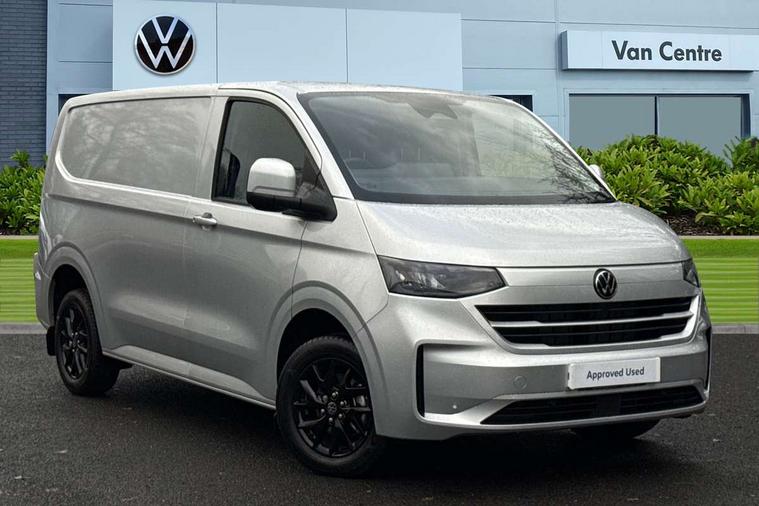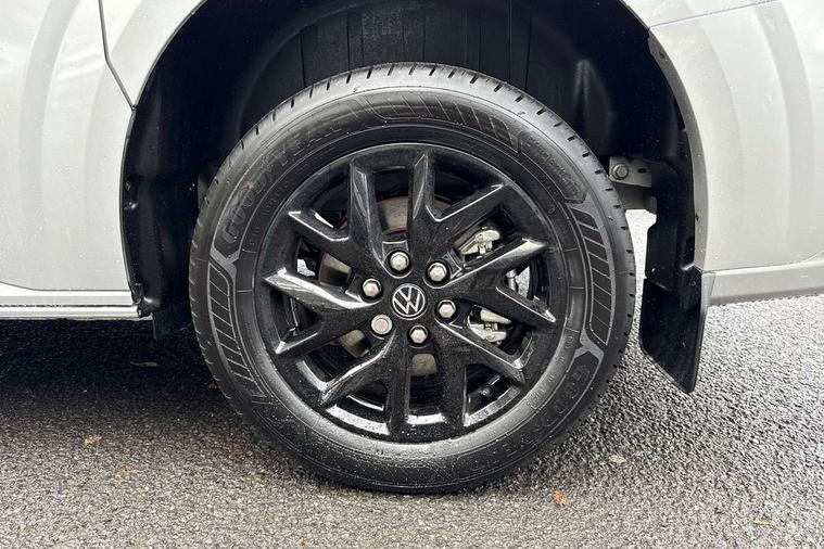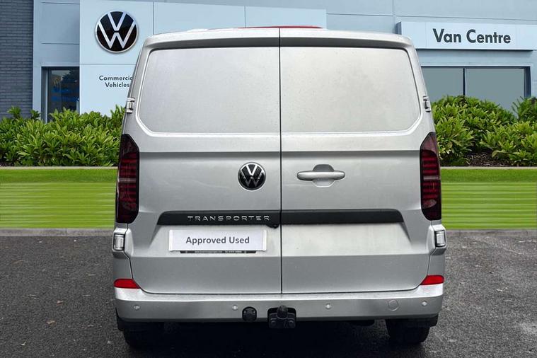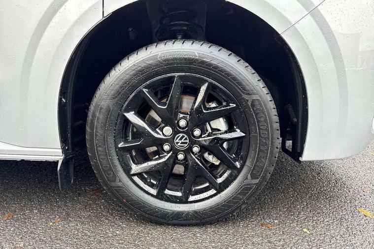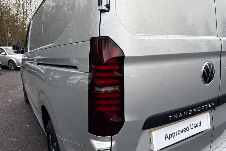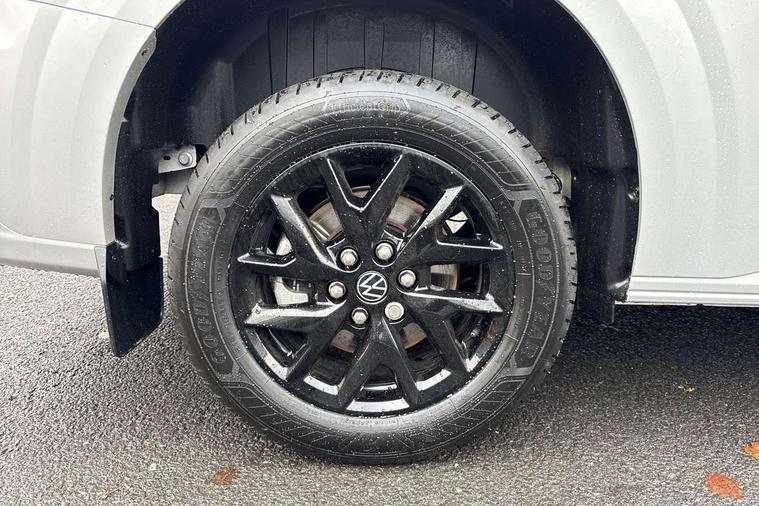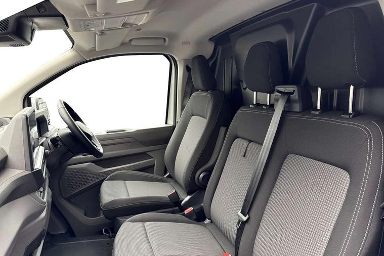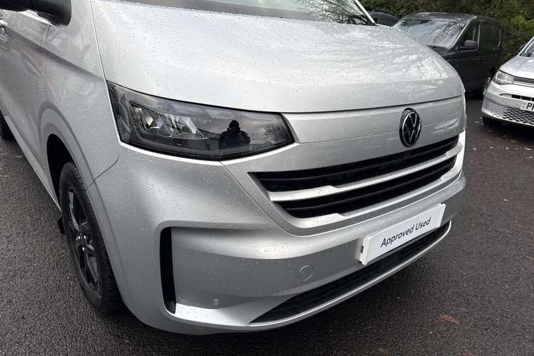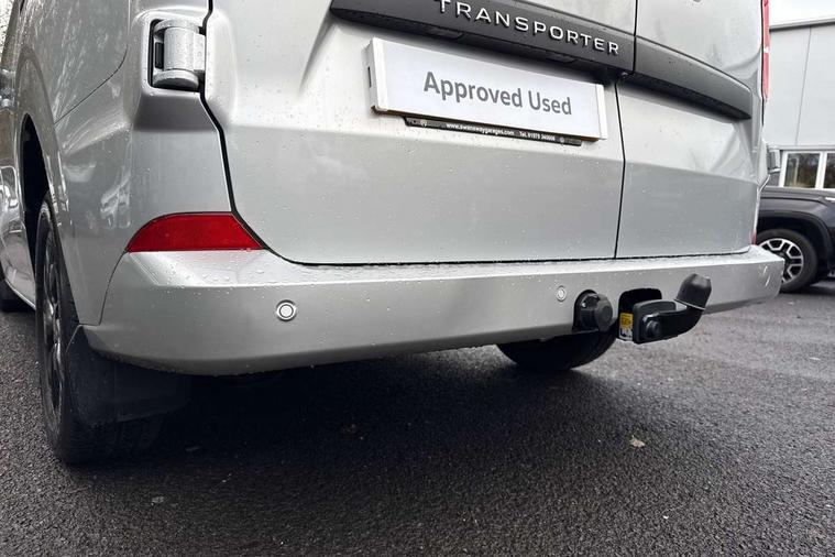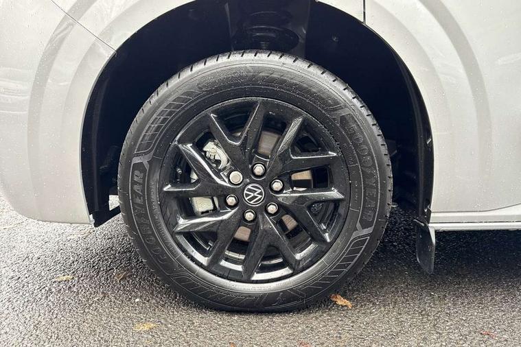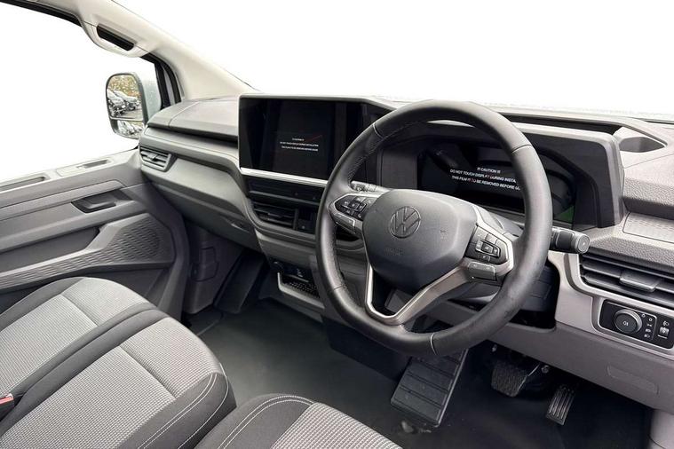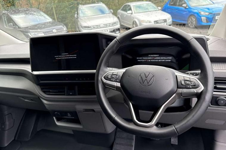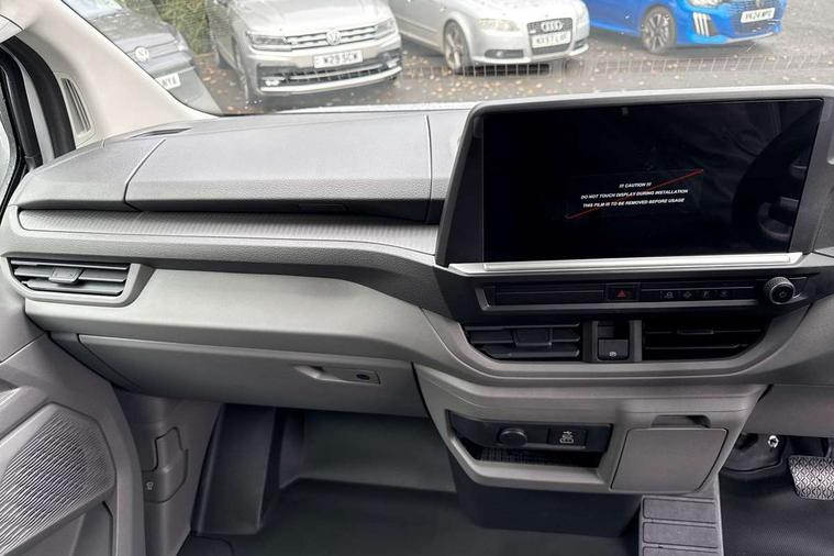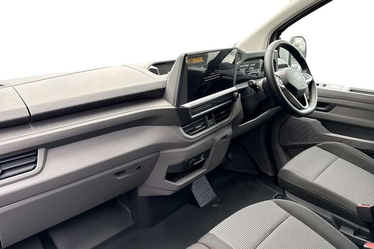 12" digital drivers display, 13" touchscreen infotainment display with wireless app connect and DAB radio, 5G Modem, Adaptive cruise control, Apple CarPlay and Android Auto, Dynamic road sign display, eCall emergency system, Electromechanical speed sensitive power steering, height and longitudinally adjustable steering column, Lane and blind spot assist with exit warning system, Preparation of VW connect and connect plus, Traffic jam assist, Wireless mobile phone charging, Wrong way driver warning, Body colour bumpers, Body coloured door handles, Body coloured door mirrors, Body coloured radiator grille, Electrically heated, adjustable and folding door mirrors, Heat reflecting side window glass, Mud flaps front and rear, Rear Transporter nameplate in black grained decorative trim, Vehicle opening configuration 1x 1st row of seats, 2x all doors, 12V outlet in centre console and 12V outlet on rear right D-pillar, 2x 15-W USB data/charging ports in dashboard and 1x USB-C, 1x USB-A center bottom, 2x LED lights in load compartment, 3x additional super bright LED lights in load compartment, 4 way height and tilt adjustable head restraints, 5 additional USB-C charging ports, Black plastic scuff plate for sliding door in cargo without illumination, Cabin interior lighting, Gear selector lever on steering wheel, Glasses compartment in driver side roof, Grab handle on A-pillar passenger side, Illuminated lockable glovebox, Lashing rings for reinforced floor covering, Narrow centre console with cup holder and compartment for mobile phone, Overhead storage compartment, Rubber floor covering in cab, Striped fabric upholstery, Without passenger seats in load compartment, Driver and front passenger airbag with front passenger airbag deactivation, Dual tone horn, Front and curtain airbags for driver and front passenger, Seat belt pretensioner for driver seat, Anti theft alarm system with interior monitoring in cab, backup horn and towing protection, Electronic immobiliser, Lockable wheel bolts, Preparation for alcohol ignition interlock, 5+ Promise, Alternator - 230A, Electromechanical brake booster, Electronic stability control, ABS, ASR with deactivation button, hill start assist and brake assist system,