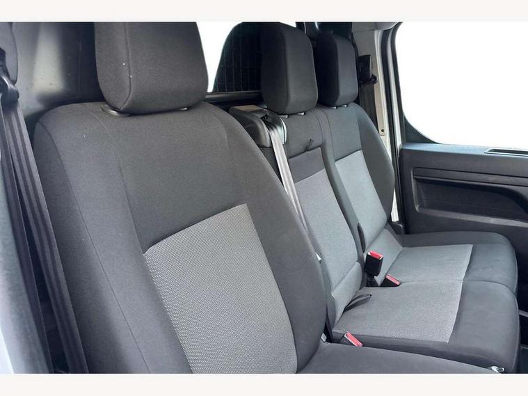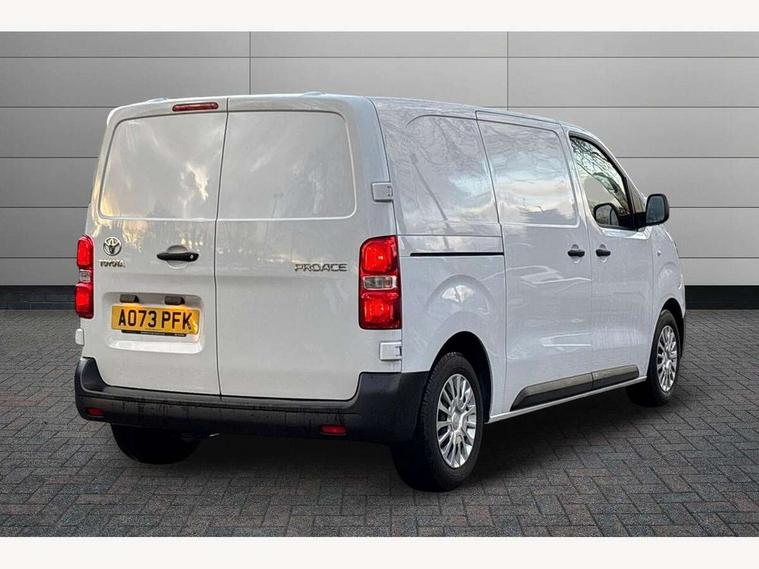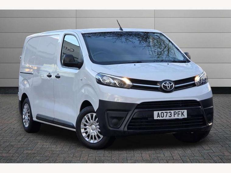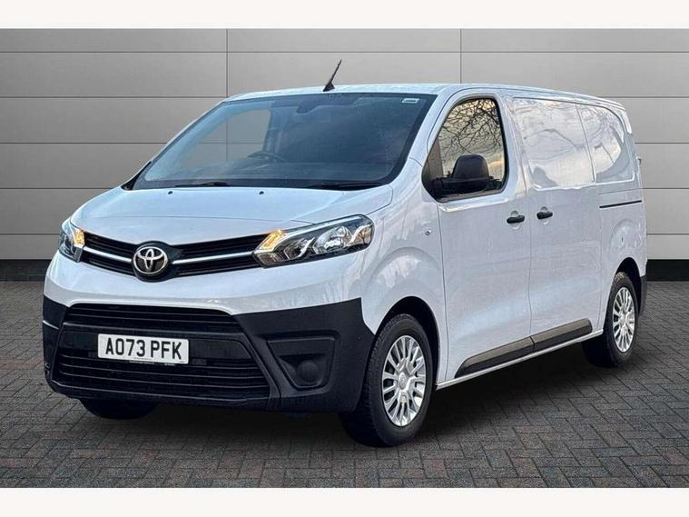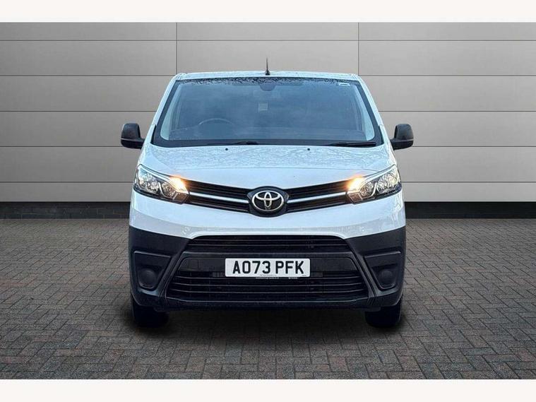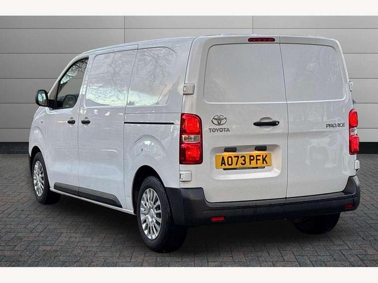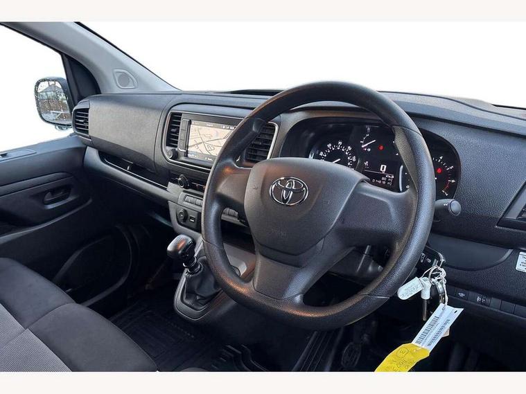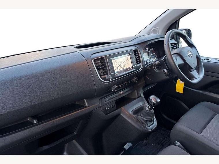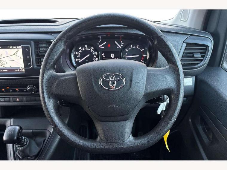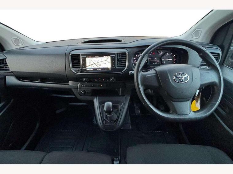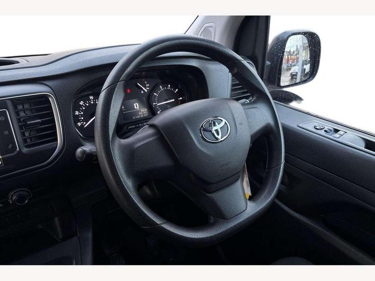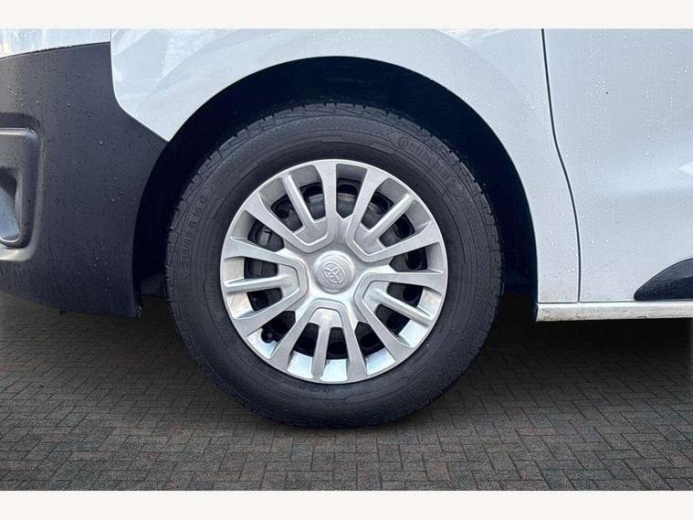 Bluetooth handsfree connectivity, Cruise control, PAS, Tyre pressure warning system (TPWS), 4 speakers, Digital radio (DAB), Radio/CD player, USB connector, 180 degree opening rear doors, Acoustic windscreen, Auto Headlights, Auto wipers, Black bumpers, Black door handles, Black protection moulding on side door, Body Coloured roof, Daytime running lights, Front power windows, Headlight cut-off reminder, Heated door mirrors, LED High mounted stop light, Manually adjustable day/night rear view mirror, Multi reflector halogen headlights, Panel rear wing doors, Power adjustable door mirrors, Rear combination lights, Short Antenna, Smoke tinted (30%) privacy glass on rear passenger window, Two manual sliding side doors, 2 seat front passenger bench, Driver seat armrest, Fabric seats, Front cup holders, Front room lights, Glovebox light, LED Driver and front passenger personal lights, Lighted and chilled upper glove box, Manually reclining and sliding driver and front passenger seats, Open upper dashboard storage compartment, Panel bulkhead with window and protective grille, Storage under passenger bench, Air conditioning and Smart cargo pack - Proace, Parking pack - Proace, Double front passenger airbag, Front passenger airbag on/off switch, Supplement restraint system (SRS) 2 airbags, Alarm, Deadlocks + 2 remote keys, Power door locks, 12V power front outlet, 12v socket in dashboard and rear, Adjustable speed limiter (ASL), Anti lock braking system (ABS), Brake Assist (BA), Stop/start function, Toyota traction select, Vehicle stability control (VSC) and hill start assist control (HAC), Full size spare wheel, Full wheel covers,