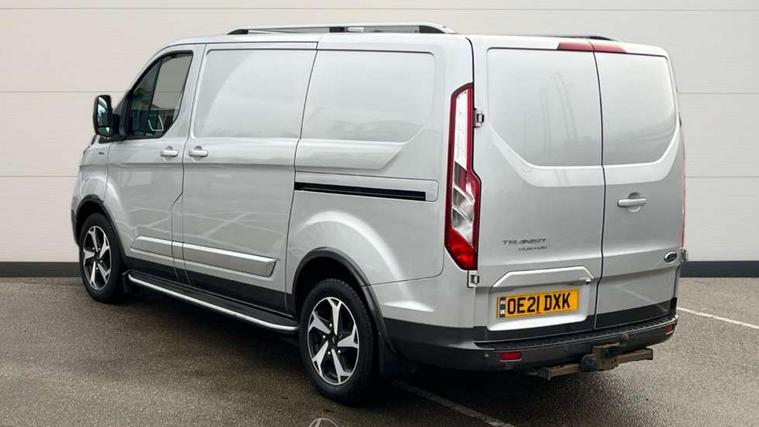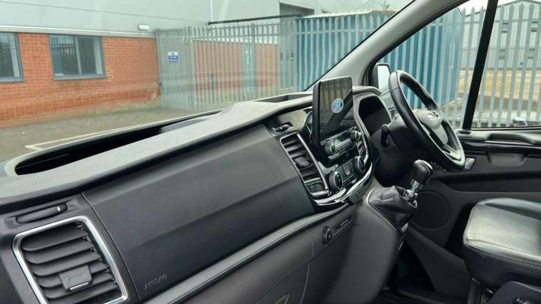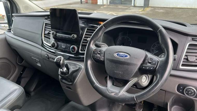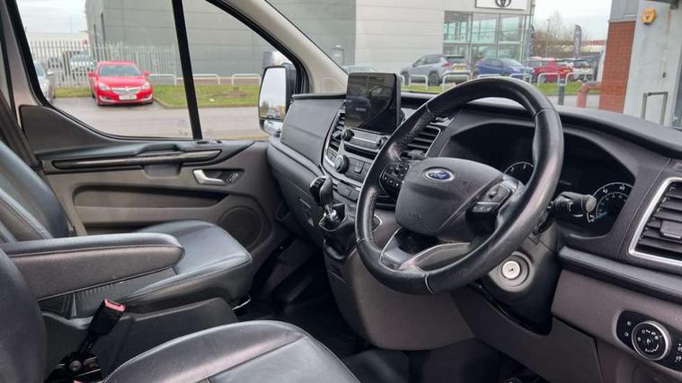 Easy fuel capless refuelling system, Embedded modem, Ford Eco mode, PAS, Seatbelt warning indicator, Selectable drive mode, Vehicle maintenance monitor, Audio controls mounted on steering wheel, 180 Degree rear cargo check arms, Accent colour exterior mirror finish, Body coloured body side mouldings, Colour keyed grille with satin nickel insert, Door open tyre carrier drop, Electric front windows with one touch facility for driver and front passenger, Emergency brake light flashing, Extended length running board dual side, Front bumper with body colour lower accent, Front splash guards/Mud flaps, Headlamp levelling, Intermittent front wash/wipe, Passenger side sliding load door with track cover, Rear door edge warn reflectors, Rear mudflaps, Rear splash guards, Silver roof rails, Tutone painted plastic rear bumper, Unique active style front grille, Wide bodyside grey mouldings, 2 Interior grab handles, Assist handle, Complete rear trim board, Courtesy light, Driver and passenger sunvisors with illuminated vanity mirrors, Easy clean load floor, Front manual air conditioning, Full width unglazed steel bulkhead with through load hatch, Header mounted package tray, Height adjustable front headrests, Illuminated footwell, Leather gearshift knob, LED load compartment light, Lockable glove box, Map reading lights, Moulded cab floor liner, Part leather upholstery, Partial molded headliner, Partial rubber inside floor cover, Passenger underseat storage box, Reach and rake adjustable steering column, Recirculation heater, Sunglasses roof storage, Tool kit, Colour keyed exterior pack 4 - transist custom, Front seat pack 8A - Transit Custom, Less rear seat pack - Transit Custom, 3 point seatbelts for all seats, Driver's airbag, Dual note electric horn, Front outer passenger airbag with deactivation switch, Height adjustable drivers seatbelt mount, Passenger seatbelt height adj, Seatbelt remainder for driver and passenger, Auto locking on drive-away, Auto relocking, Configurable Unlocking, Power door dead locks, Remote central locking, Speed dependent power lock group, Thatcham category 1 alarm with 2nd remote key, 2 12v sockets, 80 litre fuel tank, ABS, Auto start/stop system, Diesel particulate filter, ESP, Extra heavy duty alternator, Mechanical parking brake, Roll stability control, Side wind mitigation, Standard duty suspension, 17" 5 spoke mach alloy wheels contains 17" mini steel spare wheel and locking wheel lug nut, Full wheelcovers,