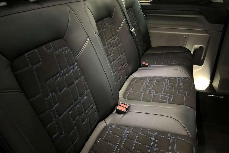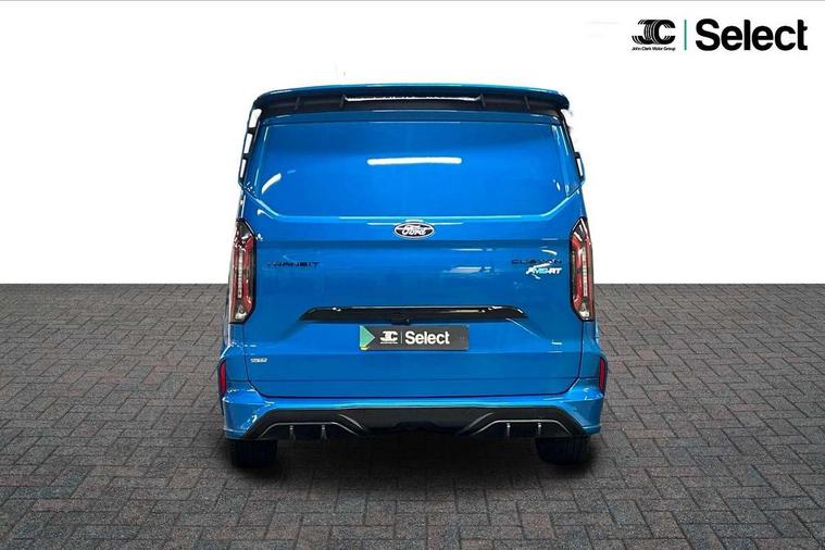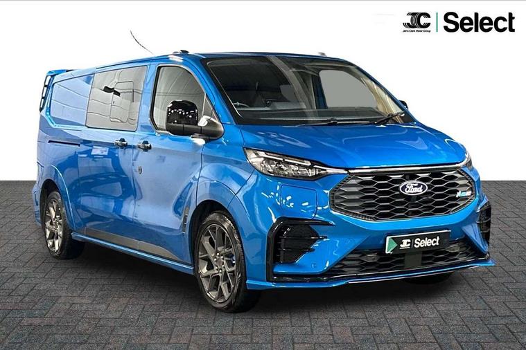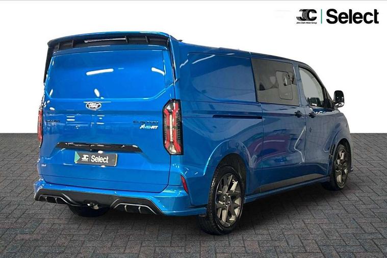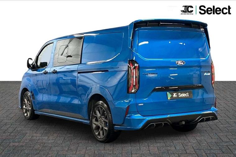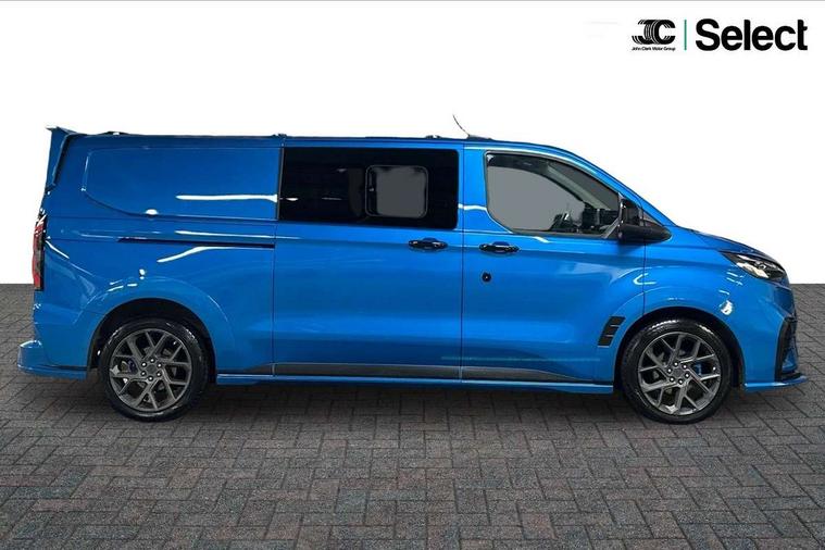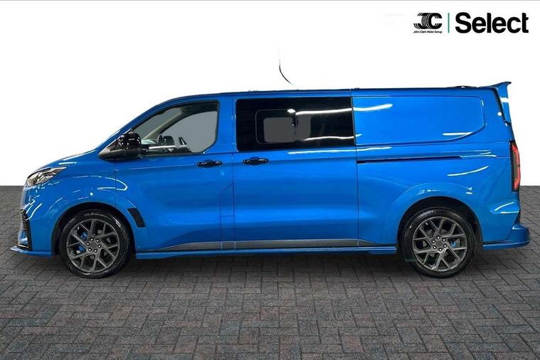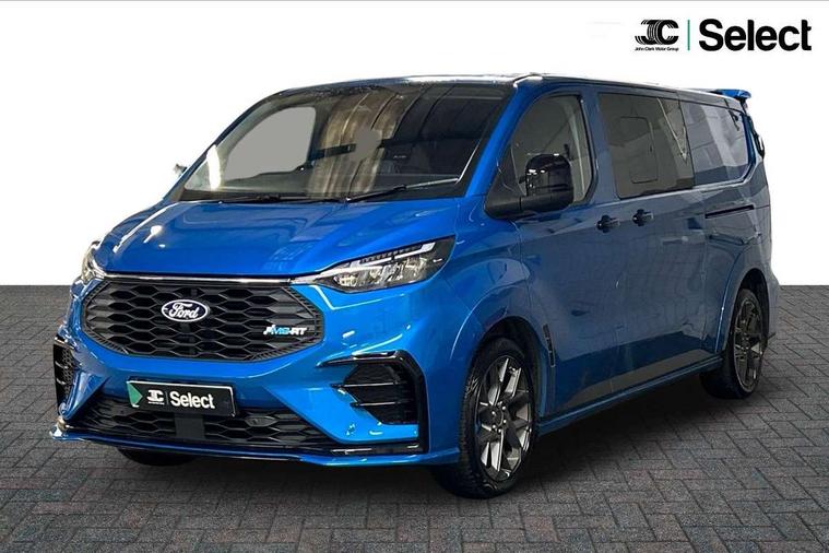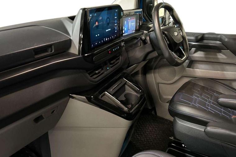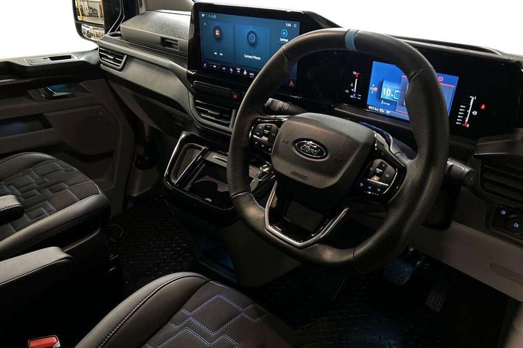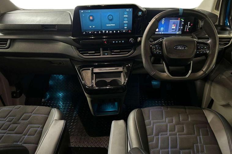 13" Touchscreen, 5G embedded modem, AECS NO SMS/Roll Detect 2G, Close Assist, PAS, Rear USB charge port, Tyre pressure monitor, Wireless charging, SYNC 4 - Android Auto/Apple Car Play, advance speech recognition, over the air update capability, Aggressive and aerodynamic front bumper with integrated splitter, Automatic headlights, Body coloured front bumper, Body coloured rear bumpers, Daytime running lights, Dual heated auto fold power exterior mirror, Dual side load doors, Electric front windows with one touch facility for driver and front passenger, Fixed DSS LED headlamps with auto high headlamp, Flip open second row windows, Gloss Black door handles, Gloss black door mirrors, Hood Accent Stripes, LED tail lamps, Low roof line, Lowered sports side skirts, Molded load floor liner, Motorsport inspired rear split design spoiler, Power cinch latch, Privacy glass, Quickclear front window defroster, Rear cargo hinged door, Sports rear quarter and rear bumper with integrated diffuser with exhaust tip, Sun blinds, Trailer sway control, 3 Seat Rear seats with under seat stowage, 6 Load compartment tie down loops, Ambient interior lighting, Carpet floor in first row and rubber in second row, Courtesy light, DCiV Moulded polymer bulkhead, Dual zone automatic air conditioning, Fixed sensico heated steering wheel, Half height polypro interior trim panels, Heated steering wheel, Interior grab handle with driver's sunglasses holder, Large console, LED lights, Locking glove box lid, Rear reading light, Sensico gearshift knob, Sportier look bolster and foam seat backs, Sports steering wheel with 12 o clock blue marker and MS-RT inlay, Super bright load compartment lights, Cab as office pack - Transit custom, Driver assistance pack 2 - Transit custom, Premium non animal eco leather single passenger seat pack - Transit custom MS-RT, Passenger airbag, 2 remote keys, Alcohol Interlock wiring preparation pack, Keyless entry and start, Locking wheel lug nut, 63 litre fuel tank, ABS, Brake callipers painted in MS-RT Blue, Electric brake boost, ESP, Hill launch assist, Traction control, 16" Steel spare wheel, 19" Multi-Spoke MS-RT Alloy Wheel in Carbonised grey, Full wheelcovers,
