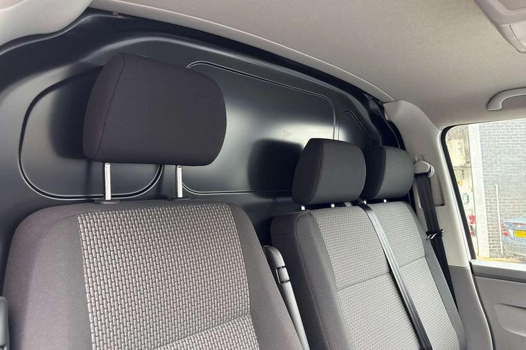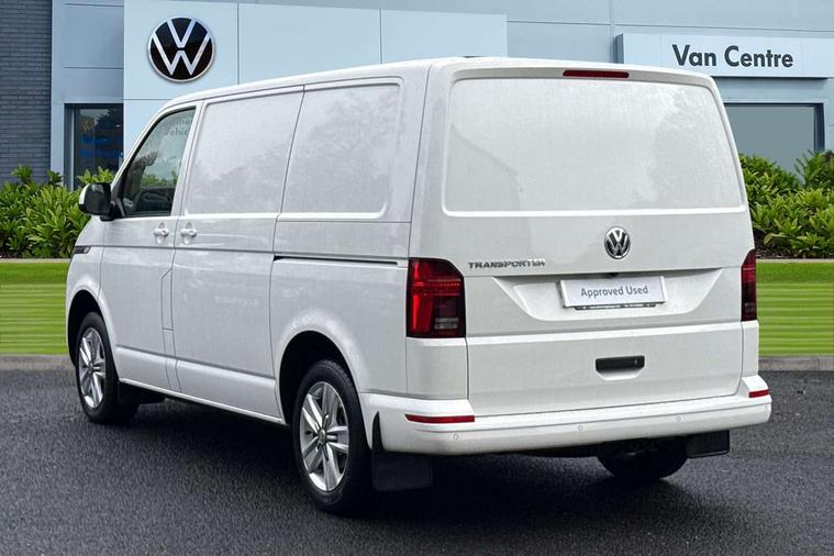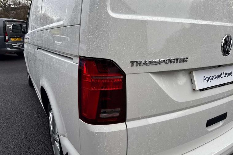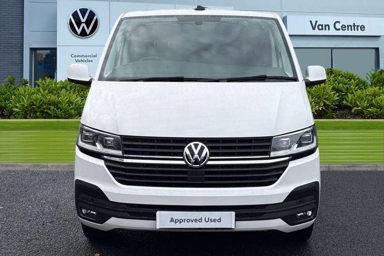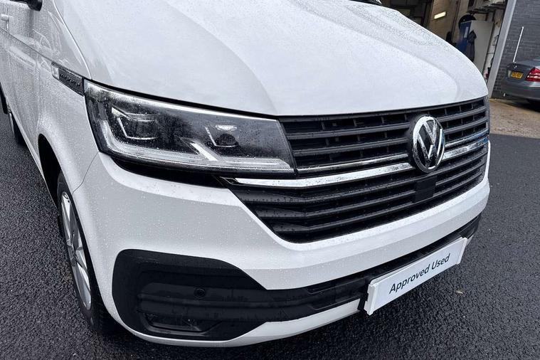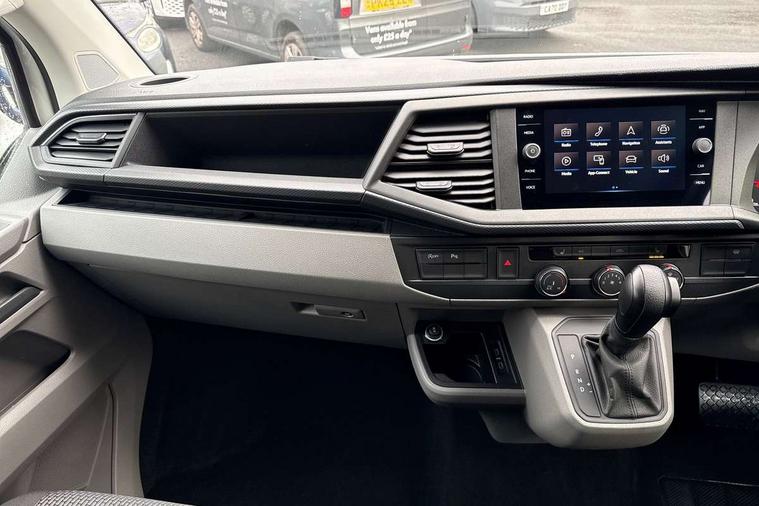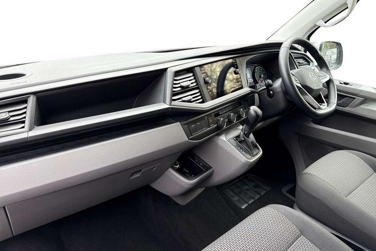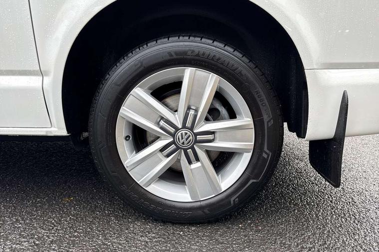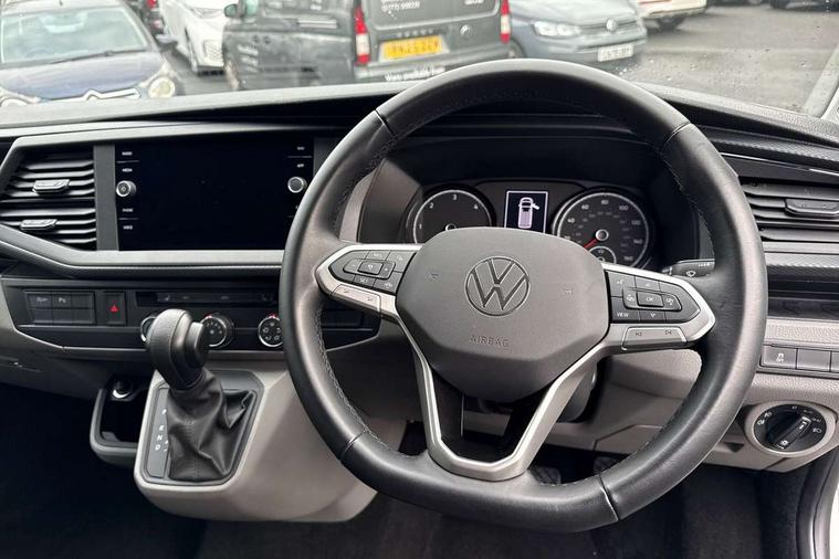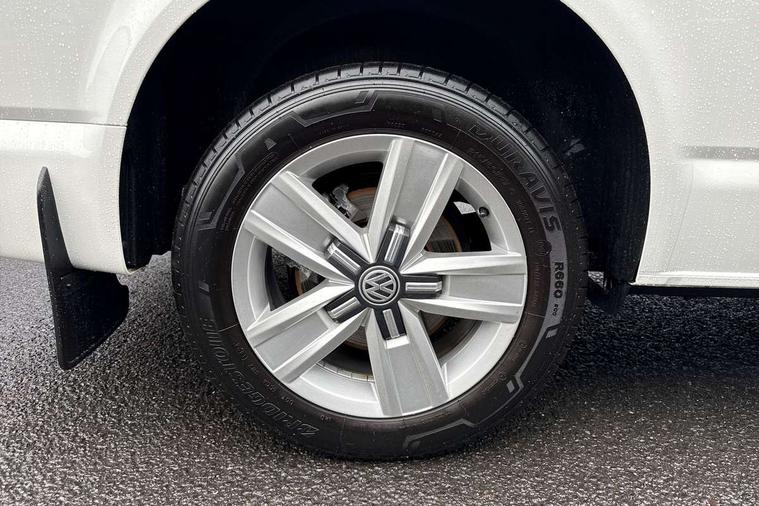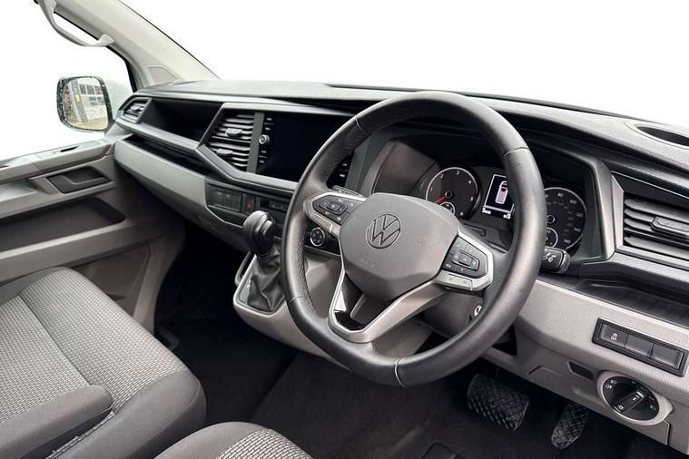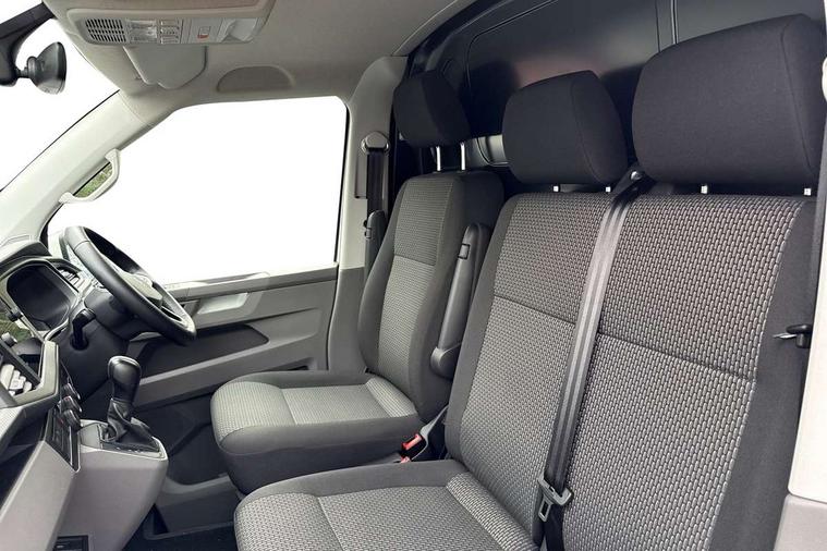 Adaptive cruise control, Cross wind assist, Dimmable illuminated instruments, Driver alert with Multi-function display plus, eCall emergency system, Forward collision warning front assist with autonomous emergency braking, Mobile phone interface, Multi function display plus with black and white display, 2 USB interfaces type C in dashboard, 4 speakers with 2 tweeters and 2 woofers, Composition colour radio with 6.5" touchscreen, Digital radio reception (DAB+), Volkswagen app connect, Closing rear wing door with unlatching from the inside, Front fog lamps with cornering light, Heat insulating glass (green) in cab and passenger/load compartment, Heated front windscreen, Left convex exterior mirror, Power folding adjustable door mirrors with separately heated, Radiator grille with 2 chrome trims, Rear wing doors without window apertures, Right convex exterior mirror, Transporter nameplate on the rear fender, 3 spoke leather wrapped multi function steering wheel, Comfort headliner in cab, hardboard roof trim in passenger and load compartment, Dust/pollen filter, Front and rear left without window closed side panel in load compartment, Front seats on the right in 1st row of seat, Heavy duty tool kit and jack, High partition, Interior plastic loading edge protection, LED Interior lighting in load and passenger compartment, Refrigerant R134a, Standard lower part dashboard in palladium, Storage compartments on cab seats and reading light, Without right side window apertures in passenger and load compartment, Comfort pack - Transporter, Exterior pack without fog light- Transporter, Light and vision pack - Transporter, Non smoker pack - Transporter, 3 point height adjustable seat belts on outer seats cab with electric pretensioners, Driver and front passenger airbag with front passenger airbag deactivation, Warning buzzer and light for driver and front passenger seat belt not fastened, Without child safety lock in passenger compartment, Anti theft alarm system with interior monitoring in cab, backup horn and towing protection, Lockable wheel bolts, 16" chassis with 16" brake system, Diesel particulate filter, Electronic stability control, ABS, ASR with deactivation button, hill start assist and brake assist system, Start/stop system with regenerative breaking, 17" Devonport alloy wheels,