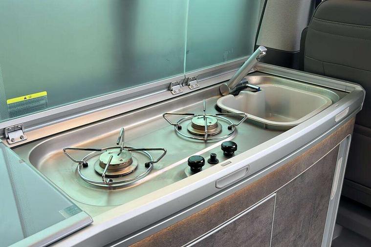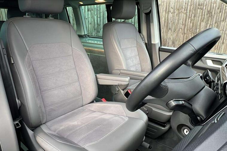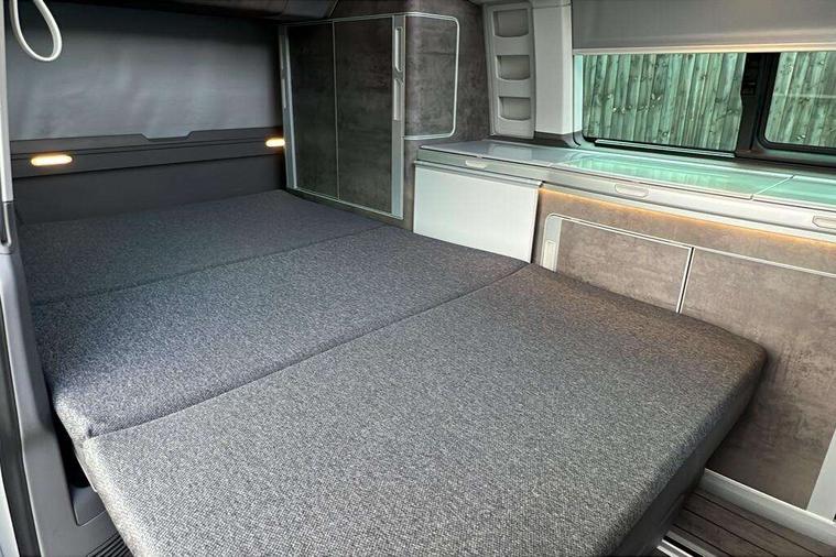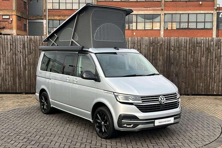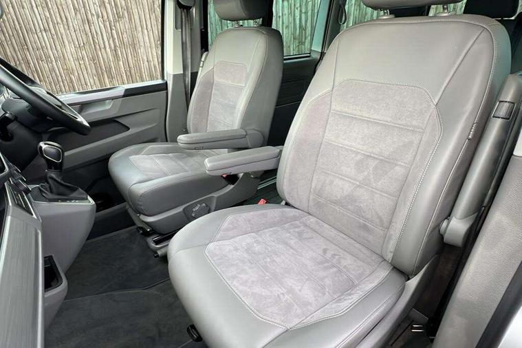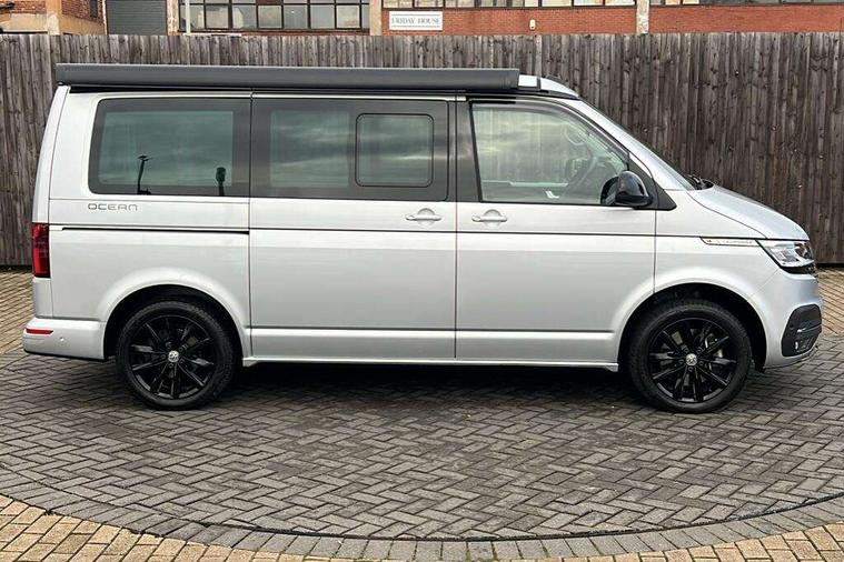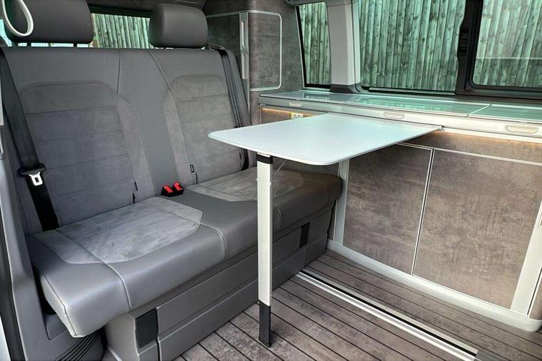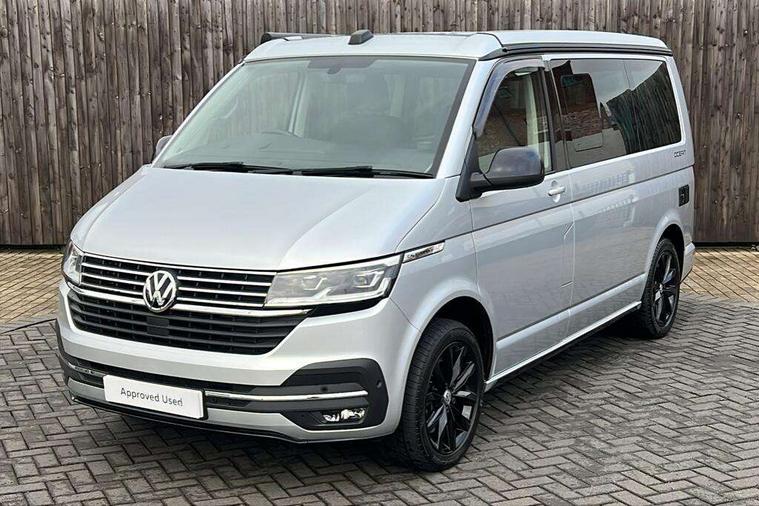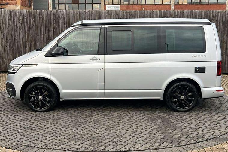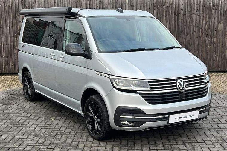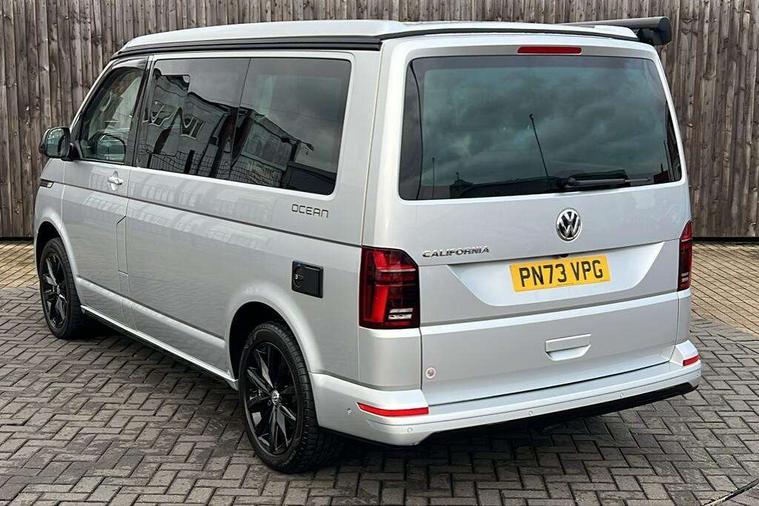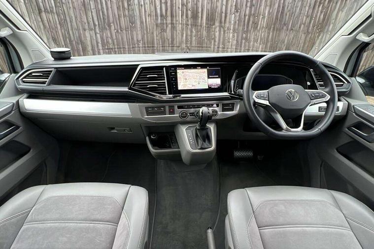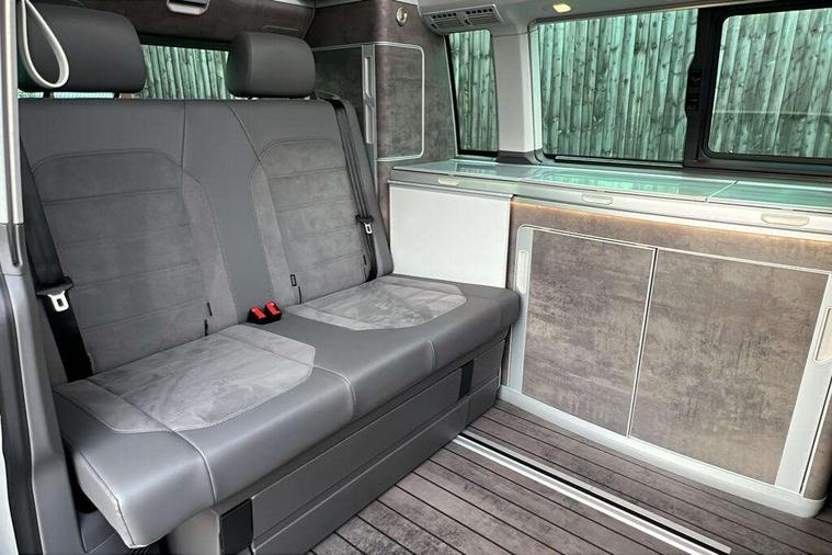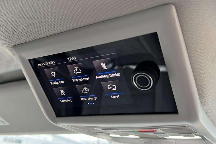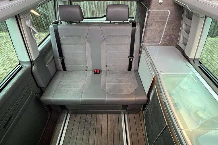 8" touch screen, Adaptive cruise control with speed limiter and city emergency braking, Cross wind assist, Digital cockpit and driver alert system, eCall emergency system, Lane assist with side assist, Mobile phone interface, Navigation system preparation, Service interval indicator, Speed limiter, Start/stop system with regenerative braking, Tailgate latch without unlocking function from inside, Tailgate with window aperture and with power latching, Voice control system, Wired and wireless app connect, 17 inch chassis with 17 inch disc brakes in front and 16 inch disc brake in rear, 2 additional batteries with free maintanace including 1 additional battery with cut-off relay, 2 (type C) USB interfaces in dashboard, 8 speakers (4 tweeters + 4 woofers), Digital radio reception (DAB+), Regional code ECE for radio, Additional dust seals on the outside, Automatic headlight range control, Body colour bumpers, Body coloured door handles, Body coloured door mirrors, California badge on the front wing and on the rear, California nameplate on the fender and on the rear, Electrically adjustable, heated, folding exterior mirrors, Electrohydrolic operated pop up roof with 3 windows and 1 front aperture, Front fog lights with cornering function, Heat insulating cab side windows, passenger compartment side windows tinted and with double glazing, Heated washer nozzles in front and washer fluid level indicator, High level 3rd brake light, LED headlamps with LED separate daytime running light, Left convex exterior mirror, Mounting rails on the roof (preparation for movable roof rack), Privacy glass with heat insulation, Radiator grille painted in black with 5 chrome trims, additional chrome trim at lower radiator grille, Rear boot, Rear wardrobe with hanging rail and mirror, Rear window with insulating glass, rear window wiper and washer system, Right convex exterior mirror, Sliding window in front with fly screen and fixed window in rear in load passenger compartment left, Sliding window in front with fly screen and fixed window in rear in load passenger compartment right, Without left sliding door in load/passenger compartment, 1 waste bin in door storage compartment of the cab, 12V outlets in dashboard X 2, 2 velour floor mats, 2-seater bench/bed, movable along rail system and folds down into a two person bed, 230V inlet with charging feature for vehicle batteries and 230V outlet in the interior, 3 spoke leather wrapped multifunction steering wheel, Allergen filter, Armrest for both cab seats, Camping table for inside/outside in sliding door and 2 folding chairs in tailgate, Child seat anchors ISOFIX and top tether for Multivan/California in 2nd to 4th row of seats, Climatronic 3 zone air conditioning with 2nd evaporator, auxiliary heater, air conditioned headliner and additional passenger control, Dimmable illuminated instruments, Electromechanical speed sensitive power steering, height and longitudinally adjustable steering column, Front head restraints, Fully functional kitchen with gas hob, sink and 42 litre compressor cool box, Glove compartment with illumination, Grab handles on A pillar for access, on driver and front passenger side, Heated driver and front passenger seats, Illuminated steps in passenger/load compartment, Illuminated sun visors with mirror and airbag label on front passenger sun visor, Interior light concept for camper with comfort in passenger compartment incl additional LED light in the pop up roof for the loft bed, in the tailgate, Interior loading edge protection in plastic, Jack and tool kit, Manually adjustable lumbar supports for left and right single seat in the 1st row of seats, Operating voltage 12V including 230V outlet on driver seat, Plastic floor covering in passenger/load compartment, Programmable parking heater with radio remote control and auxiliary heater, Rear head restraints, Refrigerant R1234yf, Roof bed (2000 x 1200 mm) with spring plates and mattress, Soft folding grab handles on roof frame, Special interior noise suppression measures, Special sound deadening measures in cab and passenger compartment, Step illumination with California lettering, Swivel seat on the left, with lumbar support in 1st row of seats, Swivel seat on the right, with lumbar support in 1st row of seats, Waeco compressor fridge, Waste water storage tank with lockable external filler cap and electric pump, Without height adjustment for driver and single passenger seats, Lights and vision pack - California Ocean, Smokers pack - California, Airbags - Drivers and front passengers side and curtain airbags, Driver/Front Passenger airbags, Electronic stability control, ABS, ASR, EDL, brake assist system, Height adjustable 3 point seat belts on outer seats in cab with electric pretensioners, Hill start assist, Passenger airbag deactivation system, Power operated child safety locks, Single tone horn, Warning buzzer and light for driver seat belt not fastened, Anti theft alarm system with interior monitoring in cab, backup horn and towing protection, Central locking system with radio remote control, system controls inside and safelock, Lockable wheel bolts, Comfort dashboard lower part in palladium with chrome elements and bezels painted in black,