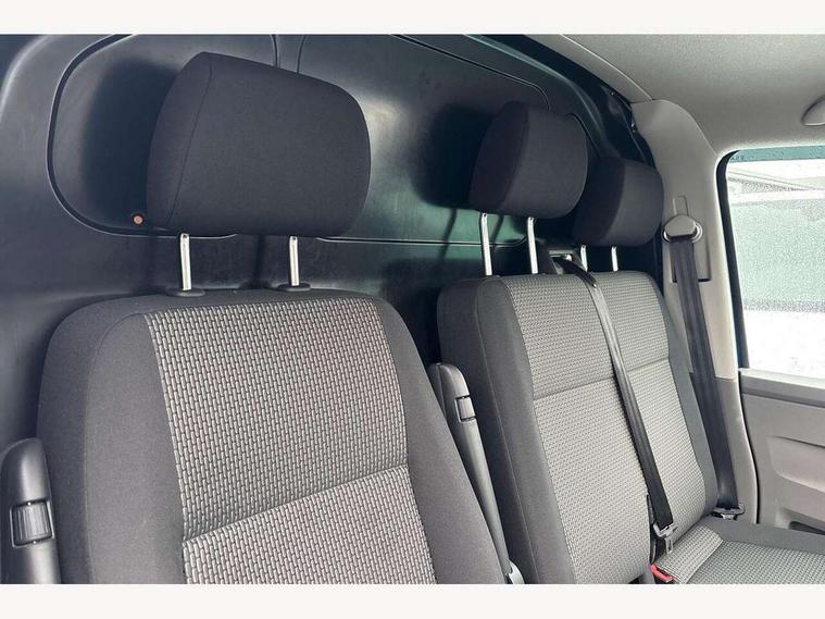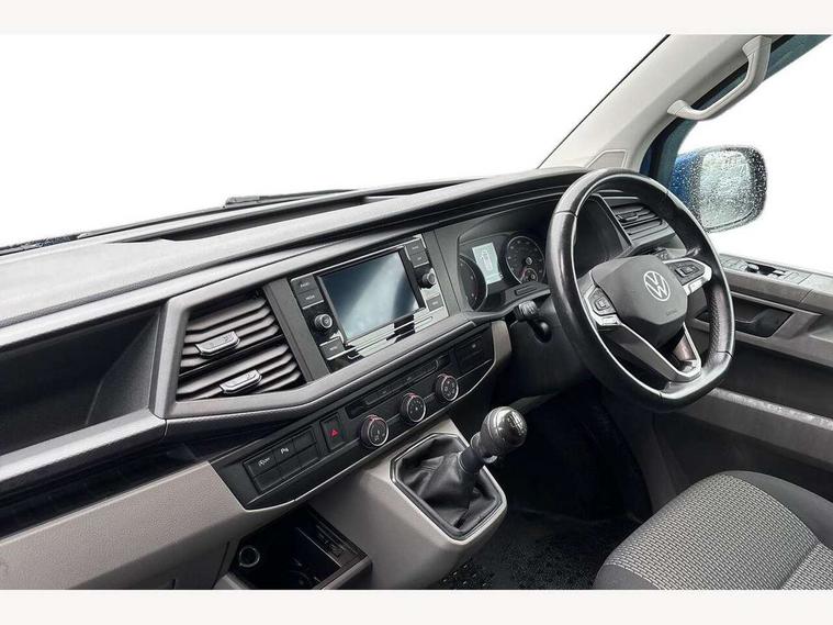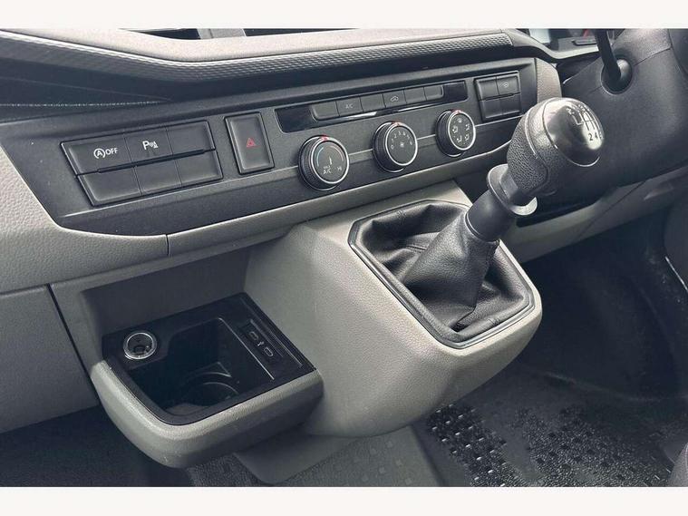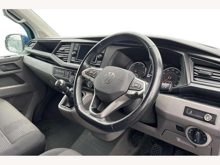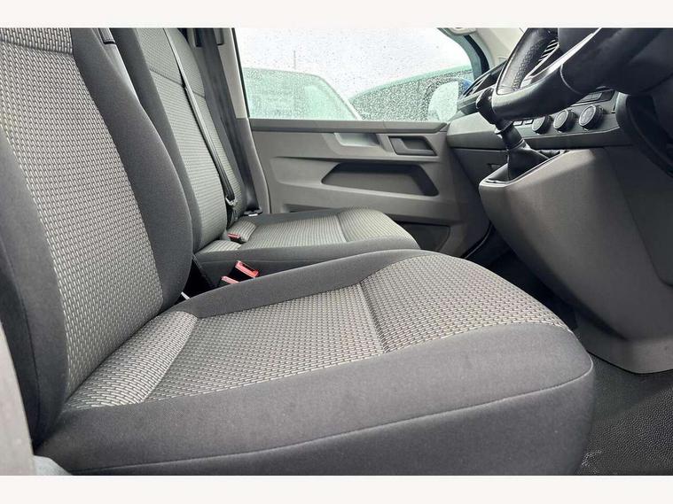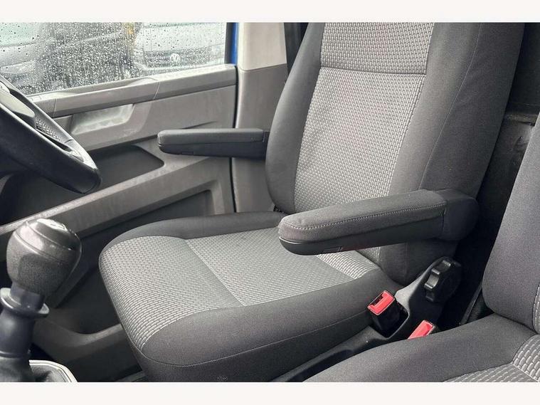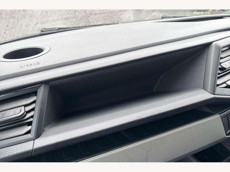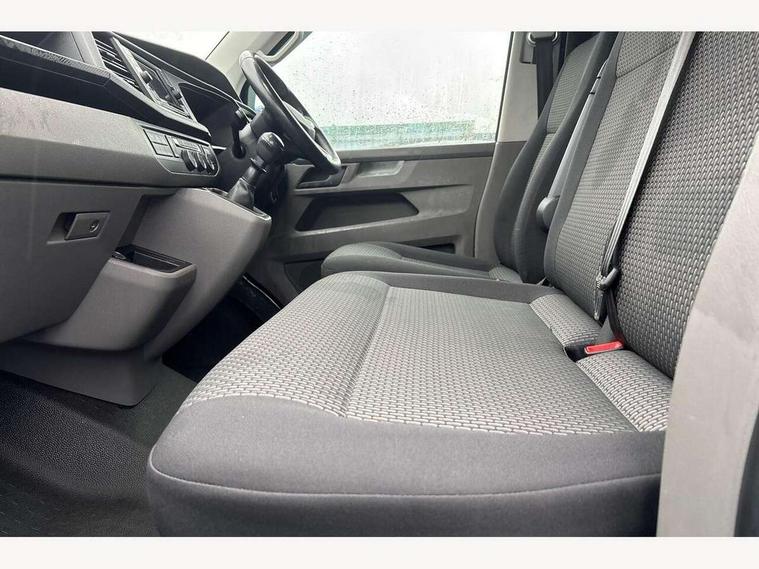 Adaptive cruise control, Cross wind assist, Dimmable illuminated instruments, Driver alert with Multi-function display plus, eCall emergency system, Forward collision warning front assist with autonomous emergency braking, Mobile phone interface, Multi function display plus with black and white display, 2 USB interfaces type C in dashboard, 4 speakers with 2 tweeters and 2 woofers, Composition colour radio with 6.5" touchscreen, Digital radio reception (DAB+), Volkswagen app connect, Automatic headlight control, leaving home and manual coming home feature, Closing rear wing door with unlatching from the inside, Front fog lamps with cornering light, Heat insulating glass (green) in cab and passenger/load compartment, Heated front windscreen, Left convex exterior mirror, Power folding adjustable door mirrors with separately heated, Radiator grille with 2 chrome trims, Rear wing doors without window apertures, Right convex exterior mirror, Transporter nameplate on the rear fender, Windshield wiper intermittent control with rain sensor for windshield wipers, 3 spoke leather wrapped multi function steering wheel, Auto dimming breakaway interior rear view mirror, Comfort headliner in cab, hardboard roof trim in passenger and load compartment, Dust/pollen filter, Front and rear left without window closed side panel in load compartment, Front seats on the right in 1st row of seat, Glove compartment with illumination, Heavy duty tool kit and jack, High partition, Interior plastic loading edge protection, LED Interior lighting in load and passenger compartment, Manual adjustable lumbar support for right single seat in 1st row seats, Refrigerant R134a, Standard lower part dashboard in palladium, Storage compartments on cab seats and reading light, Without right side window apertures in passenger and load compartment, Comfort pack - Transporter, Exterior pack without fog light- Transporter, Non smoker pack - Transporter, 3 point height adjustable seat belts on outer seats cab with electric pretensioners, Driver and front passenger airbag with front passenger airbag deactivation, Warning buzzer and light for driver and front passenger seat belt not fastened, Without child safety lock in passenger compartment, Anti theft alarm system with interior monitoring in cab, backup horn and towing protection, Lockable wheel bolts, 16" chassis with 16" brake system, Diesel particulate filter, Electronic stability control, ABS, ASR with deactivation button, hill start assist and brake assist system, Start/stop system with regenerative breaking, 17" Devonport alloy wheels,