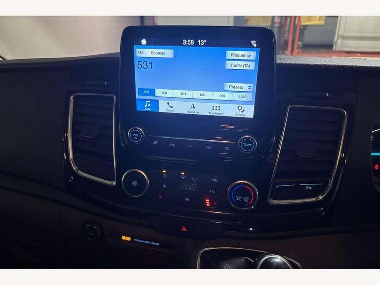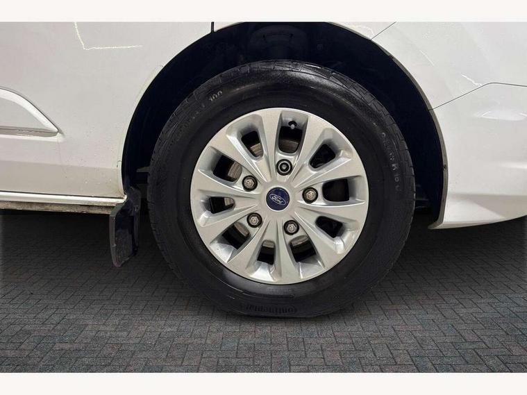 Adjustable steering column, Blind spot monitor, Easy fuel capless refuelling system, Ford Eco mode, Front and rear parking aid + front fog lamps, PAS, Seatbelt warning indicator, Trip computer, Audio controls mounted on steering wheel, Aux input socket, 'Guide me home' headlights, Automatic lights and wipers, Body colour door and tailgate handles, Body coloured body side mouldings, Body coloured door mirrors, Body coloured front bumper, Body coloured rear bumpers, Electric front windows with one touch facility for driver and front passenger, Fixed glazed dual side load doors, Front mud flaps, Headlamp levelling, Intermittent front wash/wipe, Power folding electric heated and adjustable door mirrors, Quickclear heated windscreen, Rear mudflaps, 2nd row three seat wide bench, Assist handle, Cloth upholstery, Coat hook, Courtesy light, Driver and passenger sunvisors with illuminated vanity mirrors, Drivers seat with lumbar adjustment, Front manual air conditioning, Front passenger grab handle, Grab handle on B pillar, Half height load compartment trim boards, Header mounted package tray, Heated front seats, Height adjustable head restraints, Illuminated footwell, Isofix child seat attachments - centre and offside 2nd row seats, Lockable glove box, Map reading lights, Moulded cab headlining, Reach and rake adjustable steering column, Recirculation heater, Rubber floor covering, Tie-down loops, Underseat storage compartment, 3 point seatbelts for all seats, Driver's airbag, Front outer passenger airbag with deactivation switch, Front passenger airbag, Front seatbelt pretensioners, Height adjustable drivers seatbelt mount, Passenger seatbelt height adj, 2nd remote key, Auto locking on drive-away, Auto relocking, Configurable Unlocking, Power door dead locks, Remote central locking, Thatcham category 1 alarm, 2 12v sockets, 80 litre fuel tank, ABS, Diesel particulate filter, ESP + EBA, Power point plug 400W - Level 2, Roll stability control, Side wind mitigation, 16" 6.5 alloy wheels,