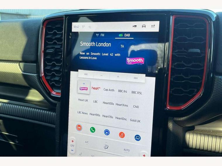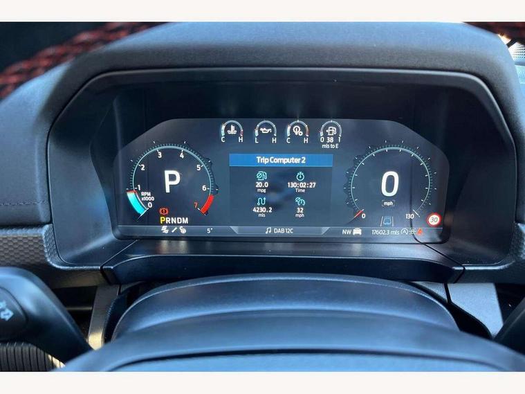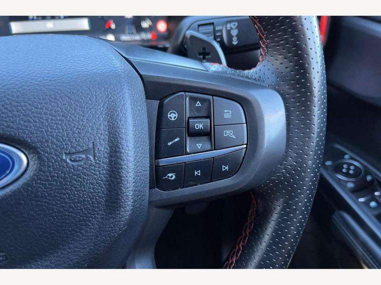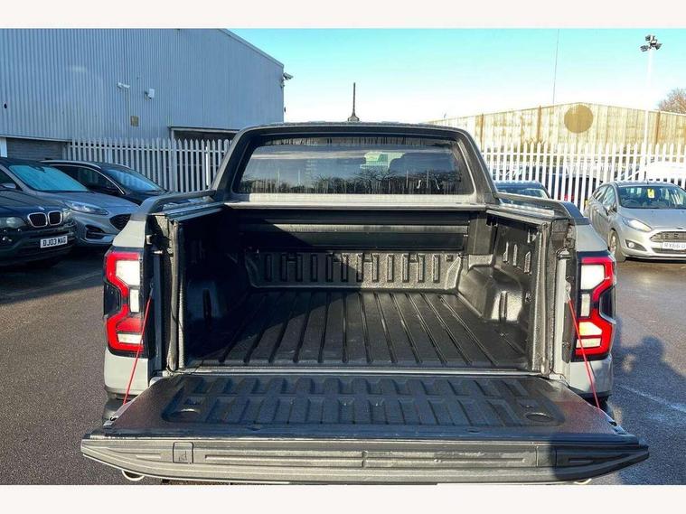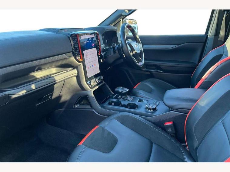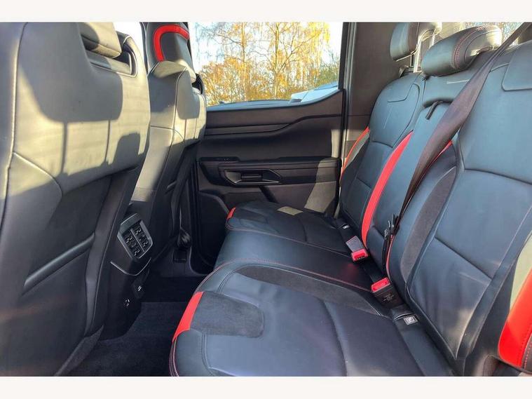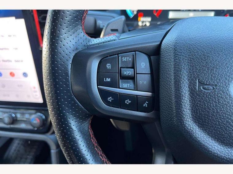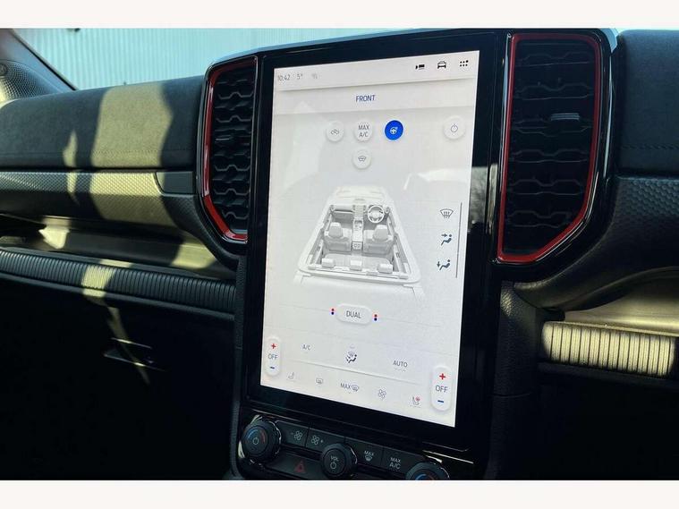 A-pillar assist handle, Electric power assisted steering, Electronic automatic gearshift, Full TFT/LCD instrument cluster, Passenger side roof mounted grab handle, Pro trailer backup assist, Wireless Charging Pad, 360 lighting, Accent colour HD front bumper, Acoustic laminated windscreen, Assisted conventional tailgate, Automatic headlamp levelling, Automatic headlights, Black front fender grille, Black grille, Body colour exterior mirrors, Body coloured door handles, Cast alloy side step, Daytime running lights, Dual power heated fold back door mirror with pud lamps, E-marked glass, Electric rear window defroster, Electric windshield defroster, Electrochromic interior mirror, Extra large wheelarch flares, Fog lamp bezel, Front splash guard, Front towing hooks, Fuel tank guard, High mounted stop lamp, LED Front fog lamp, Level 3 Taillamps, Manual liftgate, Metal underbody protection, Non locking capless fuel fill, Power front windows with one touch up/down, Power rear windows, Privacy glass, Rain sensitive windshield wipers, Rear bumper step accent color, Rear fog lamps, Rear splash guard, Rear towing hooks, Self coloured decklid handles, Tempered glass front window, Under hood engine cover, 12v socket in bedliner, Cargo light, Console with double lid, Driver and passenger sunvisor with mirror, Dual control system - Electronic air temperature control (EATC), Fresh air heater, Front premium floor mats, Heated steering wheel, High series air register, LED ambient interior lighting, Load box edge protectors, Locking glove box lid, Non woven carpet, Overhead console with dome lamps, Pollen filter, Pull out cup holder, Radio noise supression, Rear floor ducts, Roof storage for driver sunglasses, Steering wheel with multimedia controls, Super matte leather upholstery, Tie down hooks, Washer tank level warn lamp, Front seat pack 9 - Ranger, Functional upgrade pack 3 - Ranger, Heavy duty terrain pack - Ranger, ICE feature pack 106 - Ranger, Interior trim pack 15 - Ranger, Lighting package level B - Ranger, Rear seat pack 15 - Ranger, Technology package 73 - Ranger Raptor, Trailer tow pack - Ranger, Wheel pack 19 - Ranger, Breakdown warning triangle, Child proof rear door locks, Driver and passenger airbag, Dual note electric horn, 2 Remote control unit - key fob, Power door dead locks, Stolen vehicle recovery system, Tailgate lock, Thatcham alarm system, Thatcham security system, 400W Power inverter, ABS/ESP brakes with electronic brake boost, Battery management system, Cabin socket and loadbox socket, Electric parking brake, Electrical outlet 3, Engine start/stop system, Front and rear disc brakes, Locking front axle, Locking rear axle, Performance suspension, Rear power point plug, 17" alloy wheels painted in precision grey and all terrain tyres with Ford carbon black centre cap, 17" Aluminium spare wheel, Spare tire lock,