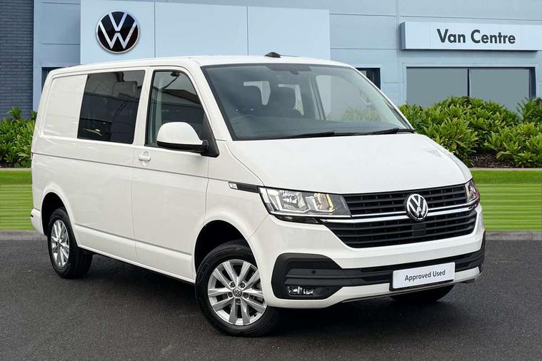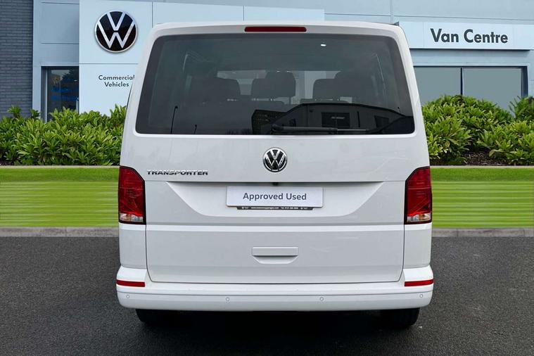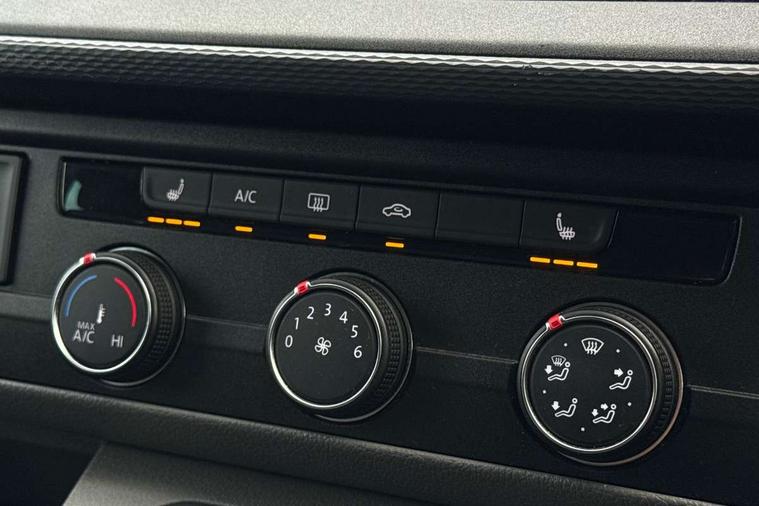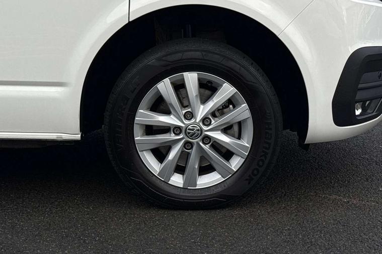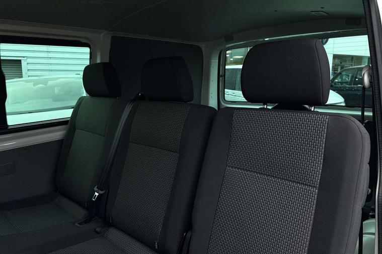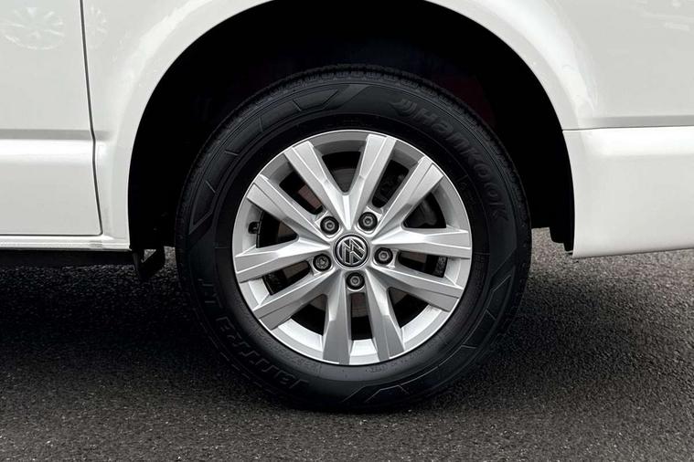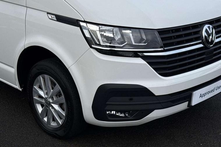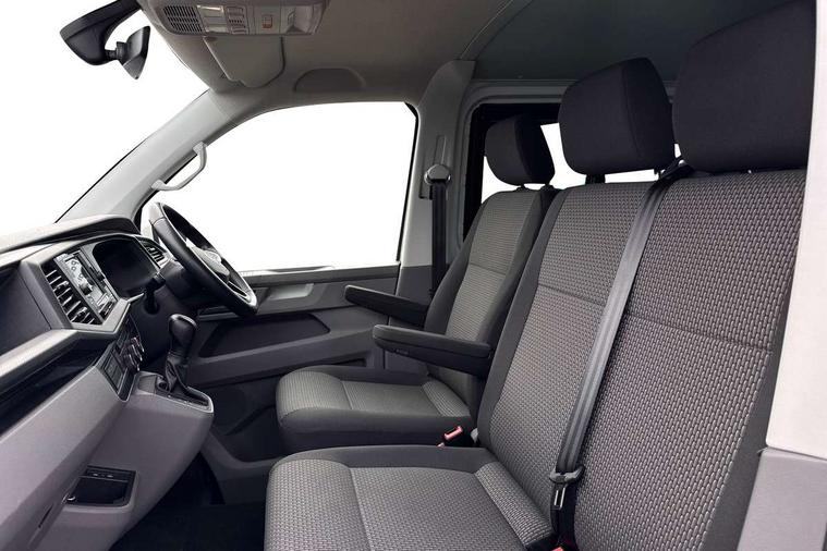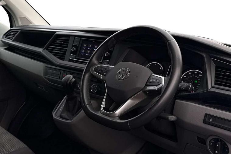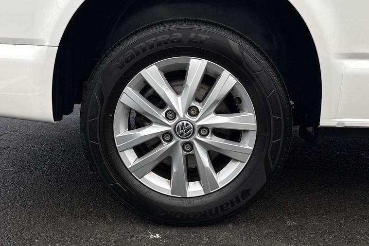 Adaptive cruise control, Child seat anchors ISOFIX and top tether in 2nd row of seats, Cross wind assist, Dimmable illuminated instruments, Driver alert with black and white multi function display plus, eCall emergency system, Forward collision warning front assist with autonomous emergency braking, Headlight range control, Mobile phone interface, Without voice control, 2 USB interfaces type C in dashboard, 4 speakers with 2 tweeters and 2 woofers, Composition colour radio with 6.5" touchscreen, Digital radio reception (DAB+), Volkswagen app connect, Automatic headlight control, leaving home and manual coming home feature, Front fog lamps with cornering light, Green heat insulating glass, Heated front windscreen, Illuminated steps in passenger/load compartment, Left convex exterior mirror, Power folding adjustable door mirrors with separately heated, Privacy glass from the B-pillar and heat-insulating glass in front, Radiator grille with 2 chrome trims, Rear window with heated insulating glass, heated rear window wiper and washer system, Right convex exterior mirror, Tailgate closing with unlatching from the inside, Transporter nameplate on the rear fender, Windshield wiper intermittent control with rain sensor for windshield wipers, Without adhesive film, 3 spoke leather wrapped multi function steering wheel, Additional sound deadening measures in cab and passenger compartment, Auto dimming breakaway interior rear view mirror, Comfort headliner in cab, hardboard roof trim in passenger and load compartment, Dust/pollen filter, Folding grab handles and storage compartments on cab seats, reading light, Front seats on the right in 1st row of seat, Glove compartment with illumination, Heavy duty tool kit and jack, Interior plastic loading edge protection, Lashing rings for load restraint system, LED Interior lighting in load and passenger compartment, Manual height adjustable and lumbar support for driver and single passenger seats, Medium height for vehicles with window aperture hardboard side trim panels in passenger/load compartment, Refrigerant R134a, Standard lower part dashboard in palladium, Without partition, Without seats in 3rd row of seats, Comfort pack - Transporter, Exterior pack without fog light- Transporter, Light and vision pack - Transporter, Non smoker pack - Transporter, 3 point height adjustable seat belts on outer seats cab with electric pretensioners, Driver and front passenger airbag with front passenger airbag deactivation, Power operated child safety lock, Warning buzzer and light for driver seat belt not fastened, Anti theft alarm system with interior monitoring in cab, backup horn and towing protection, Lockable wheel bolts, 16" chassis with 16" brake system, Additional 12V socket, Diesel particulate filter, Electronic stability control, ABS, ASR with deactivation button, hill start assist and brake assist system, Speed limiter, Start/stop system with regenerative breaking, 16" Clayton alloy wheels, Wheel trims,