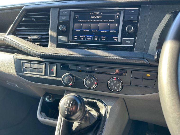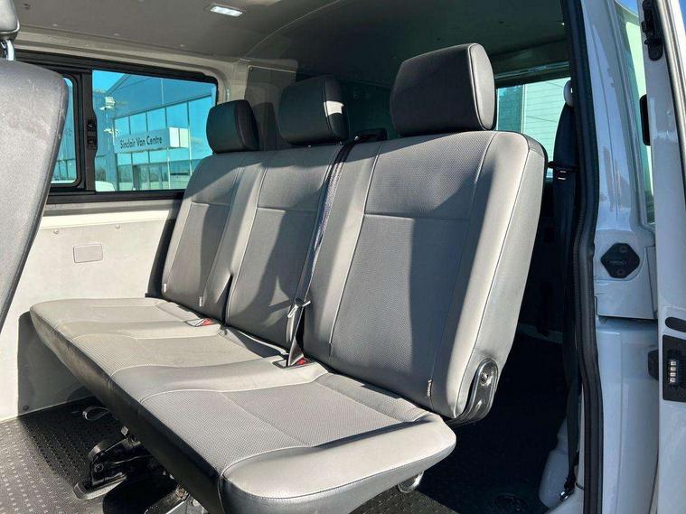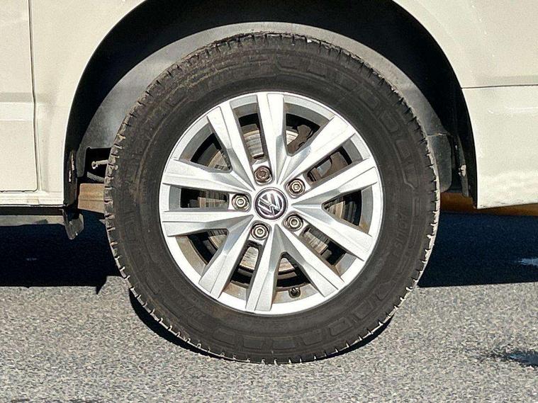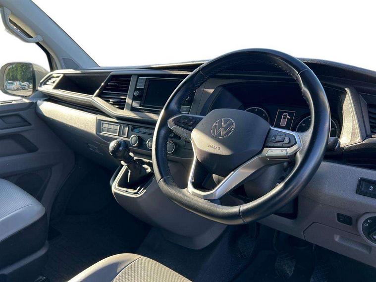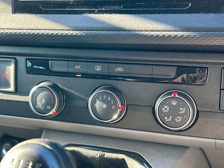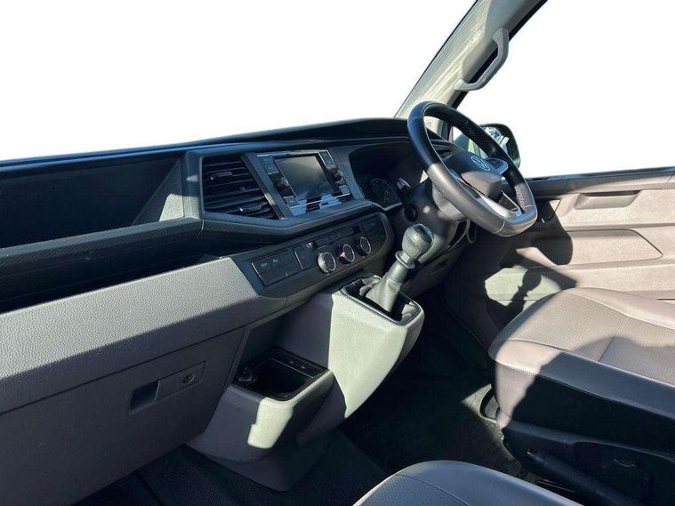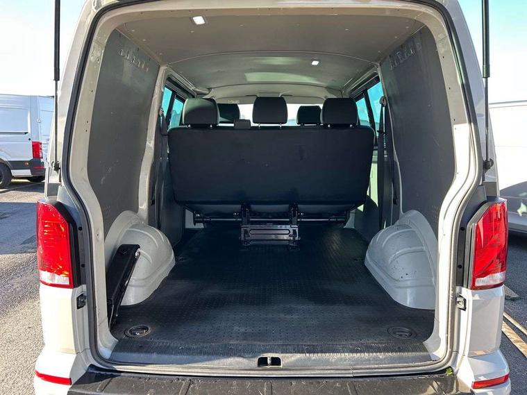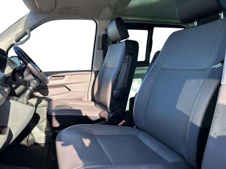 Adaptive cruise control, Child seat anchors ISOFIX and top tether in 2nd row of seats, Cross wind assist, Dimmable illuminated instruments, Driver alert with black and white multi function display plus, eCall emergency system, Electromechanical speed sensitive power steering, height and longitudinally adjustable steering column, Forward collision warning front assist with autonomous emergency braking, Headlight range control, Mobile phone interface, Without voice control, 2 USB interfaces type C in dashboard, 4 speakers with 2 tweeters and 2 woofers, Composition colour radio with 6.5" touchscreen, Digital radio reception (DAB+), Volkswagen app connect, Automatic headlight control, leaving home and manual coming home feature, Front fog lamps with cornering light, Green heat insulating glass, Heated front windscreen, Illuminated steps in passenger/load compartment, Left convex exterior mirror, Power adjustable and heated exterior mirrors, Power folding door mirrors, Privacy glass from the B-pillar and heat-insulating glass in front, Radiator grille with 2 chrome trims, Rear window with heated insulating glass, heated rear window wiper and washer system, Right convex exterior mirror, Tailgate closing with unlatching from the inside, Transporter nameplate on the rear fender, Windshield wiper intermittent control with rain sensor for windshield wipers, Without adhesive film, 3 spoke leather wrapped multi function steering wheel, Additional sound deadening measures in cab and passenger compartment, Auto dimming breakaway interior rear view mirror, Comfort headliner in cab, hardboard roof trim in passenger and load compartment, Dust/pollen filter, Folding grab handles and storage compartments on cab seats, reading light, Front seats on the right in 1st row of seat, Glove compartment with illumination, Heavy duty tool kit and jack, Interior plastic loading edge protection, Lashing rings for load restraint system, LED Interior lighting in load and passenger compartment, Medium height for vehicles with window aperture hardboard side trim panels in passenger/load compartment, Refrigerant R134a, Standard lower part dashboard in palladium, Without partition, Without seats in 3rd row of seats, Comfort pack - Transporter, Exterior pack without fog light- Transporter, Light and vision pack - Transporter, Non smoker pack - Transporter, 3 point height adjustable seat belts on outer seats cab with electric pretensioners, Driver and front passenger airbag with front passenger airbag deactivation, Power operated child safety lock, Single tone horn, Warning buzzer and light for driver seat belt not fastened, Anti theft alarm system with interior monitoring in cab, backup horn and towing protection, Lockable wheel bolts, 16" chassis with 16" brake system, 70 L volume fuel tank, Additional 12V socket, Diesel particulate filter, Electronic stability control, ABS, ASR with deactivation button, hill start assist and brake assist system, Speed limiter, Start/stop system with regenerative breaking, 16" Clayton alloy wheels, Wheel trims,