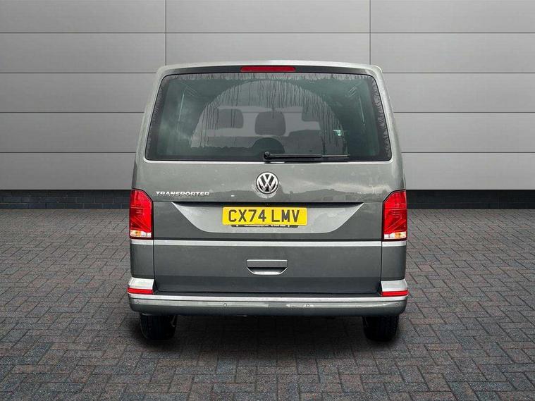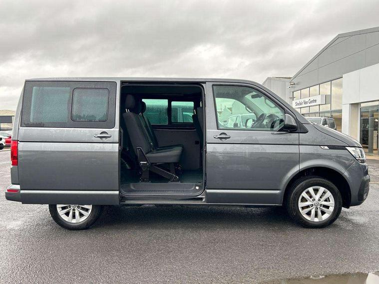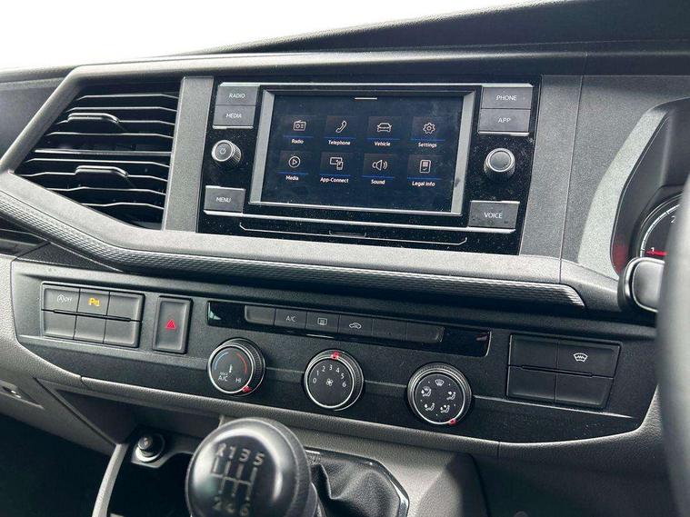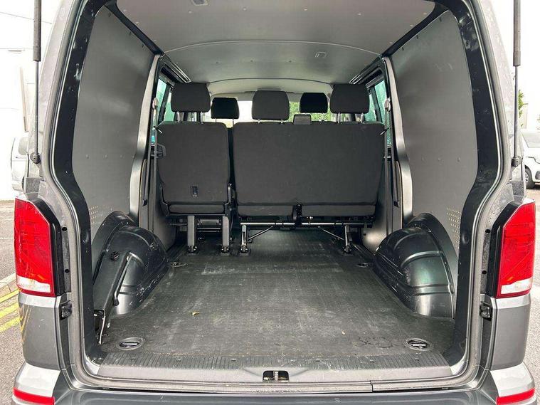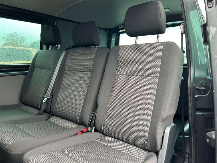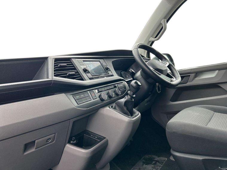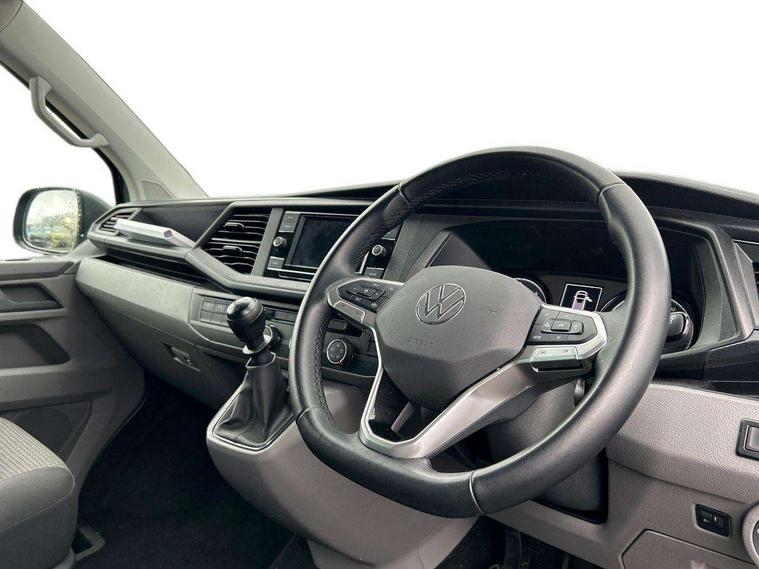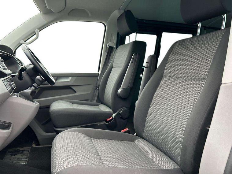 Adaptive cruise control, Child seat anchors ISOFIX and top tether in 2nd row of seats, Cross wind assist, Dimmable illuminated instruments, Driver alert with black and white multi function display plus, eCall emergency system, Forward collision warning front assist with autonomous emergency braking, Headlight range control, Mobile phone interface, Without voice control, 2 USB interfaces type C in dashboard, 4 speakers with 2 tweeters and 2 woofers, Composition colour radio with 6.5" touchscreen, Digital radio reception (DAB+), Volkswagen app connect, Automatic headlight control, leaving home and manual coming home feature, Front fog lamps with cornering light, Green heat insulating glass, Heated front windscreen, Illuminated steps in passenger/load compartment, Left convex exterior mirror, Power folding adjustable door mirrors with separately heated, Privacy glass from the B-pillar and heat-insulating glass in front, Radiator grille with 2 chrome trims, Rear window with heated insulating glass, heated rear window wiper and washer system, Right convex exterior mirror, Tailgate closing with unlatching from the inside, Transporter nameplate on the rear fender, Windshield wiper intermittent control with rain sensor for windshield wipers, Without adhesive film, 3 spoke leather wrapped multi function steering wheel, Additional sound deadening measures in cab and passenger compartment, Auto dimming breakaway interior rear view mirror, Comfort headliner in cab, hardboard roof trim in passenger and load compartment, Dust/pollen filter, Folding grab handles and storage compartments on cab seats, reading light, Front seats on the right in 1st row of seat, Glove compartment with illumination, Heavy duty tool kit and jack, Interior plastic loading edge protection, Lashing rings for load restraint system, LED Interior lighting in load and passenger compartment, Manual height adjustable and lumbar support for driver and single passenger seats, Medium height for vehicles with window aperture hardboard side trim panels in passenger/load compartment, Refrigerant R134a, Standard lower part dashboard in palladium, Without partition, Without seats in 3rd row of seats, Comfort pack - Transporter, Exterior pack without fog light- Transporter, Light and vision pack - Transporter, Non smoker pack - Transporter, 3 point height adjustable seat belts on outer seats cab with electric pretensioners, Driver and front passenger airbag with front passenger airbag deactivation, Power operated child safety lock, Warning buzzer and light for driver seat belt not fastened, Anti theft alarm system with interior monitoring in cab, backup horn and towing protection, Lockable wheel bolts, 16" chassis with 16" brake system, Additional 12V socket, Diesel particulate filter, Electronic stability control, ABS, ASR with deactivation button, hill start assist and brake assist system, Speed limiter, Start/stop system with regenerative breaking, 16" Clayton alloy wheels, Wheel trims,