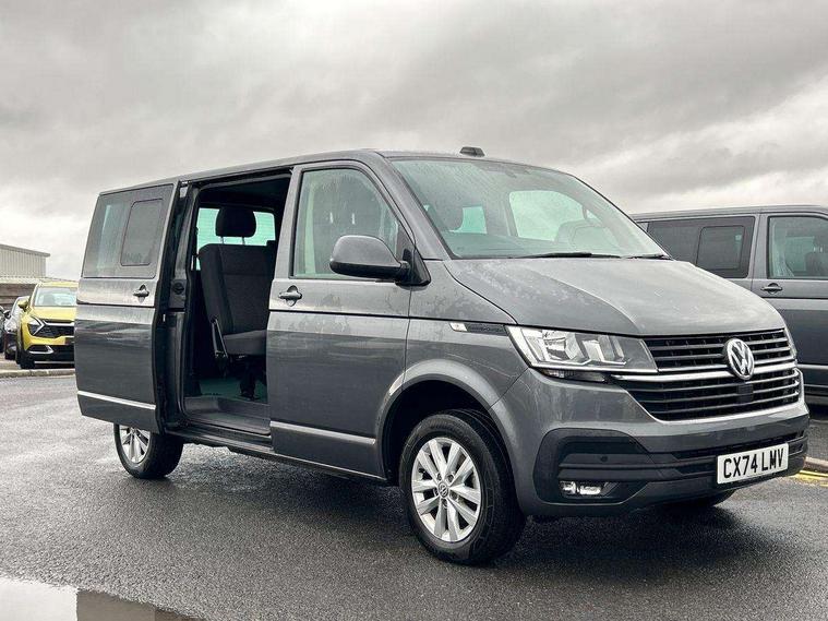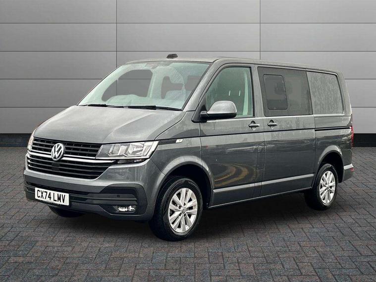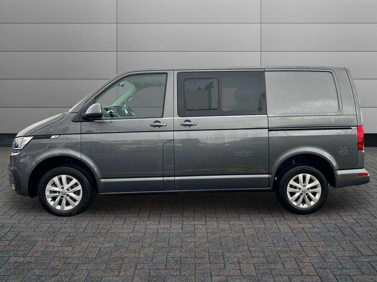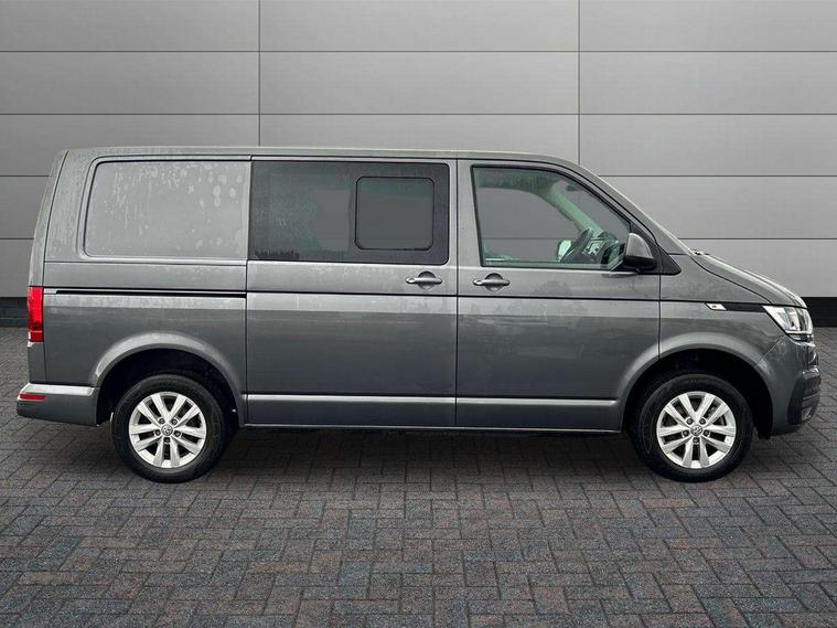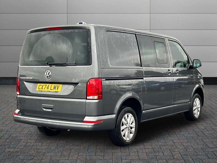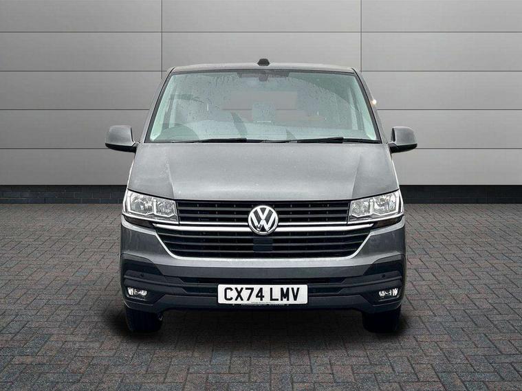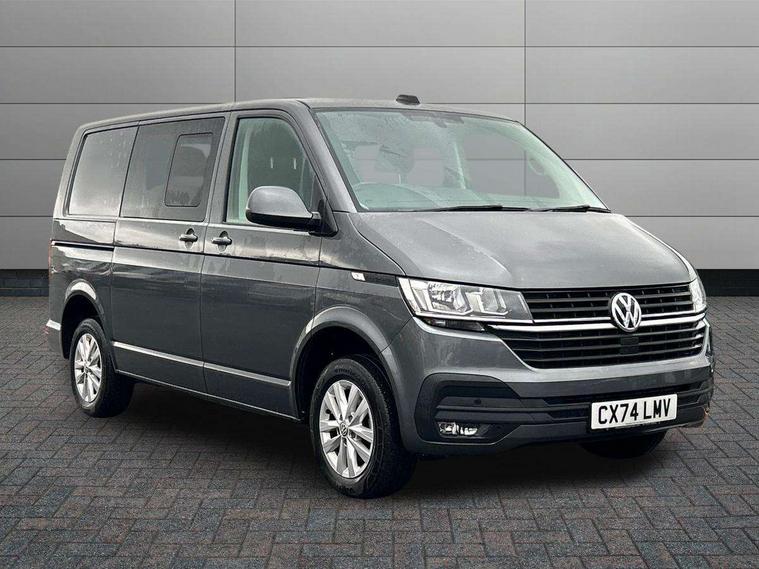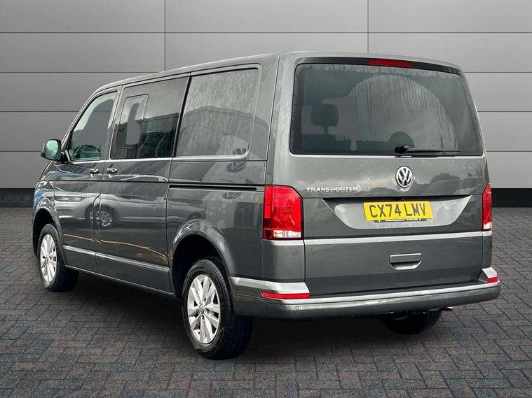 Adaptive cruise control, Child seat anchors ISOFIX and top tether in 2nd row of seats, Cross wind assist, Dimmable illuminated instruments, Driver alert with black and white multi function display plus, eCall emergency system, Forward collision warning front assist with autonomous emergency braking, Headlight range control, Mobile phone interface, Without voice control, 2 USB interfaces type C in dashboard, 4 speakers with 2 tweeters and 2 woofers, Composition colour radio with 6.5" touchscreen, Digital radio reception (DAB+), Volkswagen app connect, Automatic headlight control, leaving home and manual coming home feature, Front fog lamps with cornering light, Green heat insulating glass, Heated front windscreen, Illuminated steps in passenger/load compartment, Left convex exterior mirror, Power folding adjustable door mirrors with separately heated, Privacy glass from the B-pillar and heat-insulating glass in front, Radiator grille with 2 chrome trims, Rear window with heated insulating glass, heated rear window wiper and washer system, Right convex exterior mirror, Tailgate closing with unlatching from the inside, Transporter nameplate on the rear fender, Windshield wiper intermittent control with rain sensor for windshield wipers, Without adhesive film, 3 spoke leather wrapped multi function steering wheel, Additional sound deadening measures in cab and passenger compartment, Auto dimming breakaway interior rear view mirror, Comfort headliner in cab, hardboard roof trim in passenger and load compartment, Dust/pollen filter, Folding grab handles and storage compartments on cab seats, reading light, Front seats on the right in 1st row of seat, Glove compartment with illumination, Heavy duty tool kit and jack, Interior plastic loading edge protection, Lashing rings for load restraint system, LED Interior lighting in load and passenger compartment, Manual height adjustable and lumbar support for driver and single passenger seats, Medium height for vehicles with window aperture hardboard side trim panels in passenger/load compartment, Refrigerant R134a, Standard lower part dashboard in palladium, Without partition, Without seats in 3rd row of seats, Comfort pack - Transporter, Exterior pack without fog light- Transporter, Light and vision pack - Transporter, Non smoker pack - Transporter, 3 point height adjustable seat belts on outer seats cab with electric pretensioners, Driver and front passenger airbag with front passenger airbag deactivation, Power operated child safety lock, Warning buzzer and light for driver seat belt not fastened, Anti theft alarm system with interior monitoring in cab, backup horn and towing protection, Lockable wheel bolts, 16" chassis with 16" brake system, Additional 12V socket, Diesel particulate filter, Electronic stability control, ABS, ASR with deactivation button, hill start assist and brake assist system, Speed limiter, Start/stop system with regenerative breaking, 16" Clayton alloy wheels, Wheel trims,