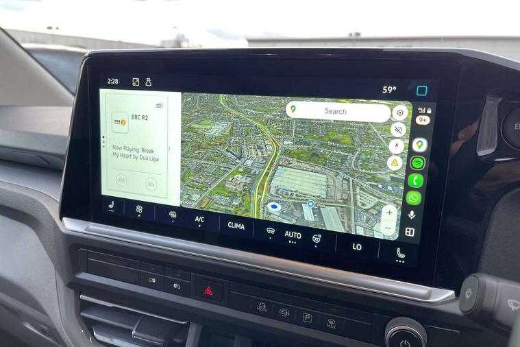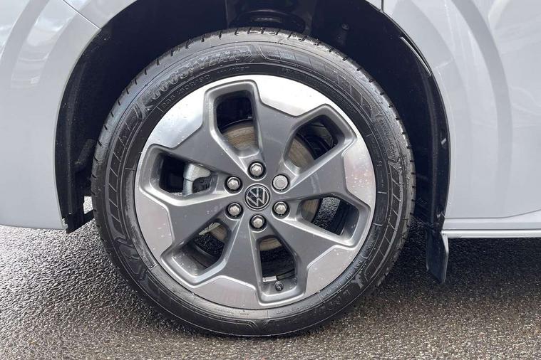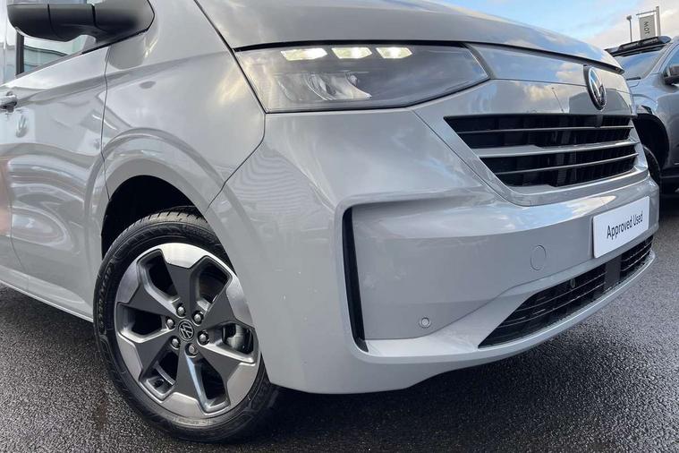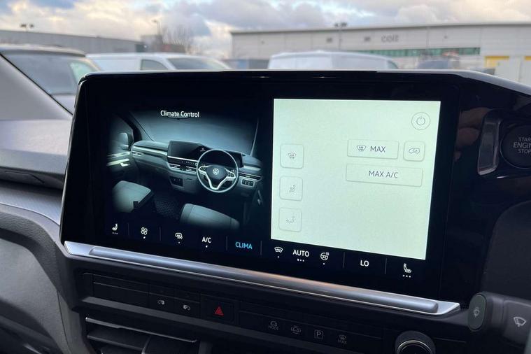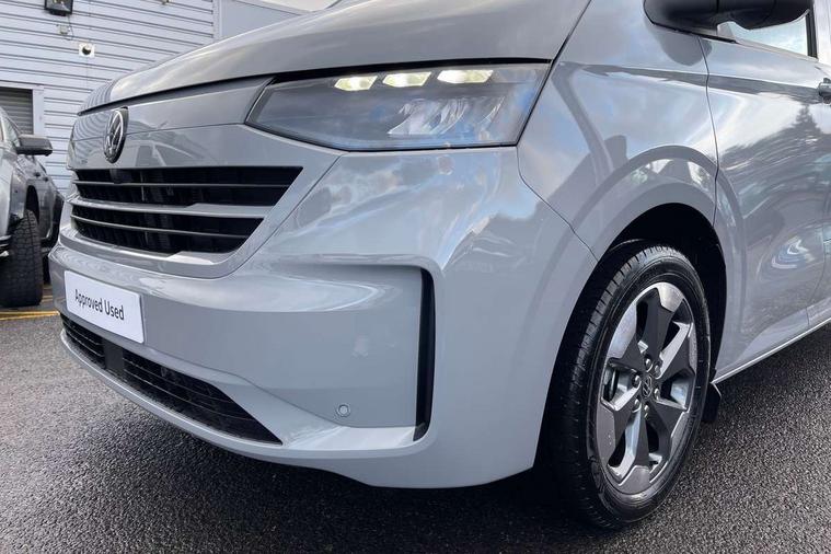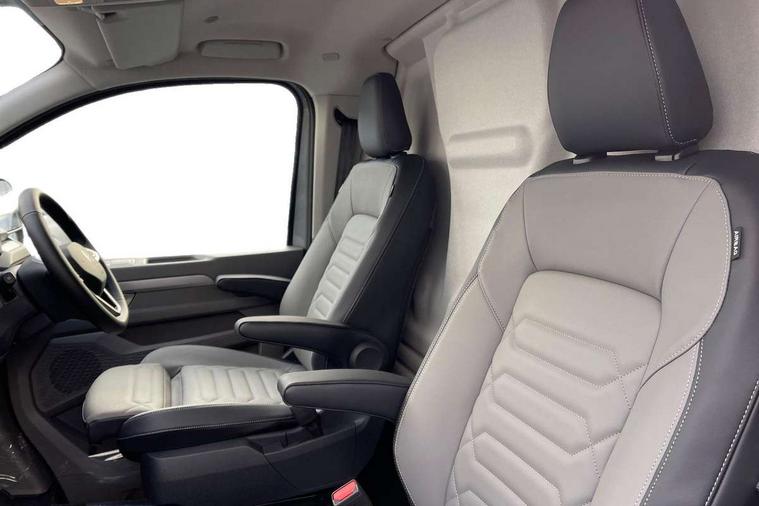 12" digital drivers display, 13" touchscreen infotainment display with wireless app connect and DAB radio, 5G Modem, Adaptive cruise control, Apple CarPlay and Android Auto, Dynamic road sign display, eCall emergency system, Electromechanical speed sensitive power steering, height and longitudinally adjustable steering column, Lane and blind spot assist with exit warning system, Preparation of VW connect and connect plus, Traffic jam assist, Wireless mobile phone charging, Wrong way driver warning, Body colour bumpers, Body coloured door handles, Body coloured door mirrors, Body coloured radiator grille, Electrically heated, adjustable and folding door mirrors, Heat reflecting side window glass, Mud flaps front and rear, Rear Transporter nameplate in black grained decorative trim, Vehicle opening configuration 1x 1st row of seats, 2x all doors, 12V outlet in centre console and 12V outlet on rear right D-pillar, 2x 15-W USB data/charging ports in dashboard and 1x USB-C, 1x USB-A center bottom, 2x LED lights in load compartment, 3x additional super bright LED lights in load compartment, 4 way height and tilt adjustable head restraints, 5 additional USB-C charging ports, Black plastic scuff plate for sliding door in cargo without illumination, Cabin interior lighting, Gear selector lever on steering wheel, Glasses compartment in driver side roof, Grab handle on A-pillar passenger side, Illuminated lockable glovebox, Lashing rings for reinforced floor covering, Narrow centre console with cup holder and compartment for mobile phone, Overhead storage compartment, Rubber floor covering in cab, Striped fabric upholstery, Without passenger seats in load compartment, Driver and front passenger airbag with front passenger airbag deactivation, Dual tone horn, Front and curtain airbags for driver and front passenger, Seat belt pretensioner for driver seat, Anti theft alarm system with interior monitoring in cab, backup horn and towing protection, Electronic immobiliser, Lockable wheel bolts, Preparation for alcohol ignition interlock, 5+ Promise, Alternator - 230A, Electromechanical brake booster, Electronic stability control, ABS, ASR with deactivation button, hill start assist and brake assist system,