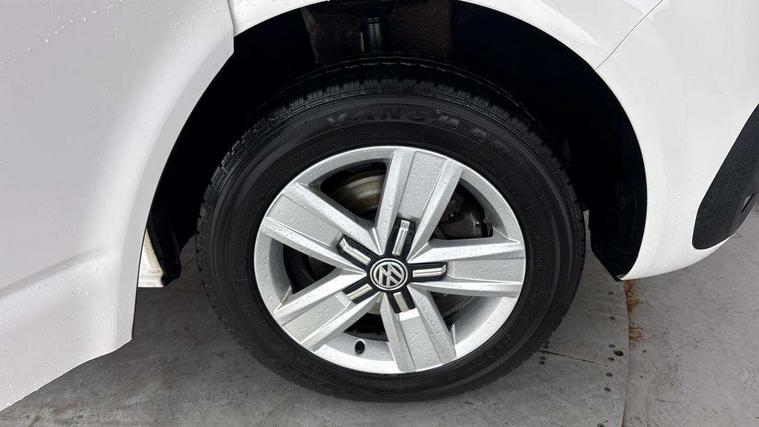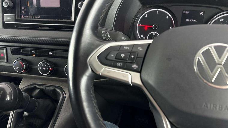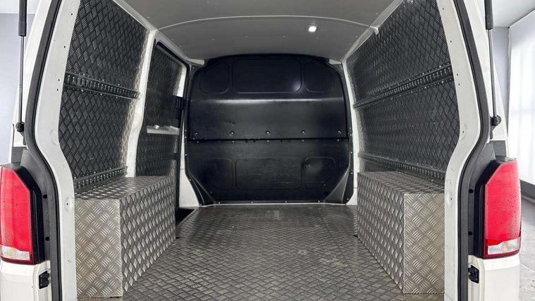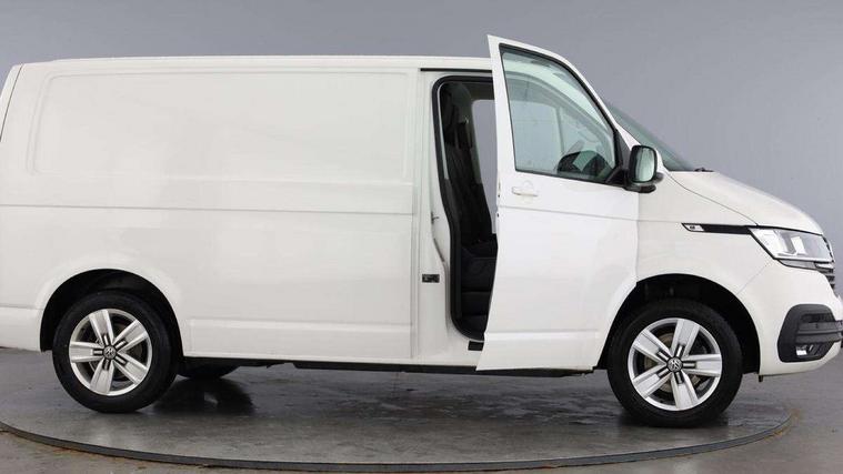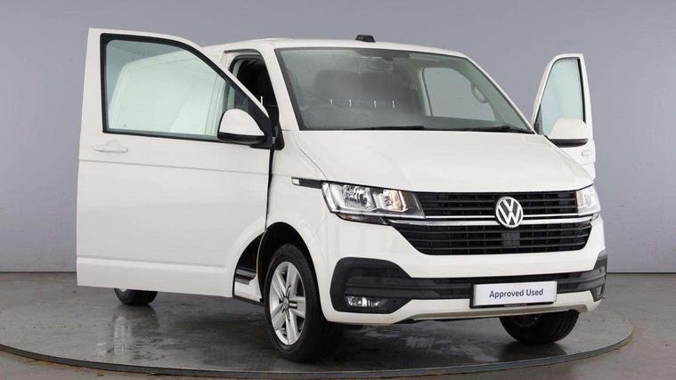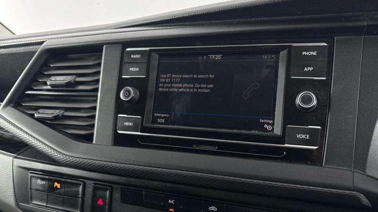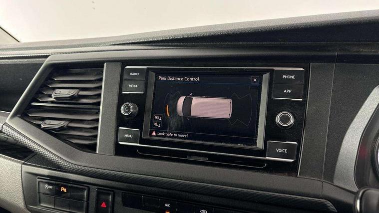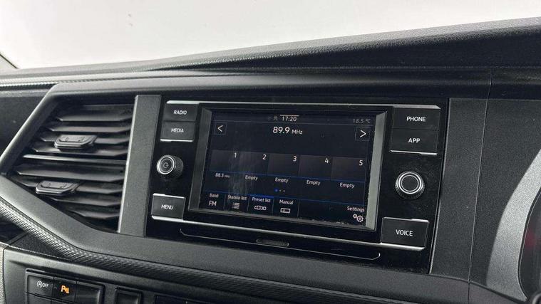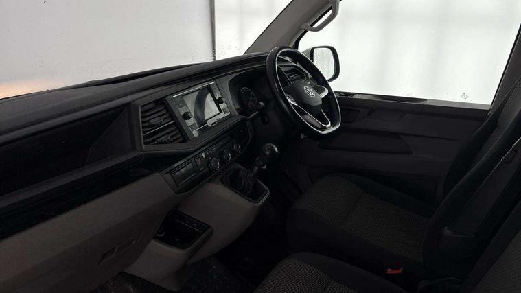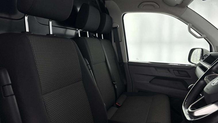 Adaptive cruise control, Cross wind assist, Dimmable illuminated instruments, Driver alert with Multi-function display plus, eCall emergency system, Forward collision warning front assist with autonomous emergency braking, Mobile phone interface, Multi function display plus with black and white display, 2 USB interfaces type C in dashboard, 4 speakers with 2 tweeters and 2 woofers, Composition colour radio with 6.5" touchscreen, Digital radio reception (DAB+), Volkswagen app connect, Automatic headlight control, leaving home and manual coming home feature, Closing rear wing door with unlatching from the inside, Front fog lamps with cornering light, Heat insulating glass (green) in cab and passenger/load compartment, Heated front windscreen, Left convex exterior mirror, Power folding adjustable door mirrors with separately heated, Radiator grille with 2 chrome trims, Rear wing doors without window apertures, Right convex exterior mirror, Transporter nameplate on the rear fender, Windshield wiper intermittent control with rain sensor for windshield wipers, 3 spoke leather wrapped multi function steering wheel, Auto dimming breakaway interior rear view mirror, Comfort headliner in cab, hardboard roof trim in passenger and load compartment, Dust/pollen filter, Front and rear left without window closed side panel in load compartment, Front seats on the right in 1st row of seat, Glove compartment with illumination, Heavy duty tool kit and jack, High partition, Interior plastic loading edge protection, LED Interior lighting in load and passenger compartment, Manual adjustable lumbar support for right single seat in 1st row seats, Refrigerant R134a, Standard lower part dashboard in palladium, Storage compartments on cab seats and reading light, Without right side window apertures in passenger and load compartment, Comfort pack - Transporter, Exterior pack without fog light- Transporter, Non smoker pack - Transporter, 3 point height adjustable seat belts on outer seats cab with electric pretensioners, Driver and front passenger airbag with front passenger airbag deactivation, Warning buzzer and light for driver and front passenger seat belt not fastened, Without child safety lock in passenger compartment, Anti theft alarm system with interior monitoring in cab, backup horn and towing protection, Lockable wheel bolts, 16" chassis with 16" brake system, Diesel particulate filter, Electronic stability control, ABS, ASR with deactivation button, hill start assist and brake assist system, Start/stop system with regenerative breaking, 17" Devonport alloy wheels,