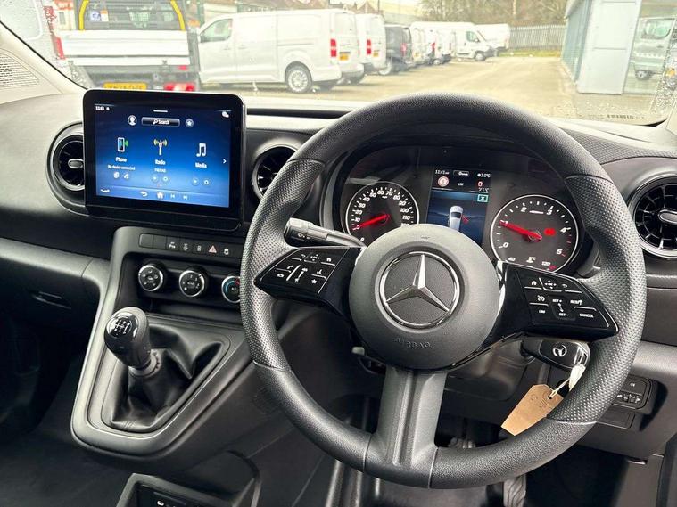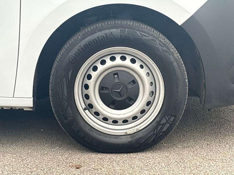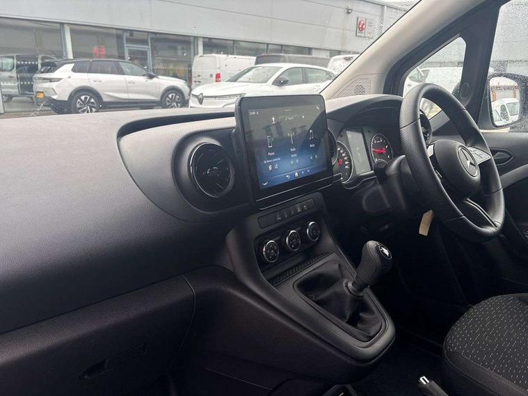 Active lane keeping assist, Bluetooth interface with hands-free function, Communication module (LTE) for digital services, Cruise control and variable speed limiter, Instrument cluster with colour display, PAS, Pre-installation - Mercedes me connect, Rear parking aid, Reversing camera, Smartphone integration wireless with Android auto and Apple carplay, Speedometer mph and km/h, Traffic sign assist B, Trip computer, Tyre pressure monitoring front/rear, wireless, Aux input socket, Radio/MP3, USB Type C port, 180 degrees double-wing rear doors without windows, Air drying for windscreen and side windows, All round heat insulating glass, Aspherically curved exterior mirror glass, Automatic hazard light activation under emergency braking, Black door handles, Daytime running lights, Heated and electric adjustable door mirrors, Left side sliding door, Light and rain sensors, Rear side wall without windows, Third rear brake light, 12v electric socket in centre console, 6 Load securing rings on floor, Centre armrest and door centre panels in black grain, Driver and passengers sunvisors, Full length partition, Glove compartment closed in co-driver's side, Height and rake adjustable steering wheel, Interior roof lamp with switch on the D pillar and 3 way setting, Mirror in drivers sunblind, Multifunction steering wheel with touch control, Overhead storage, Plastic flooring in front passenger compartment, Pollen filter, Pre-installation - Live traffic information, Pre-installation - Remote services plus, Pre-installation for digital extras, Storage compartments in doors, Attention assist B, Breakdown management, Driver and co-driver airbag, Front thorax-sidebags and window bags, Height adjustable seatbelts + pretensioners + force limiters, Mercedes-Benz emergency call system, Seat belt warning for driver and co-driver seats, Alarm, Central locking, Double lock, 17.4L AdBlue tank, 6 speed manual transmission, Active brake assist, Brake system with ABS and ASR, ECO Start/stop function, Electronic stability programme, Fuel filter with water separator, Hill start assist, Particulate trap, Tyre optimised for roll resistance, Tyres without name of make,