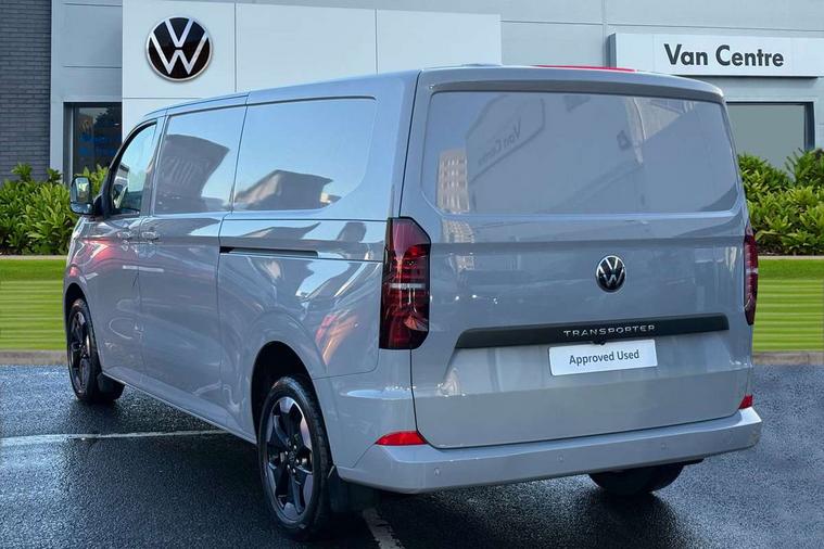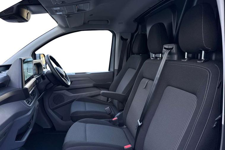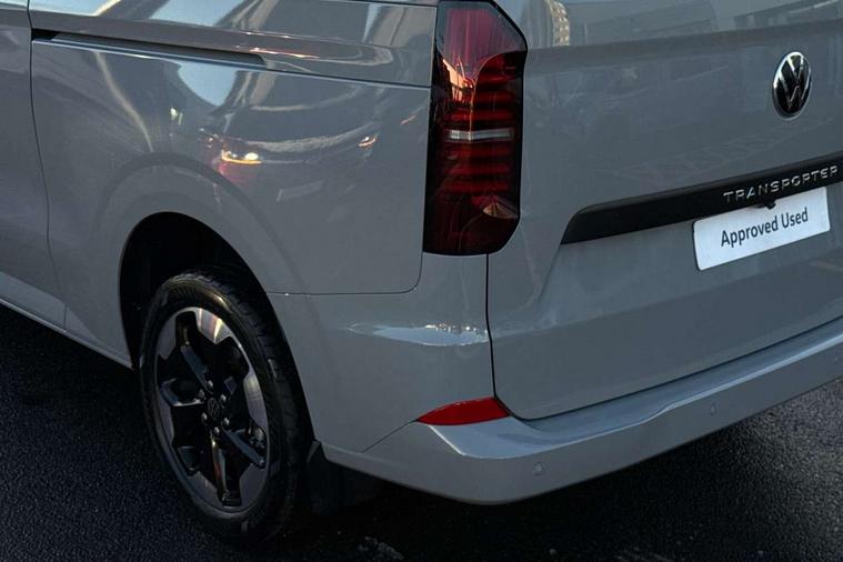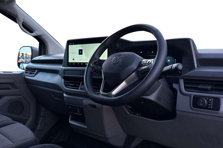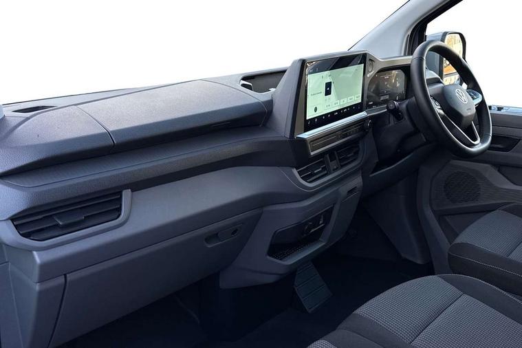 12" digital drivers display, 13" touchscreen infotainment display with wireless app connect and DAB radio, 5G Modem, Adaptive cruise control, Apple CarPlay and Android Auto, Dynamic road sign display, eCall emergency system, Electromechanical speed sensitive power steering, height and longitudinally adjustable steering column, Lane and blind spot assist with exit warning system, Preparation of VW connect and connect plus, Traffic jam assist, Wireless mobile phone charging, Wrong way driver warning, Body colour bumpers, Body coloured door handles, Body coloured door mirrors, Body coloured radiator grille, Electrically heated, adjustable and folding door mirrors, Heat reflecting side window glass, Mud flaps front and rear, Rear Transporter nameplate in black grained decorative trim, Vehicle opening configuration 1x 1st row of seats, 2x all doors, 12V outlet in centre console and 12V outlet on rear right D-pillar, 2x 15-W USB data/charging ports in dashboard and 1x USB-C, 1x USB-A center bottom, 2x LED lights in load compartment, 3x additional super bright LED lights in load compartment, 4 way height and tilt adjustable head restraints, 5 additional USB-C charging ports, Black plastic scuff plate for sliding door in cargo without illumination, Cabin interior lighting, Gear selector lever on steering wheel, Glasses compartment in driver side roof, Grab handle on A-pillar passenger side, Illuminated lockable glovebox, Lashing rings for reinforced floor covering, Narrow centre console with cup holder and compartment for mobile phone, Overhead storage compartment, Rubber floor covering in cab, Striped fabric upholstery, Without passenger seats in load compartment, Driver and front passenger airbag with front passenger airbag deactivation, Dual tone horn, Front and curtain airbags for driver and front passenger, Seat belt pretensioner for driver seat, Anti theft alarm system with interior monitoring in cab, backup horn and towing protection, Electronic immobiliser, Lockable wheel bolts, Preparation for alcohol ignition interlock, 5+ Promise, Alternator - 230A, Electromechanical brake booster, Electronic stability control, ABS, ASR with deactivation button, hill start assist and brake assist system,