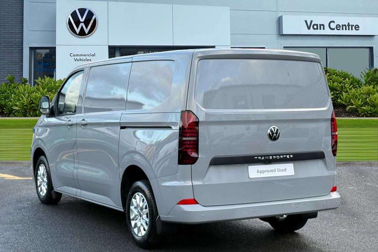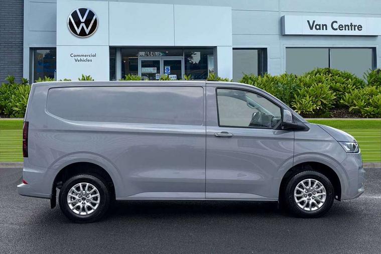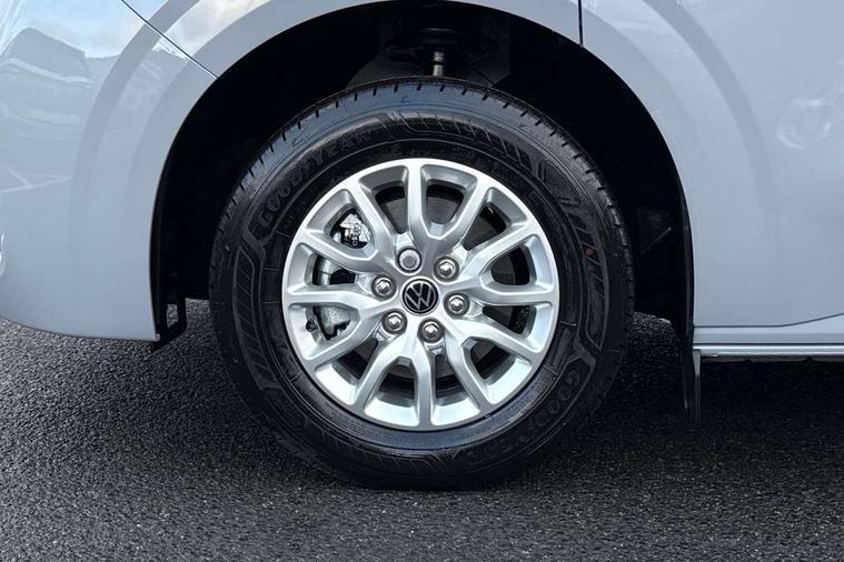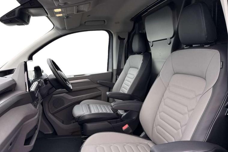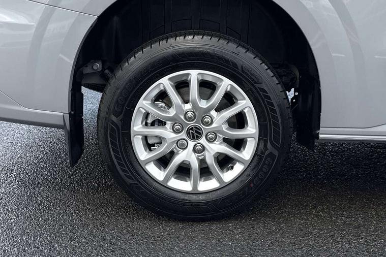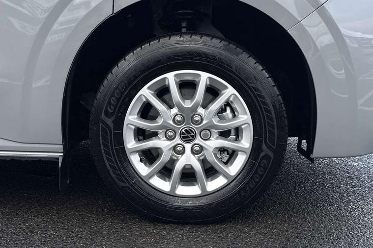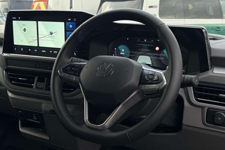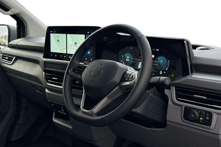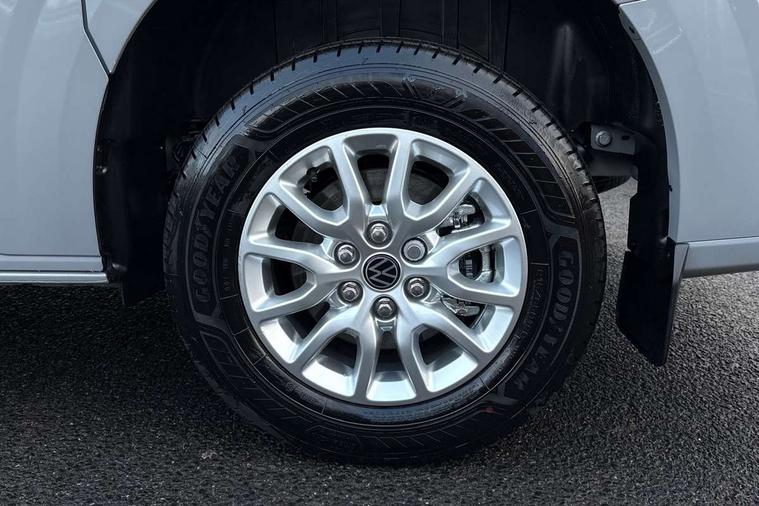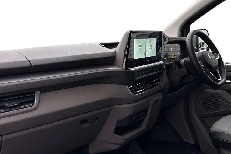12" digital drivers display, 13" touchscreen infotainment display with wireless app connect and DAB radio, 5G Modem, Adaptive cruise control, Apple CarPlay and Android Auto, Dynamic road sign display, eCall emergency system, Electromechanical speed sensitive power steering, height and longitudinally adjustable steering column, Lane and blind spot assist with exit warning system, Preparation of VW connect and connect plus, Traffic jam assist, Wireless mobile phone charging, Wrong way driver warning, Body colour bumpers, Body coloured door handles, Body coloured door mirrors, Body coloured radiator grille, Electrically heated, adjustable and folding door mirrors, Heat reflecting side window glass, Mud flaps front and rear, Rear Transporter nameplate in black grained decorative trim, Vehicle opening configuration 1x 1st row of seats, 2x all doors, 12V outlet in centre console and 12V outlet on rear right D-pillar, 2x 15-W USB data/charging ports in dashboard and 1x USB-C, 1x USB-A center bottom, 2x LED lights in load compartment, 3x additional super bright LED lights in load compartment, 4 way height and tilt adjustable head restraints, 5 additional USB-C charging ports, Black plastic scuff plate for sliding door in cargo without illumination, Cabin interior lighting, Gear selector lever on steering wheel, Glasses compartment in driver side roof, Grab handle on A-pillar passenger side, Illuminated lockable glovebox, Lashing rings for reinforced floor covering, Narrow centre console with cup holder and compartment for mobile phone, Overhead storage compartment, Rubber floor covering in cab, Striped fabric upholstery, Without passenger seats in load compartment, Driver and front passenger airbag with front passenger airbag deactivation, Dual tone horn, Front and curtain airbags for driver and front passenger, Seat belt pretensioner for driver seat, Anti theft alarm system with interior monitoring in cab, backup horn and towing protection, Electronic immobiliser, Lockable wheel bolts, Preparation for alcohol ignition interlock, 5+ Promise, Alternator - 230A, Electromechanical brake booster, Electronic stability control, ABS, ASR with deactivation button, hill start assist and brake assist system,