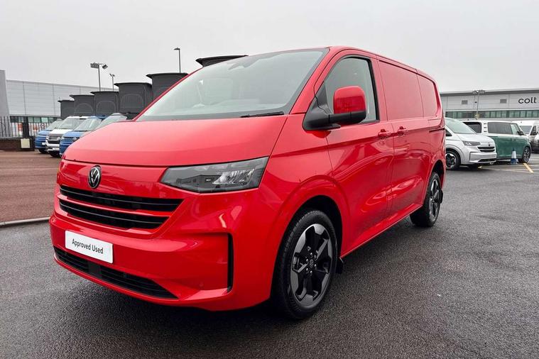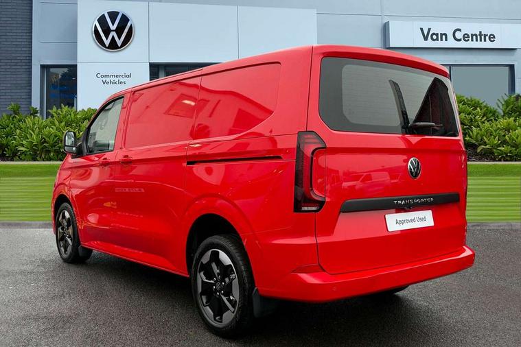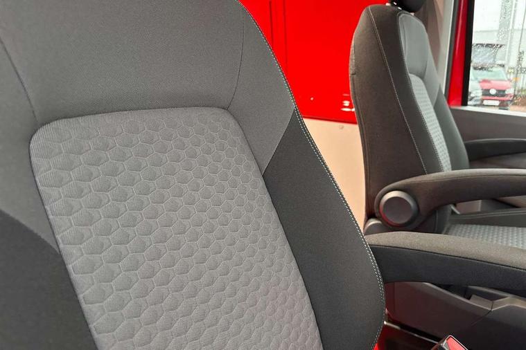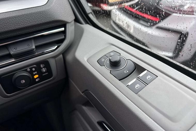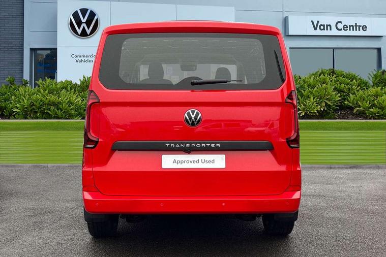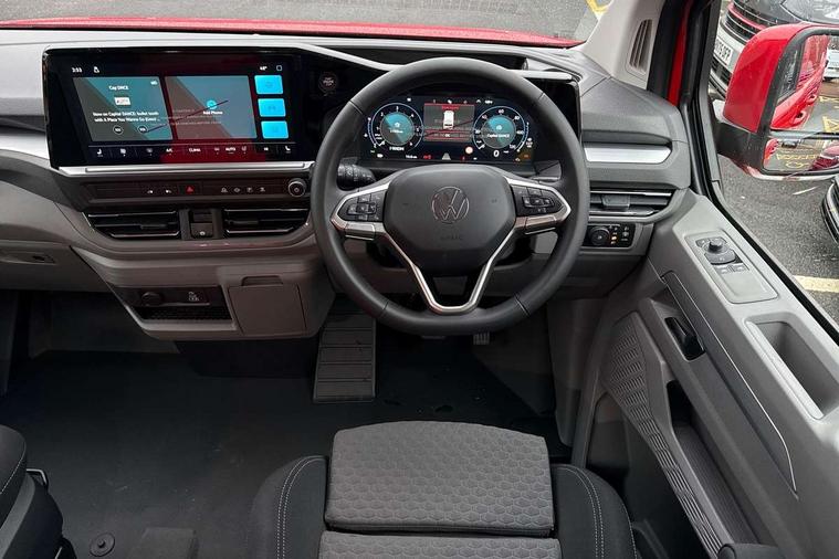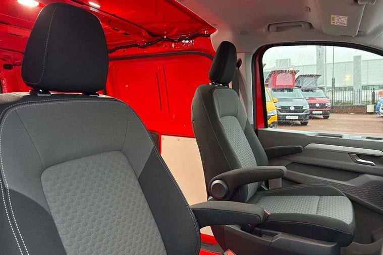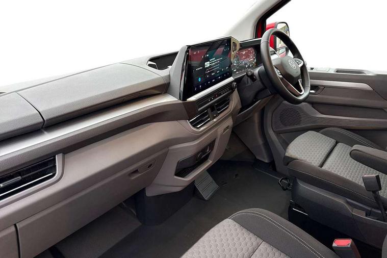 12" digital drivers display, 13" touchscreen infotainment display with wireless app connect and DAB radio, 5G Modem, Adaptive cruise control, Apple CarPlay and Android Auto, Dynamic road sign display, eCall emergency system, Electromechanical speed sensitive power steering, height and longitudinally adjustable steering column, Lane and blind spot assist with exit warning system, Preparation of VW connect and connect plus, Traffic jam assist, Wireless mobile phone charging, Wrong way driver warning, Body colour bumpers, Body coloured door handles, Body coloured door mirrors, Body coloured radiator grille, Electrically heated, adjustable and folding door mirrors, Heat reflecting side window glass, Mud flaps front and rear, Rear Transporter nameplate in black grained decorative trim, Vehicle opening configuration 1x 1st row of seats, 2x all doors, 12V outlet in centre console and 12V outlet on rear right D-pillar, 2x 15-W USB data/charging ports in dashboard and 1x USB-C, 1x USB-A center bottom, 2x LED lights in load compartment, 3x additional super bright LED lights in load compartment, 4 way height and tilt adjustable head restraints, 5 additional USB-C charging ports, Black plastic scuff plate for sliding door in cargo without illumination, Cabin interior lighting, Gear selector lever on steering wheel, Glasses compartment in driver side roof, Grab handle on A-pillar passenger side, Illuminated lockable glovebox, Lashing rings for reinforced floor covering, Narrow centre console with cup holder and compartment for mobile phone, Overhead storage compartment, Rubber floor covering in cab, Striped fabric upholstery, Without passenger seats in load compartment, Driver and front passenger airbag with front passenger airbag deactivation, Dual tone horn, Front and curtain airbags for driver and front passenger, Seat belt pretensioner for driver seat, Anti theft alarm system with interior monitoring in cab, backup horn and towing protection, Electronic immobiliser, Lockable wheel bolts, Preparation for alcohol ignition interlock, 5+ Promise, Alternator - 230A, Electromechanical brake booster, Electronic stability control, ABS, ASR with deactivation button, hill start assist and brake assist system,