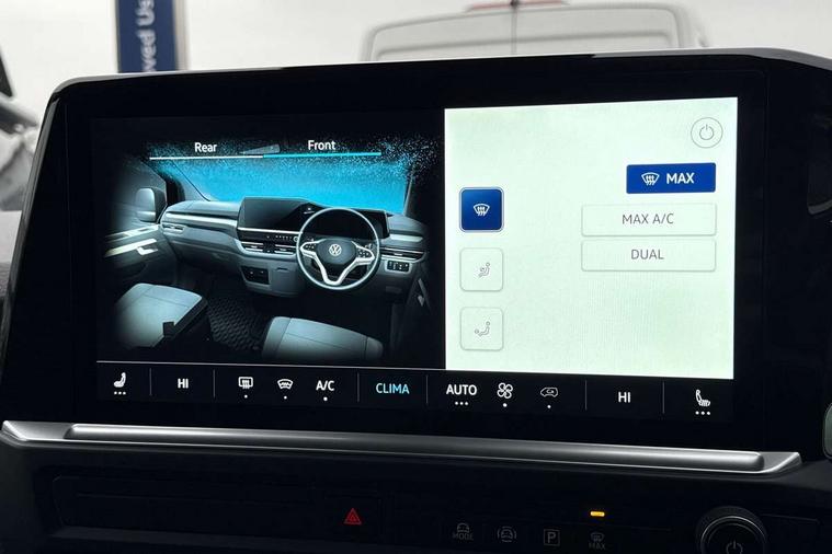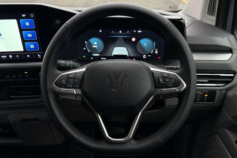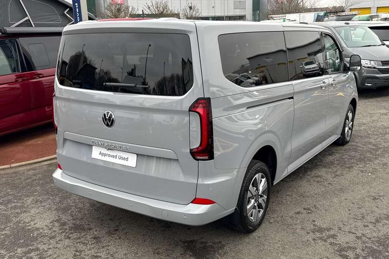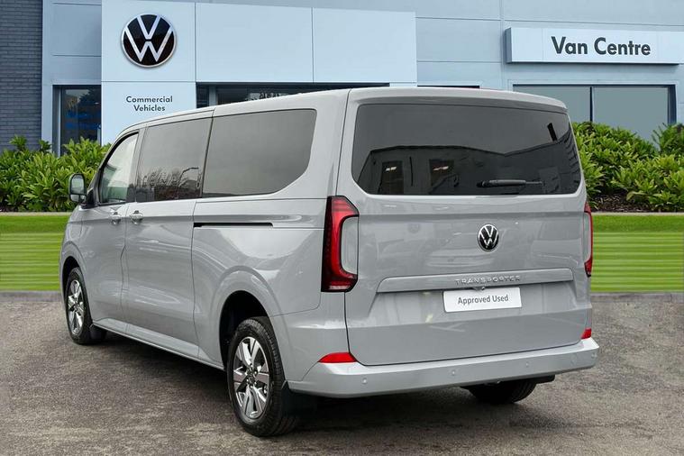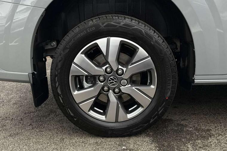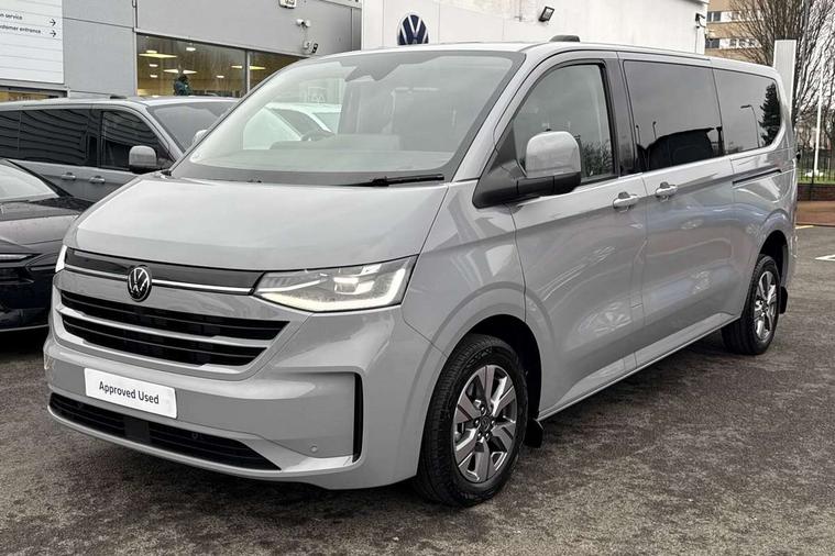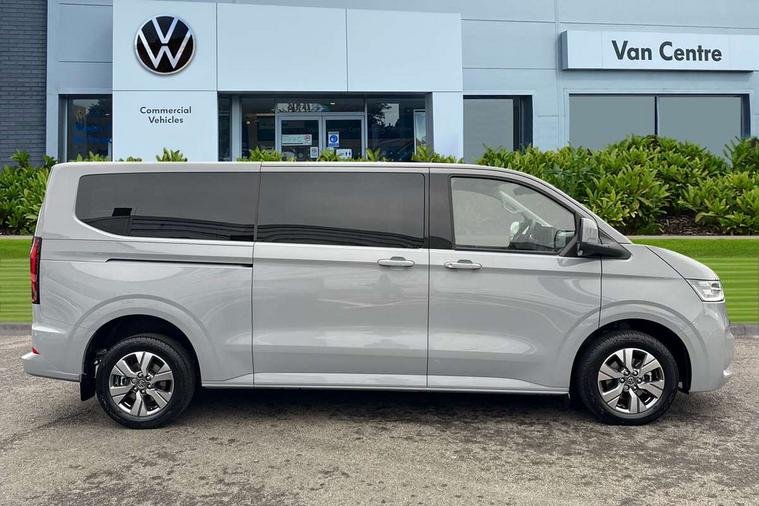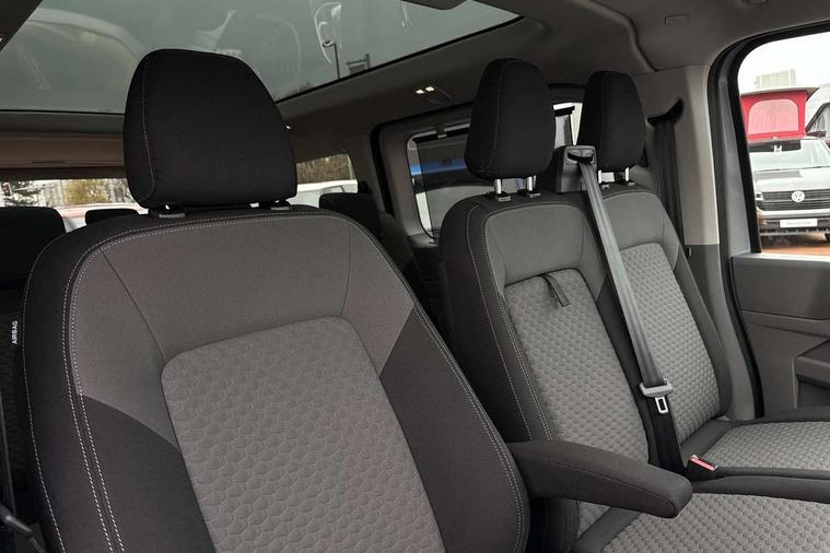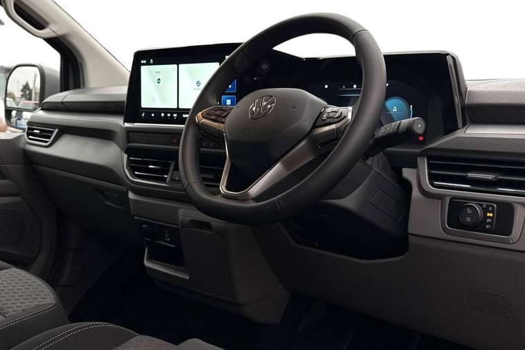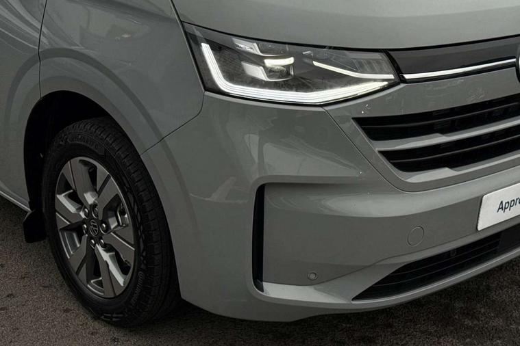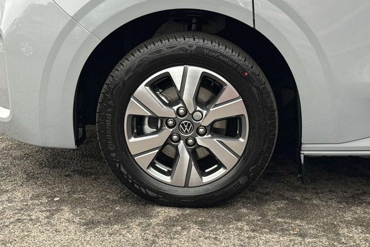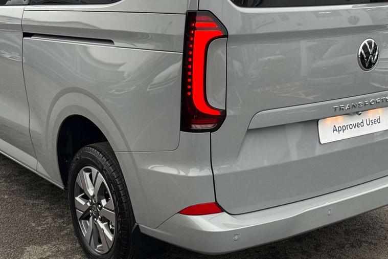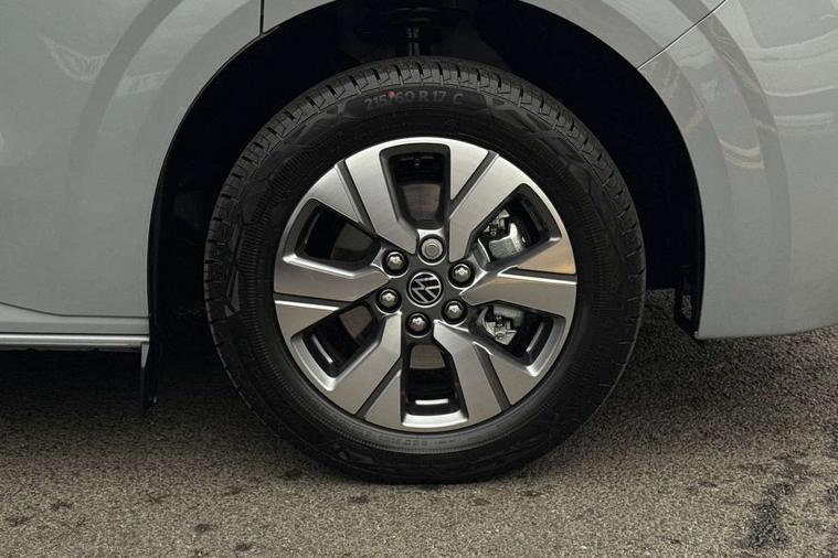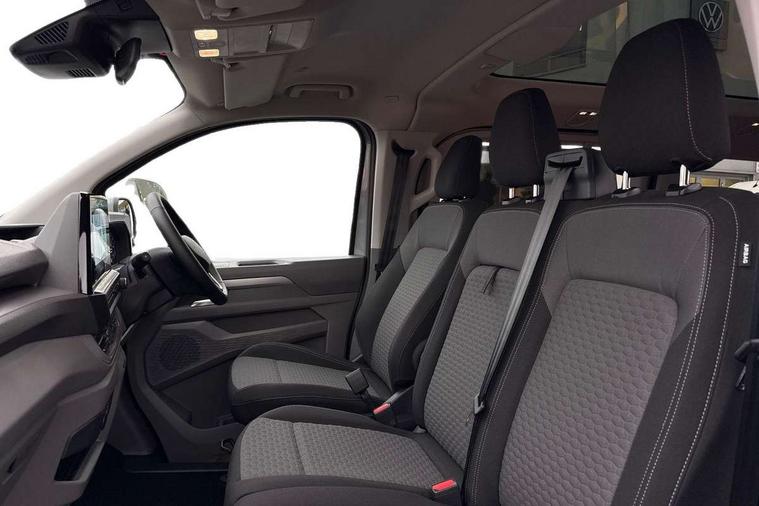 12" digital drivers display, 13" touchscreen infotainment display with wireless app connect and DAB radio, 5G Modem, Cruise control with predictive speed limiter, Dynamic road sign display, eCall emergency system, Front collision warning with braking, Lane assist, Power assisted steering, Wireless mobile phone charging, Wrong way driver warning, 7x USB sockets in cab and 6x USB sockets in passenger compartment, VW Connect and VW Connect plus preparation, Advanced high beam control with dynamic light assist, Body coloured exterior mirror housings and door handles, Body coloured front and rear bumper, Exterior mirrors, power adjustable, heated and power folding with puddle lighting, Fixed side window in load/passenger compartment, left, Fixed side window in load/passenger compartment, right, Heat reflecting glass in front side windows, privacy glass in rear side windows and rear window, Heated rear window, Heated windscreen, IQ light LED matrix headlight with coming home and leaving function, Laminated windshield made of heat reflecting glass, LED rear lights with exclusive light signature, Metal scuff plate on sliding door, illuminated, Mud flaps front and rear, Rear tailgate, Rear window wiper with washer system, Sliding doors on drivers side and front passenger side with electric closing aid, Transporter nameplate on the rear fender, Vehicle opening configuration 1x 1st row of seats, 2x all doors, 12 pin terminal block, 12V outlet on D pillar at the bottom, rear right, 2 LED lights in roof of load compartment, 3 seater bench in 3rd row of seats, folding backrest, 3 single seats in 2nd row (fold & tumble ) 6x ISOFIX and 4x TopTether, 3 zone automatic air conditioning system with digital control panel in passenger compartment, 4 way height and tilt adjustable head restraints, Electric auxiliary heater, Footwell lighting in cab, Grab handle on A pillar driver and passenger side, and on B-pillar in passenger compartment, Grab handle on passenger side, A-pillar, Illuminated metal scuff plate in cab, Lashing rings for load restraint system, LED light units for cab and passenger compartment, Molded headliner, woven, in passenger compartment, Overhead storage compartment, Selector lever on steering wheel, Sunshades on side windows of sliding doors in 2nd row passenger compartment, Without floor covering in load compartment, Without side trim panel load/passenger compartment, Double sound horn, Driver and front passenger airbag with front passenger airbag deactivation, Side and curtain airbags in cab and curtain airbags in passenger compartment, Anti-theft alarm system with interior monitoring, backup horn and towing protection, Anti-theft wheel bolts, Keyless access with safelock, Preparation for alcohol ignition interlock, 5+ Promise, Electronic Stability Control (ESC), Tyres 215/60 R17 C 109/107T, low rolling resistance,