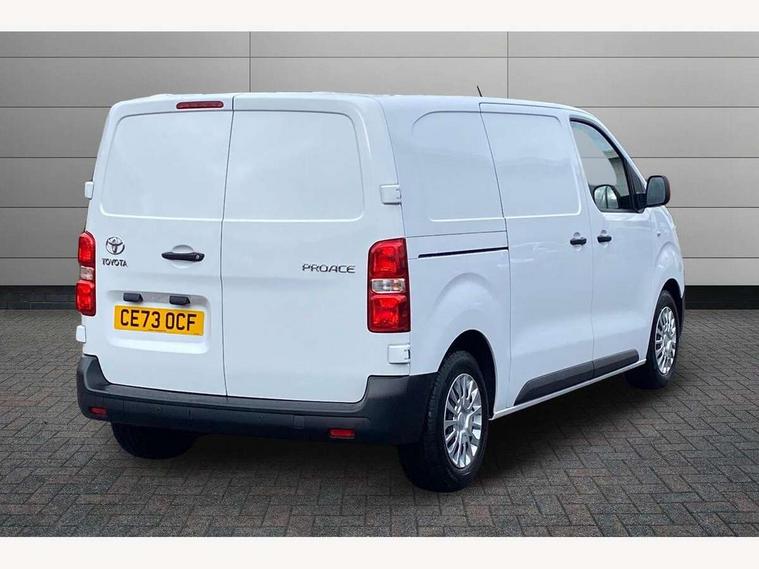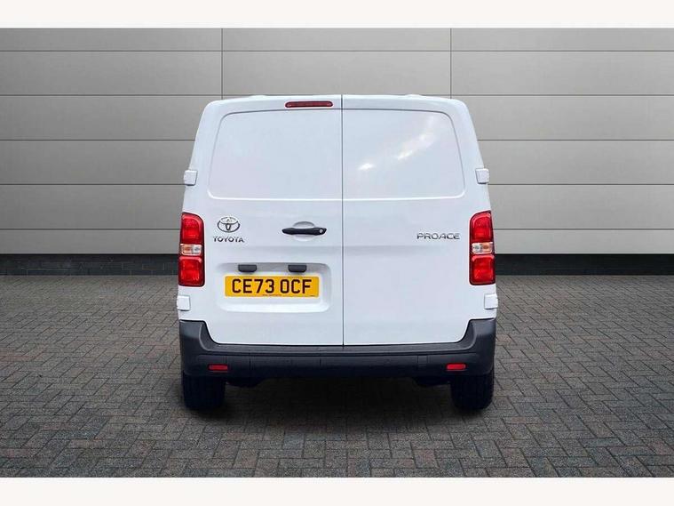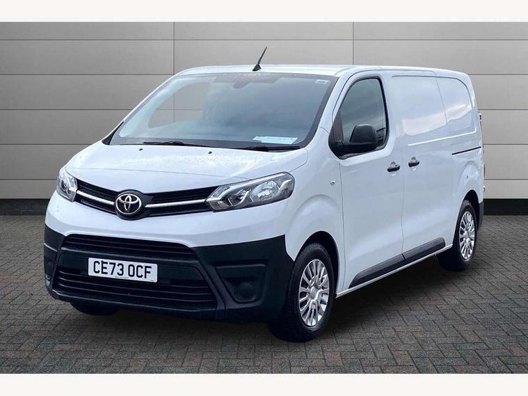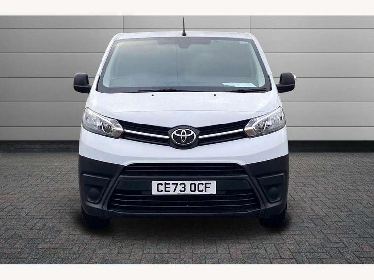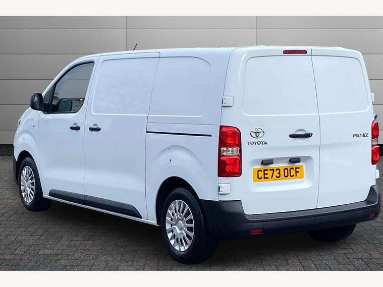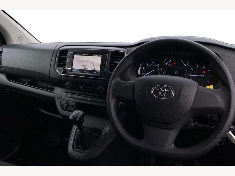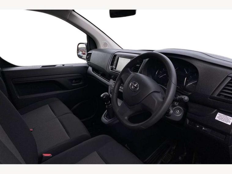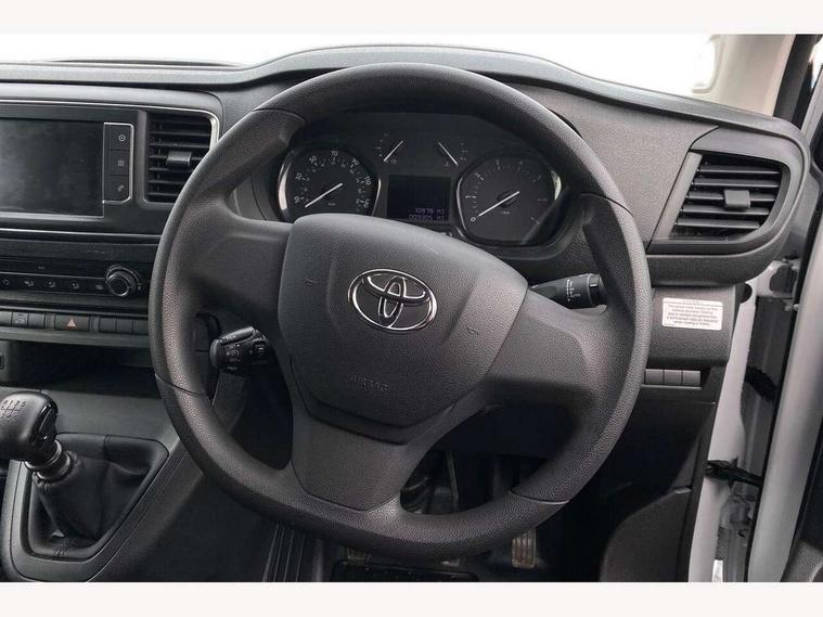 Bluetooth handsfree connectivity, Cruise control, PAS, Tyre pressure warning system (TPWS), 4 speakers, Digital radio (DAB), Radio/CD player, USB connector, 180 degree opening rear doors, Acoustic windscreen, Auto Headlights, Auto wipers, Black bumpers, Black door handles, Black protection moulding on side door, Body Coloured roof, Daytime running lights, Front power windows, Headlight cut-off reminder, Heated door mirrors, LED High mounted stop light, Manually adjustable day/night rear view mirror, Multi reflector halogen headlights, Panel rear wing doors, Power adjustable door mirrors, Rear combination lights, Short Antenna, Smoke tinted (30%) privacy glass on rear passenger window, Two manual sliding side doors, 2 seat front passenger bench, Driver seat armrest, Fabric seats, Front cup holders, Front room lights, Glovebox light, LED Driver and front passenger personal lights, Lighted and chilled upper glove box, Manually reclining and sliding driver and front passenger seats, Open upper dashboard storage compartment, Panel bulkhead with window and protective grille, Storage under passenger bench, Air conditioning and Smart cargo pack - Proace, Parking pack - Proace, Double front passenger airbag, Front passenger airbag on/off switch, Supplement restraint system (SRS) 2 airbags, Alarm, Deadlocks + 2 remote keys, Power door locks, 12V power front outlet, 12v socket in dashboard and rear, Adjustable speed limiter (ASL), Anti lock braking system (ABS), Brake Assist (BA), Stop/start function, Toyota traction select, Vehicle stability control (VSC) and hill start assist control (HAC), Full size spare wheel, Full wheel covers,