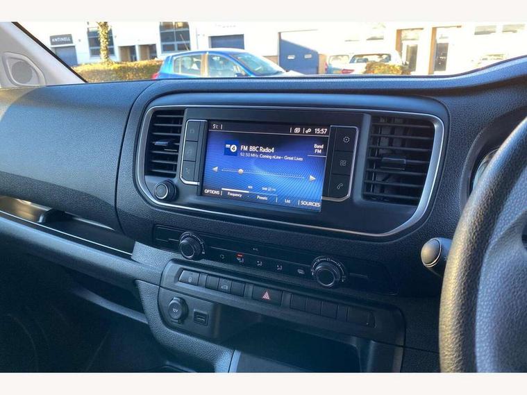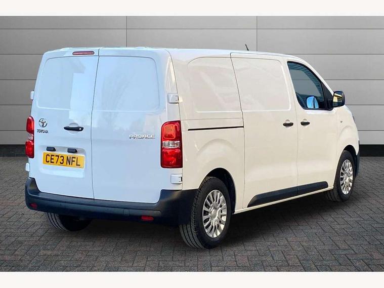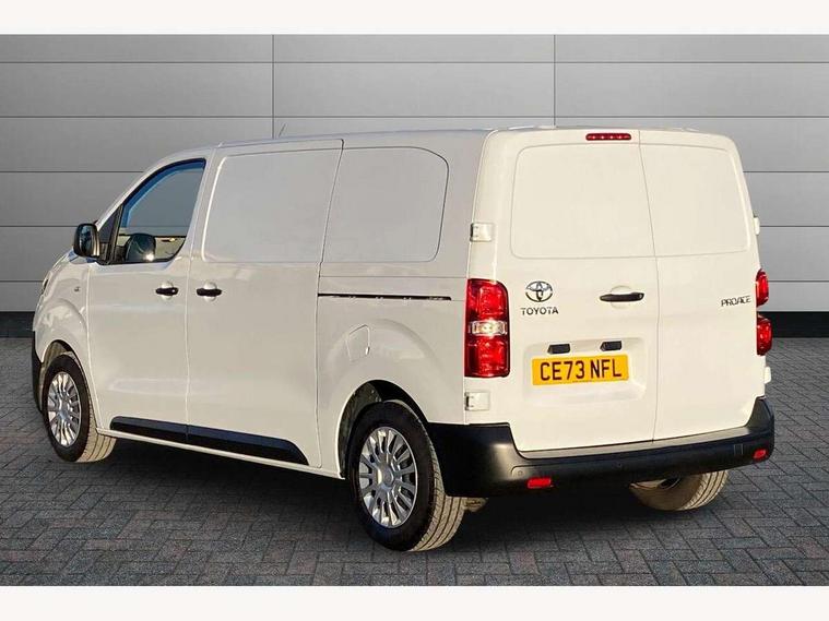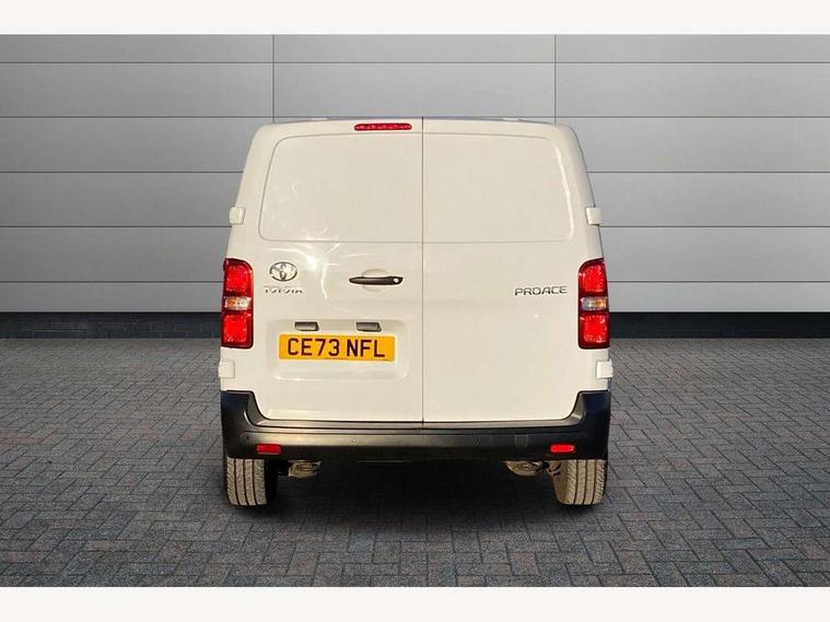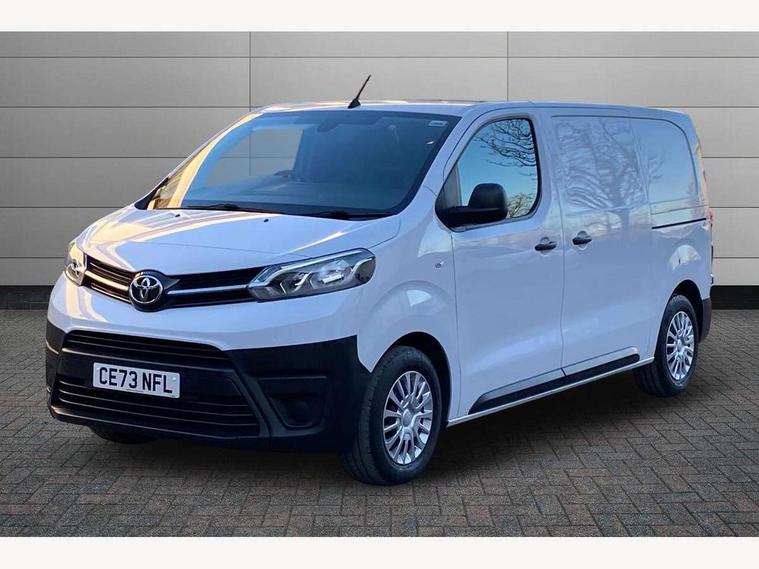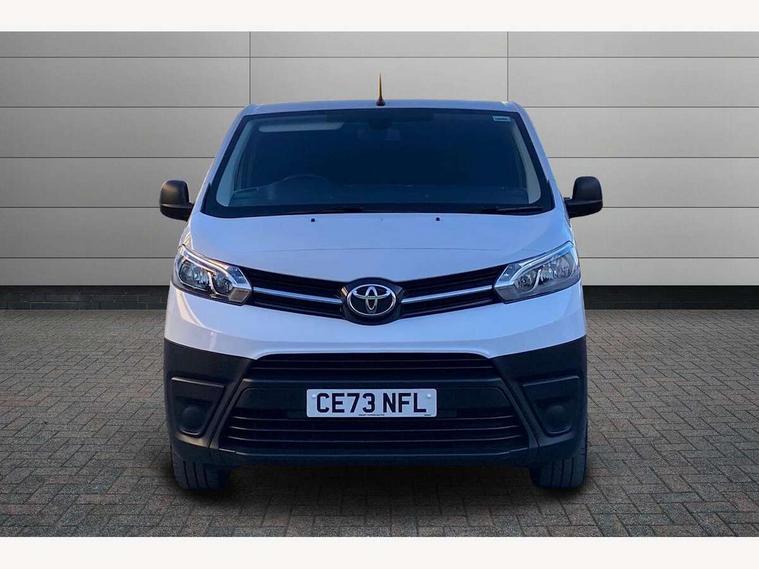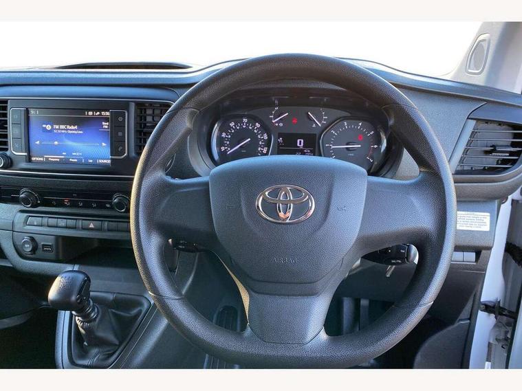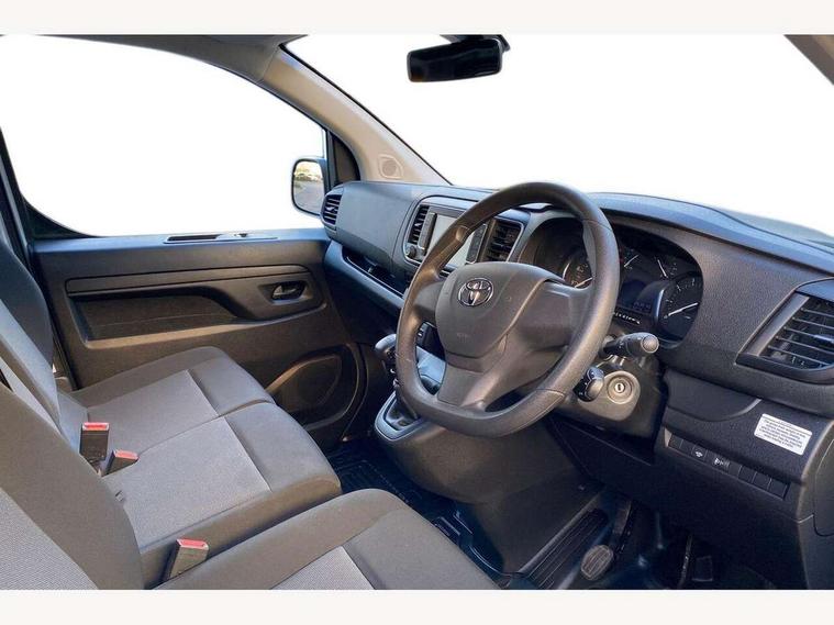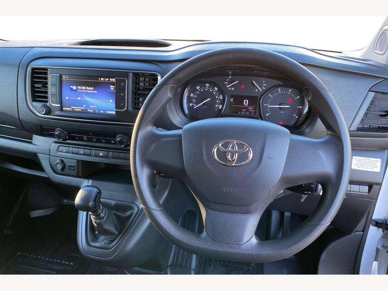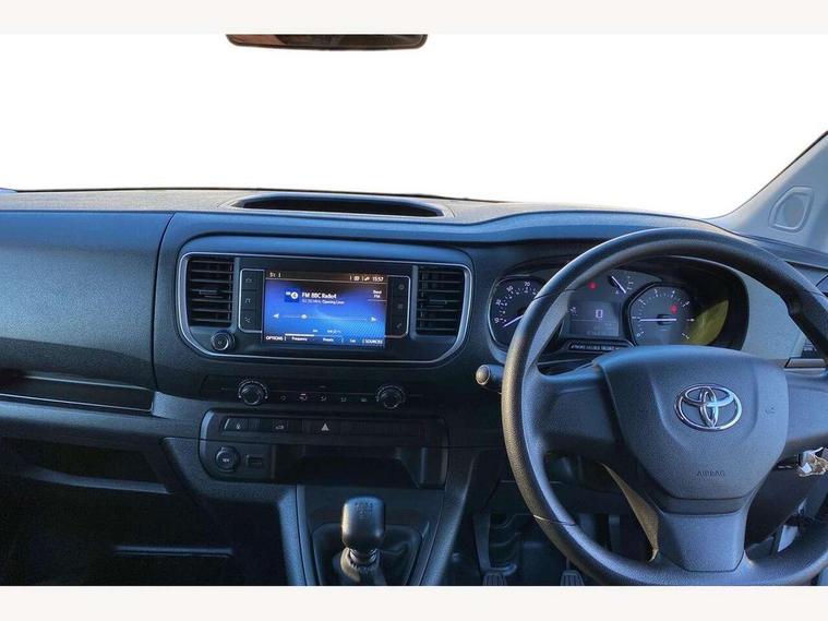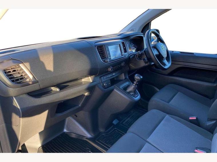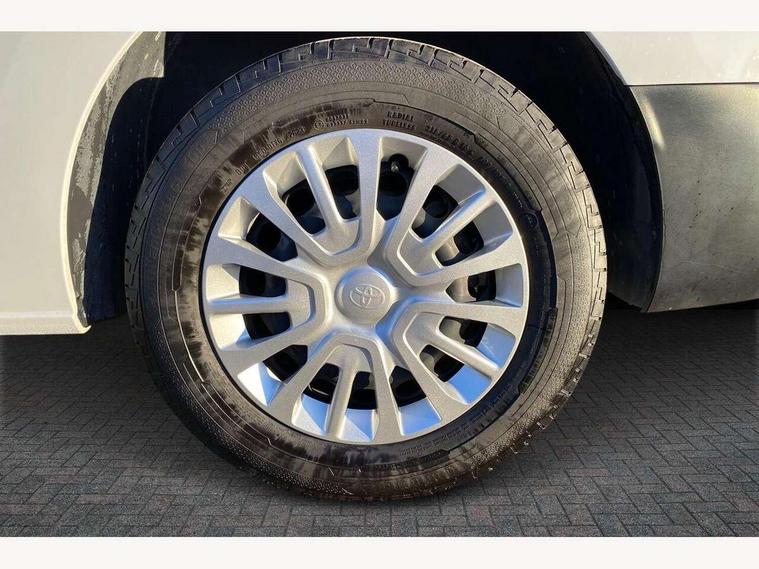 Bluetooth handsfree connectivity, Cruise control, PAS, Tyre pressure warning system (TPWS), 4 speakers, Digital radio (DAB), Radio/CD player, USB connector, 180 degree opening rear doors, Acoustic windscreen, Auto Headlights, Auto wipers, Black bumpers, Black door handles, Black protection moulding on side door, Body Coloured roof, Daytime running lights, Front power windows, Headlight cut-off reminder, Heated door mirrors, LED High mounted stop light, Manually adjustable day/night rear view mirror, Multi reflector halogen headlights, Panel rear wing doors, Power adjustable door mirrors, Rear combination lights, Short Antenna, Smoke tinted (30%) privacy glass on rear passenger window, Two manual sliding side doors, 2 seat front passenger bench, Driver seat armrest, Fabric seats, Front cup holders, Front room lights, Glovebox light, LED Driver and front passenger personal lights, Lighted and chilled upper glove box, Manually reclining and sliding driver and front passenger seats, Open upper dashboard storage compartment, Panel bulkhead with window and protective grille, Storage under passenger bench, Air conditioning and Smart cargo pack - Proace, Parking pack - Proace, Double front passenger airbag, Front passenger airbag on/off switch, Supplement restraint system (SRS) 2 airbags, Alarm, Deadlocks + 2 remote keys, Power door locks, 12V power front outlet, 12v socket in dashboard and rear, Adjustable speed limiter (ASL), Anti lock braking system (ABS), Brake Assist (BA), Stop/start function, Toyota traction select, Vehicle stability control (VSC) and hill start assist control (HAC), Full size spare wheel, Full wheel covers,