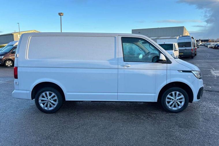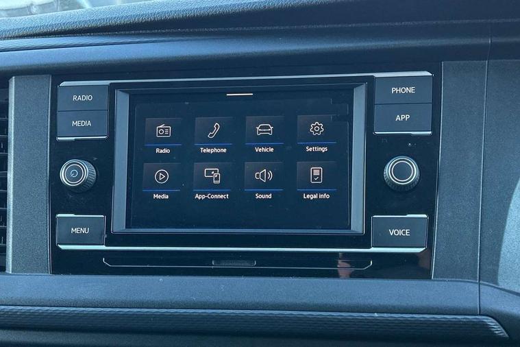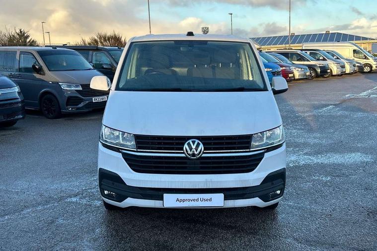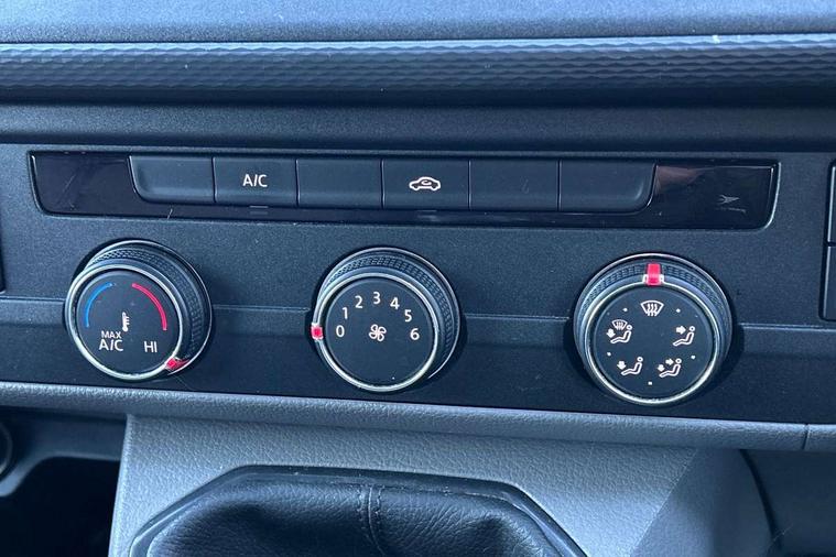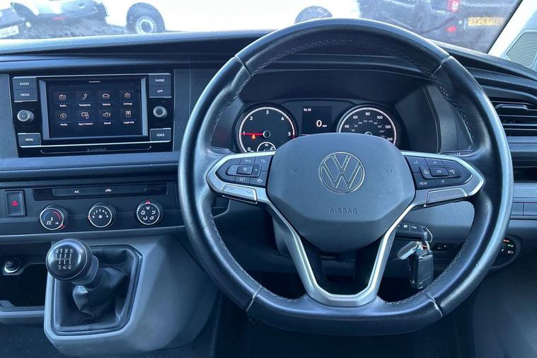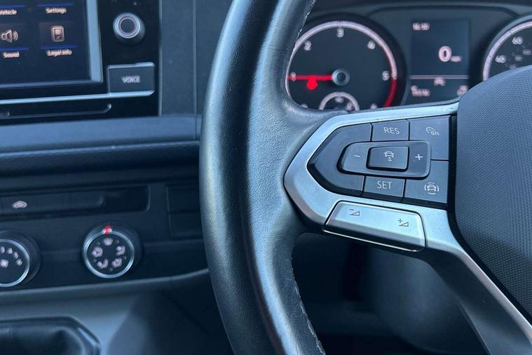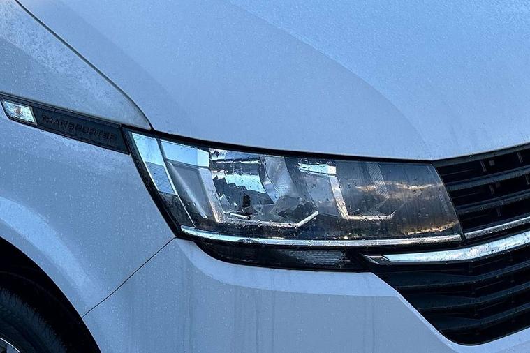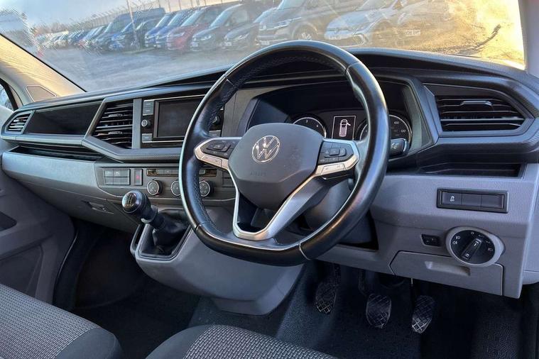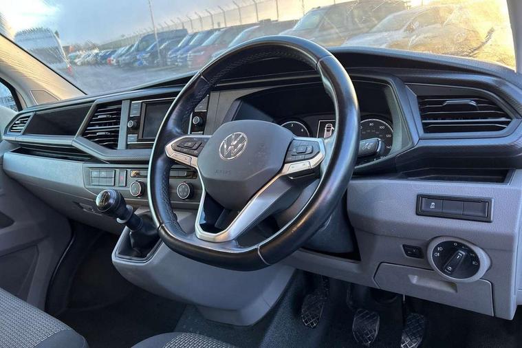 Adaptive cruise control, Cross wind assist, Dimmable illuminated instruments, Driver alert with Multi-function display plus, eCall emergency system, Forward collision warning front assist with autonomous emergency braking, Mobile phone interface, Multi function display plus with black and white display, 2 USB interfaces type C in dashboard, 4 speakers with 2 tweeters and 2 woofers, Composition colour radio with 6.5" touchscreen, Digital radio reception (DAB+), Volkswagen app connect, Automatic headlight control, leaving home and manual coming home feature, Closing rear wing door with unlatching from the inside, Front fog lamps with cornering light, Heat insulating glass (green) in cab and passenger/load compartment, Heated front windscreen, Left convex exterior mirror, Power folding adjustable door mirrors with separately heated, Radiator grille with 2 chrome trims, Rear wing doors without window apertures, Right convex exterior mirror, Transporter nameplate on the rear fender, Windshield wiper intermittent control with rain sensor for windshield wipers, 3 spoke leather wrapped multi function steering wheel, Auto dimming breakaway interior rear view mirror, Comfort headliner in cab, hardboard roof trim in passenger and load compartment, Dust/pollen filter, Front and rear left without window closed side panel in load compartment, Front seats on the right in 1st row of seat, Glove compartment with illumination, Heavy duty tool kit and jack, High partition, Interior plastic loading edge protection, LED Interior lighting in load and passenger compartment, Manual adjustable lumbar support for right single seat in 1st row seats, Refrigerant R134a, Standard lower part dashboard in palladium, Storage compartments on cab seats and reading light, Without right side window apertures in passenger and load compartment, Comfort pack - Transporter, Exterior pack without fog light- Transporter, Non smoker pack - Transporter, 3 point height adjustable seat belts on outer seats cab with electric pretensioners, Driver and front passenger airbag with front passenger airbag deactivation, Warning buzzer and light for driver and front passenger seat belt not fastened, Without child safety lock in passenger compartment, Anti theft alarm system with interior monitoring in cab, backup horn and towing protection, Lockable wheel bolts, 16" chassis with 16" brake system, Diesel particulate filter, Electronic stability control, ABS, ASR with deactivation button, hill start assist and brake assist system, Start/stop system with regenerative breaking, 16" Clayton alloy wheels,
