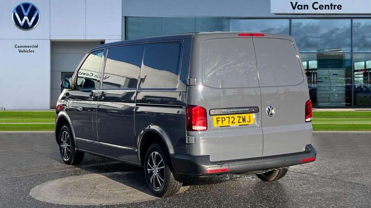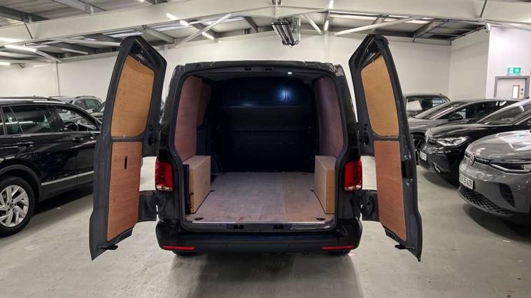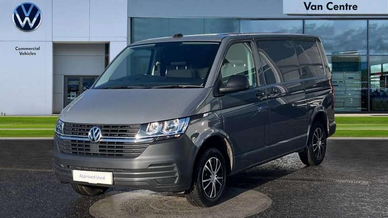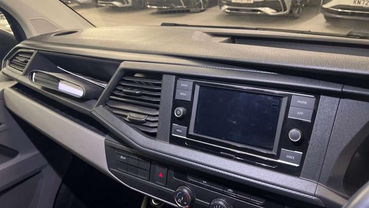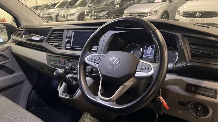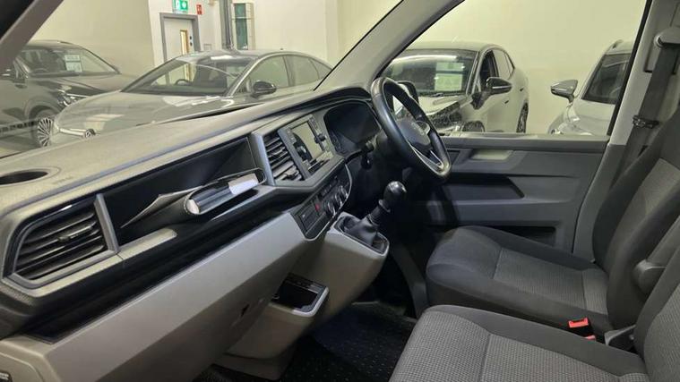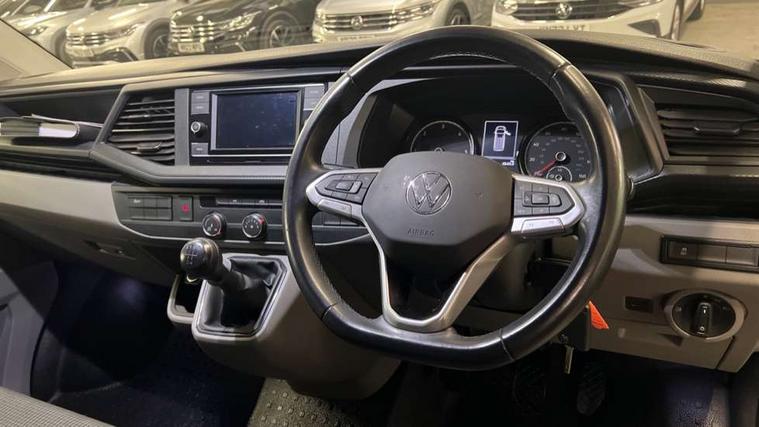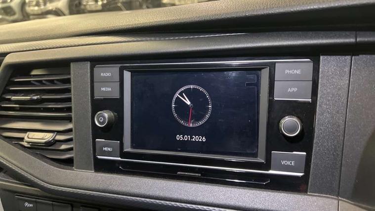 Cross wind assist, Dimmable illuminated instruments, Driver alert with Multi-function display plus, eCall emergency system, Forward collision warning front assist with autonomous emergency braking, Mobile phone interface, Multi function display plus with black and white display, 2 USB interfaces type C in dashboard, 4 speakers with 2 tweeters and 2 woofers, Composition colour radio with 6.5" touchscreen, Digital radio reception (DAB+), Volkswagen app connect, 4 stages windshield wiper intermittent control for windshield wipers, Closing rear wing door with unlatching from the inside, H7 twin halogen headlamps, Heat insulating glass (green) in cab and passenger/load compartment, Heat insulating windshield made of laminated glass, Left convex exterior mirror, Rear wing doors without window apertures, Right convex exterior mirror, Separate Daytime running lights, Transporter nameplate on the rear fender, Unpainted radiator grille with 2 chrome trims, 3 spoke leather wrapped multi function steering wheel, Comfort headliner in cab, hardboard roof trim in passenger and load compartment, Dust/pollen filter, Folding grab handles on roof frame, Front and rear left without window closed side panel in load compartment, Front seats on the right in 1st row of seat, Glove compartment without illumination, Heavy duty tool kit and jack, High partition, Interior plastic loading edge protection, LED Interior lighting in load and passenger compartment, Manual adjustable lumbar support for right single seat in 1st row seats, Standard lower part dashboard in palladium, Without breakaway interior rear view mirror, Without refrigerant, Without right side window apertures in passenger and load compartment, Non smoker pack - Transporter, 3 point height adjustable seat belts on outer seats cab with electric pretensioners, Driver and front passenger airbag with front passenger airbag deactivation, Warning buzzer and light for driver and front passenger seat belt not fastened, Without child safety lock in passenger compartment, Electronic immobiliser, Wheel bolts without wheel locks, 16" chassis with 16" brake system, Diesel particulate filter, Electronic stability control, ABS, ASR with deactivation button, hill start assist and brake assist system, Standard anti drum measures, Start/stop system with regenerative breaking,