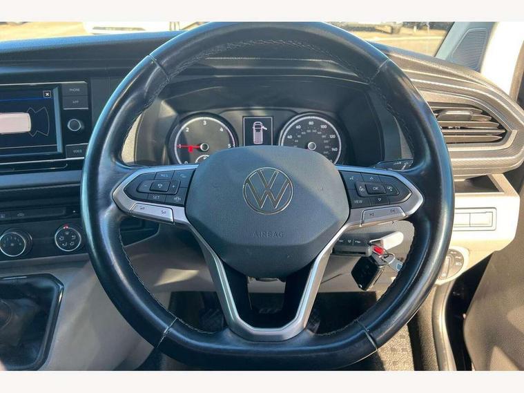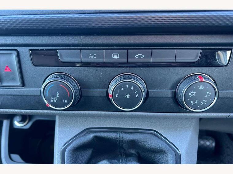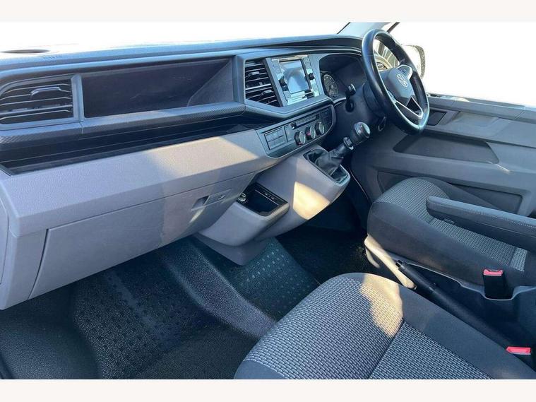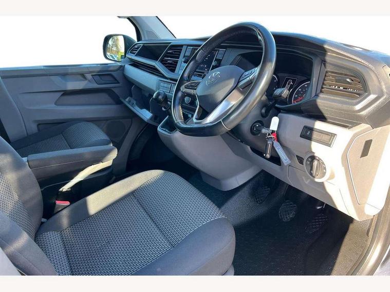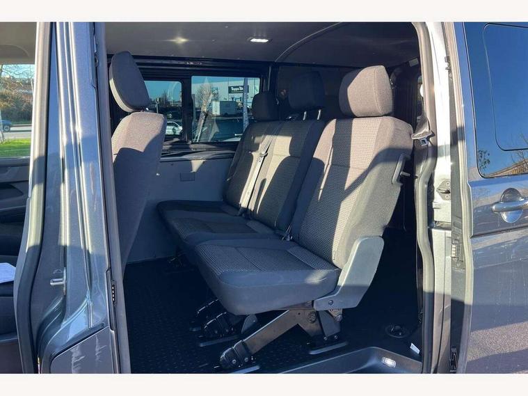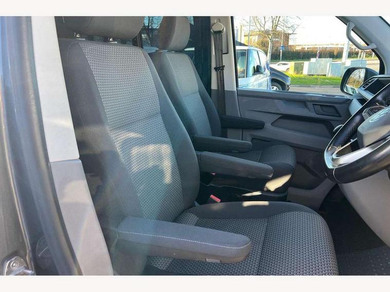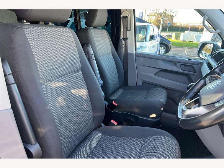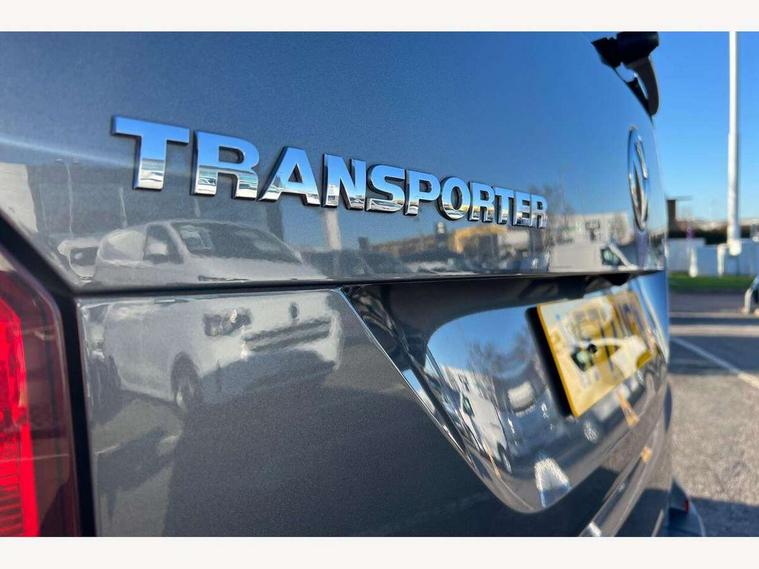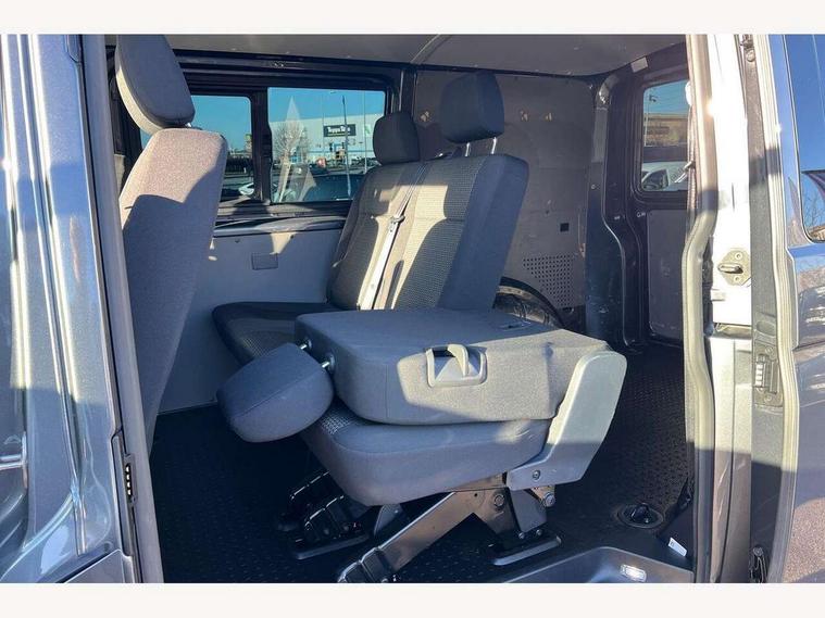 Adaptive cruise control, Child seat anchors ISOFIX and top tether in 2nd row of seats, Cross wind assist, Dimmable illuminated instruments, Driver alert with black and white multi function display plus, eCall emergency system, Forward collision warning front assist with autonomous emergency braking, Headlight range control, Mobile phone interface, Without voice control, 2 USB interfaces type C in dashboard, 4 speakers with 2 tweeters and 2 woofers, Composition colour radio with 6.5" touchscreen, Digital radio reception (DAB+), Volkswagen app connect, Automatic headlight control, leaving home and manual coming home feature, Front fog lamps with cornering light, Green heat insulating glass, Heated front windscreen, Illuminated steps in passenger/load compartment, Left convex exterior mirror, Power folding adjustable door mirrors with separately heated, Privacy glass from the B-pillar and heat-insulating glass in front, Radiator grille with 2 chrome trims, Rear window with heated insulating glass, heated rear window wiper and washer system, Right convex exterior mirror, Tailgate closing with unlatching from the inside, Transporter nameplate on the rear fender, Windshield wiper intermittent control with rain sensor for windshield wipers, Without adhesive film, 3 spoke leather wrapped multi function steering wheel, Additional sound deadening measures in cab and passenger compartment, Auto dimming breakaway interior rear view mirror, Comfort headliner in cab, hardboard roof trim in passenger and load compartment, Dust/pollen filter, Folding grab handles and storage compartments on cab seats, reading light, Front seats on the right in 1st row of seat, Glove compartment with illumination, Heavy duty tool kit and jack, Interior plastic loading edge protection, Lashing rings for load restraint system, LED Interior lighting in load and passenger compartment, Medium height for vehicles with window aperture hardboard side trim panels in passenger/load compartment, Refrigerant R134a, Standard lower part dashboard in palladium, Without partition, Without seats in 3rd row of seats, Comfort pack - Transporter, Exterior pack without fog light- Transporter, Light and vision pack - Transporter, Non smoker pack - Transporter, 3 point height adjustable seat belts on outer seats cab with electric pretensioners, Driver and front passenger airbag with front passenger airbag deactivation, Power operated child safety lock, Warning buzzer and light for driver seat belt not fastened, Anti theft alarm system with interior monitoring in cab, backup horn and towing protection, Lockable wheel bolts, 16" chassis with 16" brake system, Diesel particulate filter, Electronic stability control, ABS, ASR with deactivation button, hill start assist and brake assist system, Speed limiter, Start/stop system with regenerative breaking, 16" Clayton alloy wheels, Wheel trims,