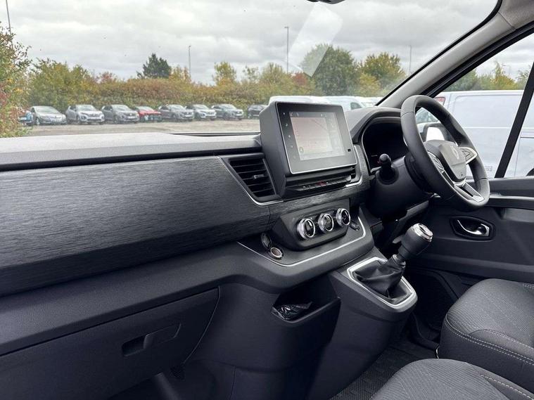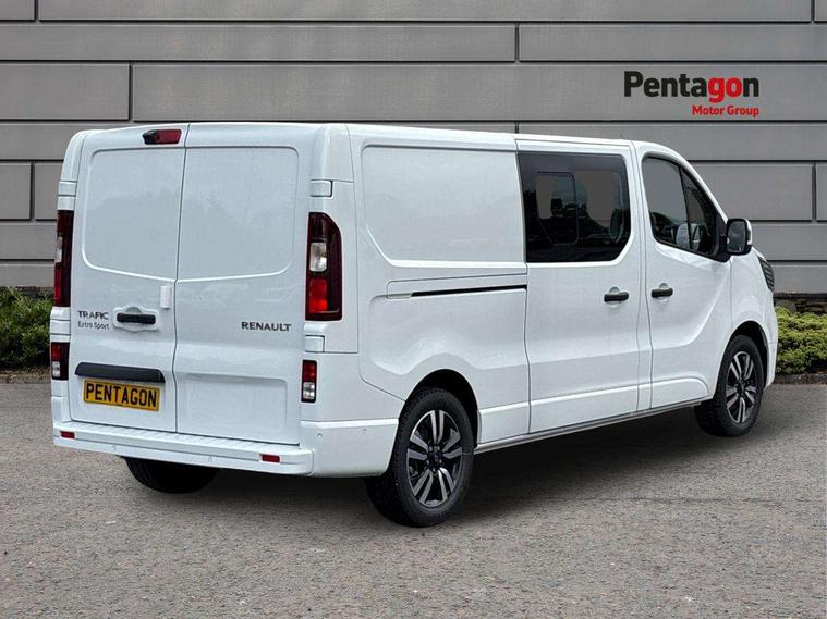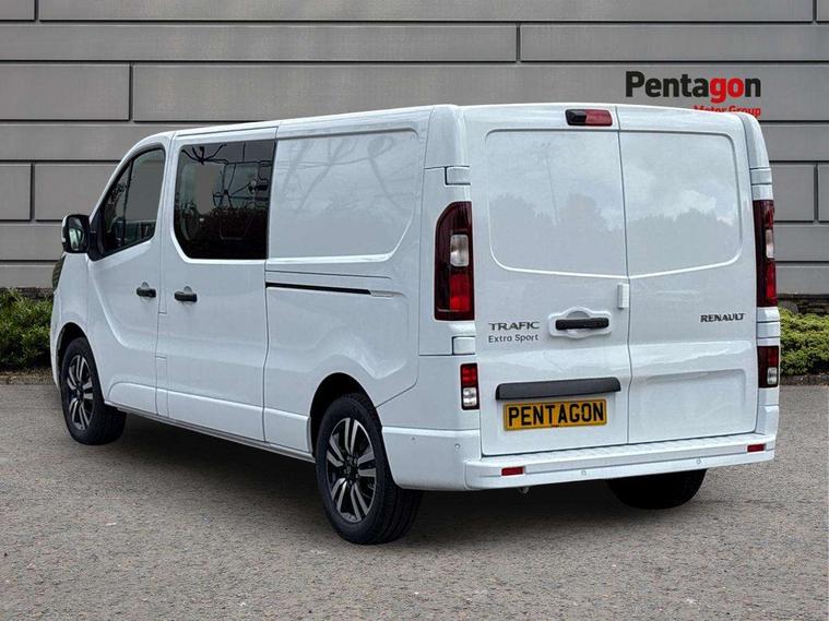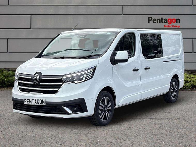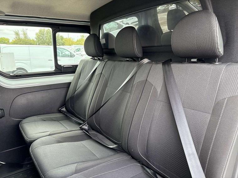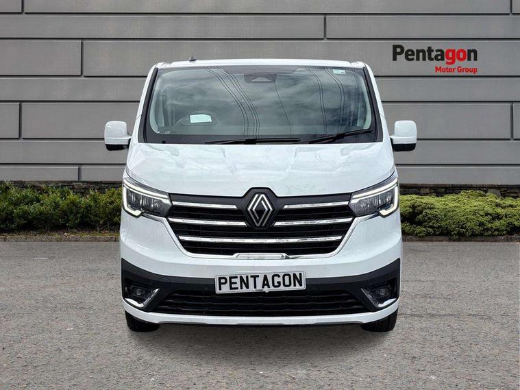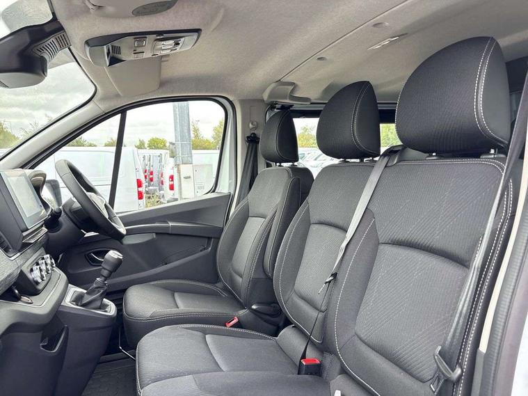 360 degree parking sensors (front, rear and lateral ultra sonic sensors), 7" Colour TFT driver information display, Driver attention alert, Driver drowsiness warning, E-Call - automated emergency call, Easy link navigation with 8" touchscreen DAB radio with bluetooth, USB + aux input, compatible with Apple CarPlay and Android Auto, ECO mode button, Gearshift indicator, Intelligent Speed Assist, Lane departure warning system, PAS, Rear parking camera, Trip computer, Wireless smart phone integration with Android auto & Apple CarPlay, Automatic high beam, Blind spot mirror on passenger sunvisor, Body coloured door mirrors, Body coloured door rail and rear tail light column with chrome grille, Body coloured front bumper, Body coloured side mouldings, Chrome Grille, Electric folding door mirrors, Electric front windows with one touch drivers window, Front fog lights, Full LED headlights with C-shaped DRL, New brand identity, Roof bar fixings, Side loading door - L and R glazed with opening window, Wide view mirror, 12V power socket in front, 16 load anchorage points, 2nd row of 3 passenger seats Individual seats with adjustable headrests, ISOFIX (left & right seat), 2 armrests, Climate control, Closed glovebox, Glazed full bulkhead, Height adjustable drivers seat with armrest and lumbar adjustment, Interior LED cabin lighting, Interior side panels - load area, Interior side panels up to windows, Java cloth upholstery, LED load space lighting, Premium dashboard with horizontal grain and chrome styling, Premium faux leather steering wheel, Look pack - Trafic, Parking pack - Trafic, Visibility pack - Trafic, 3 point height adjustable seatbelts with pretensioners and load limiter, Driver and passenger airbags, Driver and passenger seatbelt reminder, Front lateral and curtain airbags and passenger airbag with deactivation, Alarm - Thatcham T1 volumetric alarm, Alcohol interlock pre-device, Deadlocking, Electronic immobiliser, Hands free key card with push button stop/start function, Keyless entry system, Remote central locking, 20L AdBlue tank, 4 disc brakes, 6 speed gearbox, 80 litre fuel tank, ABS with EBD (Electronic Brake force Distribution), Active emergency braking system, ESC (Electronic Stability Control) with Hill Start Assist and Grip Xtend, 17" Avens diamond cut alloy wheels,