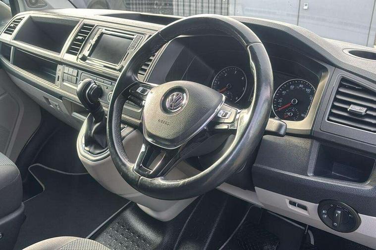 Bluetooth connectivity, Collision prevention assist, Digital clock, Driver alert with Multi-function display plus, Gearshift indicator, Headlight range control, Lights on warning buzzer, PAS, Rear door interior release lever, Rev counter, SD card slot, Service indicator, 4 speakers, Aux input socket, DAB radio/CD player, USB connection, 180 degree opening rear doors, 2 speed windscreen wipers/intermittent wash, 8 securing points for roof load rack system, Auto dimming rear view mirror, Automatic coming/leaving home lighting function, Electric front windows, Front and rear towing rings, Front fog lights with cornering function, Green heat insulating glass, Heat reflective glass, Heated front windscreen, Laminated windscreen, Rear wing doors without windows, 1 coat hook, 1 hook on lower dash on front passenger side, 2 rear interior lights, switchable by door, 2 storage trays in dashboard, 2 sun visors folding and pivoted, 6 lashing points for securing loads, Additional 12v accessory socket, Cab interior light, Drinks holder, Driver's seat armrest, Dust/pollen filter, Front door pockets with bottle holder, Full height hardboard side lining, Half height hardboard side lining, Half height load lining, Height adjustable head restraints, Height and rake adjustable steering column, Interior entry steps, Interior roof trim - hardboard, Interior roof trim as headliner, Locking glovebox, Multifunction leather steering wheel, gearknob and gaiter, Open storage compartment in dash panel including mobile phone holder, Passenger seat with reach and rake adjustment, Sheet steel flooring, Side roof frame trim, Storage box integrated in roof headliner, Storage compartments in doors, Storage compartments in outer side of driver & passenger seats, Storage net on lower dash passenger side, Cab comfort pack - Transporter Van, Electric pack A - Transporter, Exterior pack - Transporter, Lights and vision pack - Transporter, Non smoker pack, 3 point inertia reel belt on all seats, Brake pad wear indicator, Front passenger airbag deactivation, Height adjustable seatbelts with tensioners, Anti-theft alarm with rear control in cab, backup horn and towing protection, Locking wheel bolts, 70 litre fuel tank, ABS with electronic brake distribution, ASR traction control, Diesel particulate filter, EDL, Engine braking control (MSR), ESP, Hill start assist, Traction control, Platinum grey trim, 17" Devonport alloy wheels,