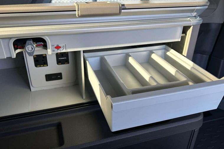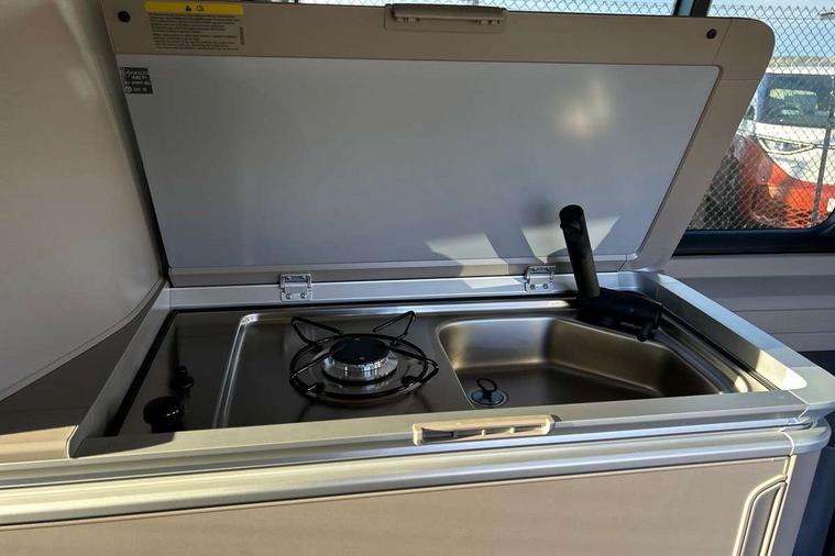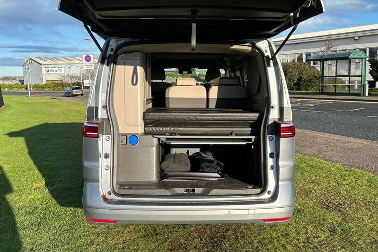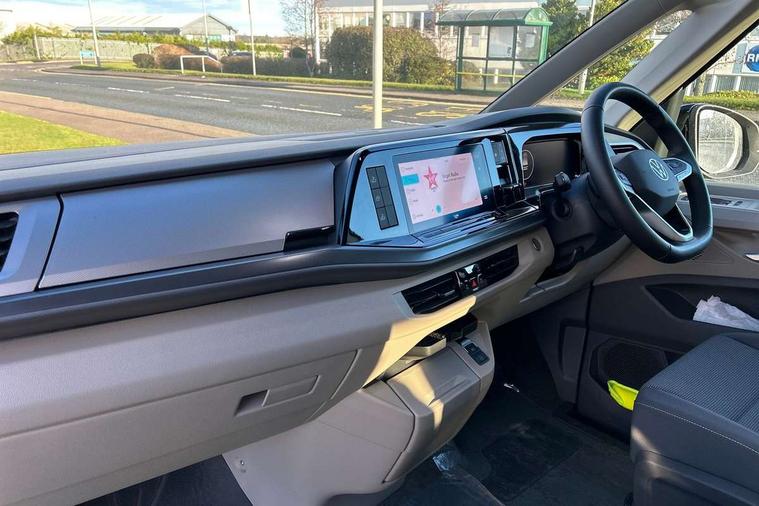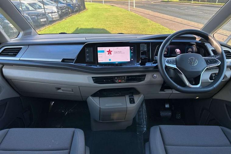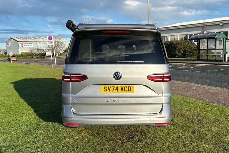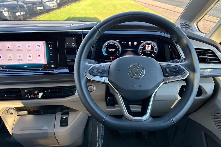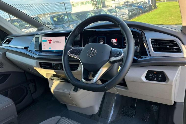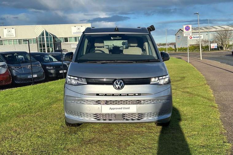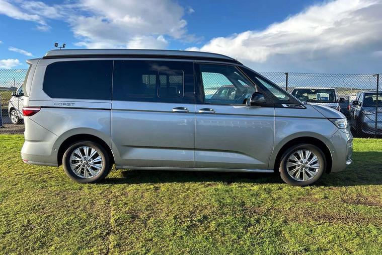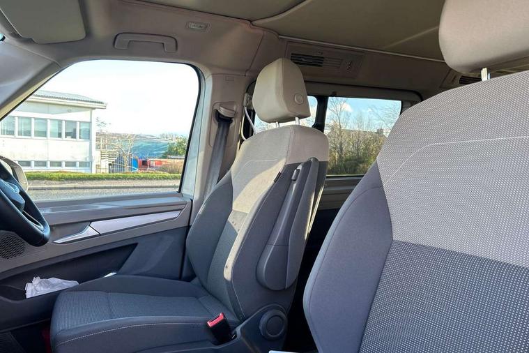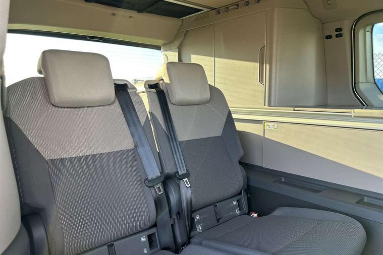 AppConnect including wireless Apple CarPlay, California on tour app, Digital cockpit pro, eCall emergency system, Function control unit, IDA voice assistant and voice enhancer, Lane keeping system Lane Assist, Mobile phone interface, Multifunction camera, Online service, with OCU, with head unit coding, without WFS federation, PAS, Preparation for online services, Tailgate with window aperture, Traffic sign recognition, Turn assist with evasive assistance, 2 USB-C ports at the front, 4 USB-C charging sockets in the passenger compartment, 8 passive speakers, Digital radio reception (DAB+), 65% light absorbing privacy glass, A-pillar, D pillar and tailgate, All weather light, Ambient lighting in door area, Electro hydraulic elevating roof, with three windows including one front passengers panorama opening, canvas in Basalt Grey, Four speed control for windscreen wipers, Front window in laminated safety glass with heat and noise-insulating, Heated windscreen, High gloss black door mirrors, Molding between headlamps painted to glossy black, Nameplate set California, Rear boot, Sliding door on the left passenger compartment, Sliding door on the right passenger compartment, Sliding window in front and fixed window in rear in rear passenger compartment at right, Tailgate closure without unlocking function from the inside, Windscreen wiper intermittent control, 2 single seats with integrated seatbelt and sleeping mat, 230V interver with socket on driver seat, Additional interior noise attenuation, Alcohol interlock, Armrest on front swivel seats in both sides with electric lumbar support, Darkening roller blinds and thermo mats, Drawers under the seats in the driver and passenger compartment + 2 waste bins, Front and rear headrests, Kitchen with outdoor folding table for cooking in décor 1, Lockable glove compartment without lighting, Multifunction leather steering wheel with paddle shifters, Plastic floor covering in passenger/load compartment, Single front passenger seat, Sleeper seats, Surround lighting in door area, Swivel seat on left with height adjustable including drawer, Swivel seat on right with height adjustable including drawer, 3x3 point automatic seatbelts at the rear outside with ECE label, with/without belt tensioner, Advanced driver attention, Autonomous emergency braking front assist with pedestrian and cyclist monitoring, Driver and front passenger airbags with front passenger airbag deactivation button, Drowsiness detection, First aid kit with warning triangle and safety vest, Front disc brakes, Height adjustable three point automatic seatbelts at front with belt and end fitting tensioners, Side and curtain airbags for driver and front passenger, curtain airbags for outer seats in rear, centre airbag in front, Swerve support and oncoming vehicle braking when turning, Tyre pressure loss indicator, Anti theft alarm system with interior monitoring in cab, backup horn and towing protection, Central locking system with keyless locking and starting system keyless advanced with safelock, Lockable wheel bolts, Scale light grey decorative inlays, Full wheel covers, Tool kit, Trims for alloy wheels, Tyre mobility kit,
