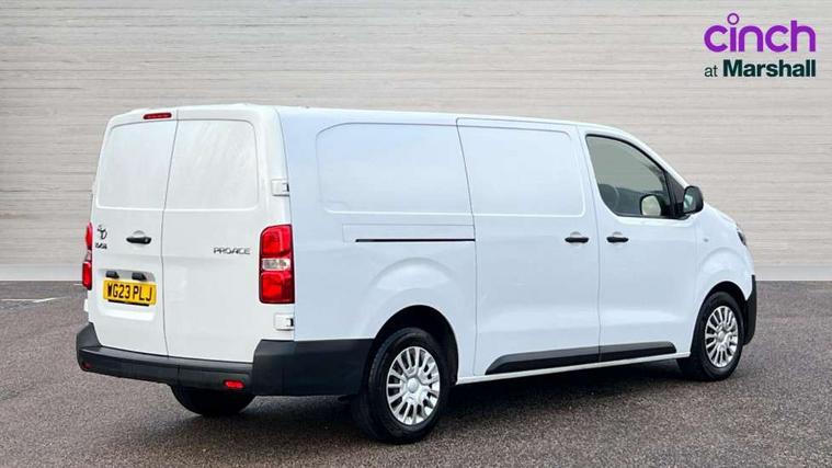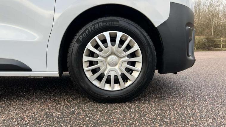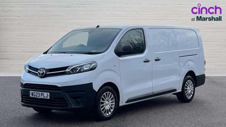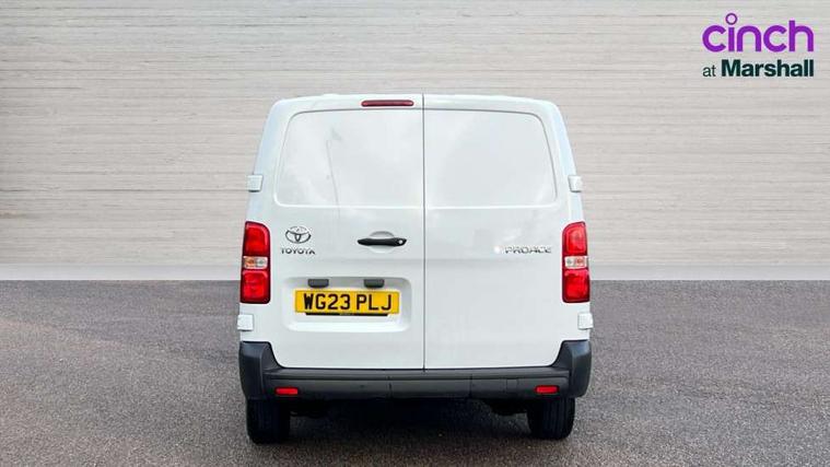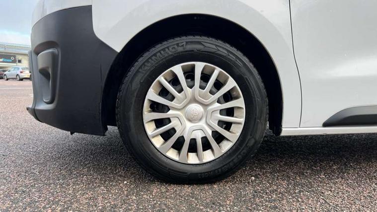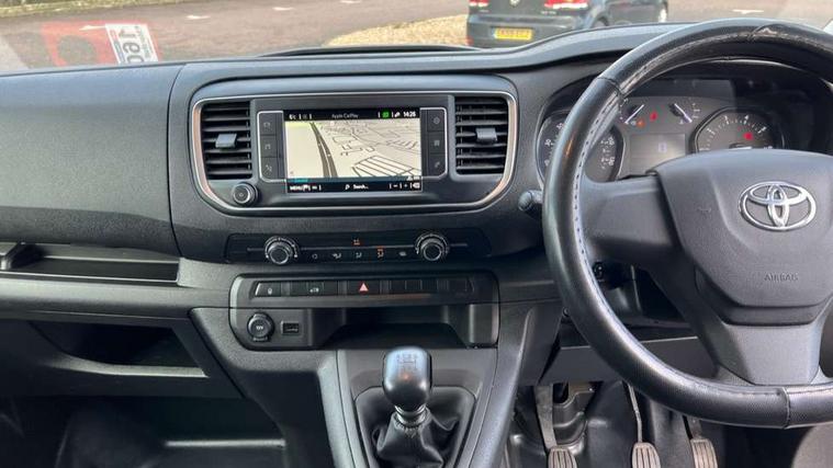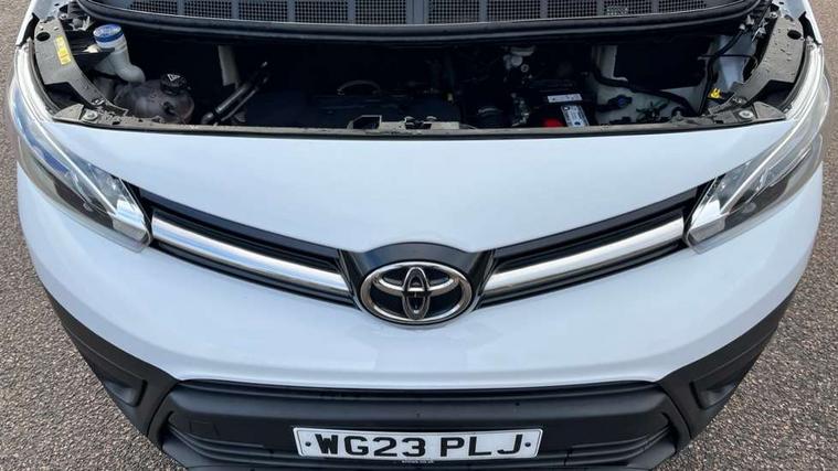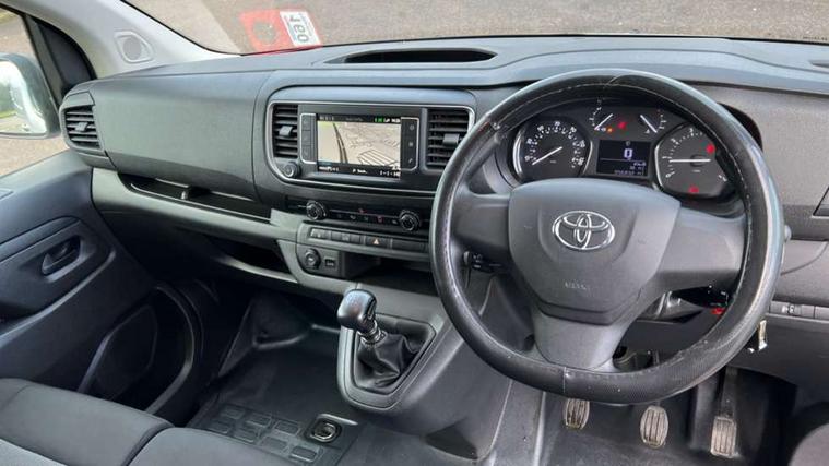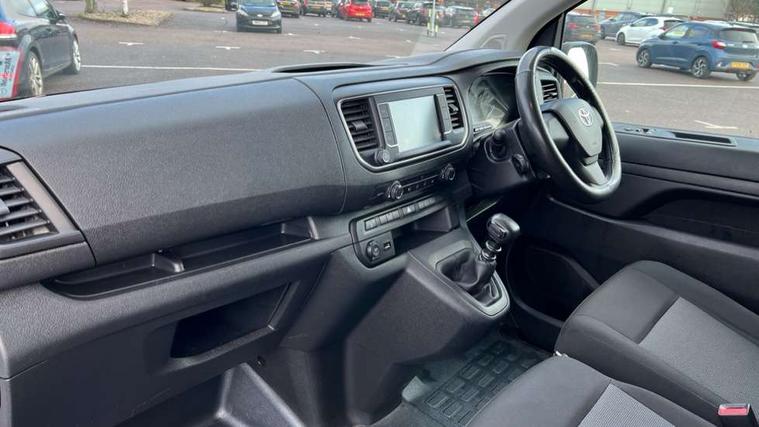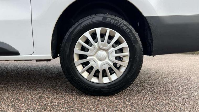 Bluetooth handsfree connectivity, Cruise control, PAS, Tyre pressure warning system (TPWS), 4 speakers, Digital radio (DAB), Radio/CD player, USB connector, 180 degree opening rear doors, Acoustic windscreen, Auto Headlights, Auto wipers, Black bumpers, Black door handles, Black protection moulding on side door, Body Coloured roof, Daytime running lights, Front power windows, Headlight cut-off reminder, Heated door mirrors, LED High mounted stop light, Manually adjustable day/night rear view mirror, Multi reflector halogen headlights, Panel rear wing doors, Power adjustable door mirrors, Rear combination lights, Short Antenna, Smoke tinted (30%) privacy glass on rear passenger window, Two manual sliding side doors, 2 seat front passenger bench, Driver seat armrest, Fabric seats, Front cup holders, Front room lights, Glovebox light, LED Driver and front passenger personal lights, Lighted and chilled upper glove box, Manually reclining and sliding driver and front passenger seats, Open upper dashboard storage compartment, Panel bulkhead with window and protective grille, Storage under passenger bench, Air conditioning and Smart cargo pack - Proace, Parking pack - Proace, Double front passenger airbag, Front passenger airbag on/off switch, Supplement restraint system (SRS) 2 airbags, Alarm, Deadlocks + 2 remote keys, Power door locks, 12V power front outlet, 12v socket in dashboard and rear, Adjustable speed limiter (ASL), Anti lock braking system (ABS), Brake Assist (BA), Stop/start function, Toyota traction select, Vehicle stability control (VSC) and hill start assist control (HAC), Full size spare wheel, Full wheel covers,
