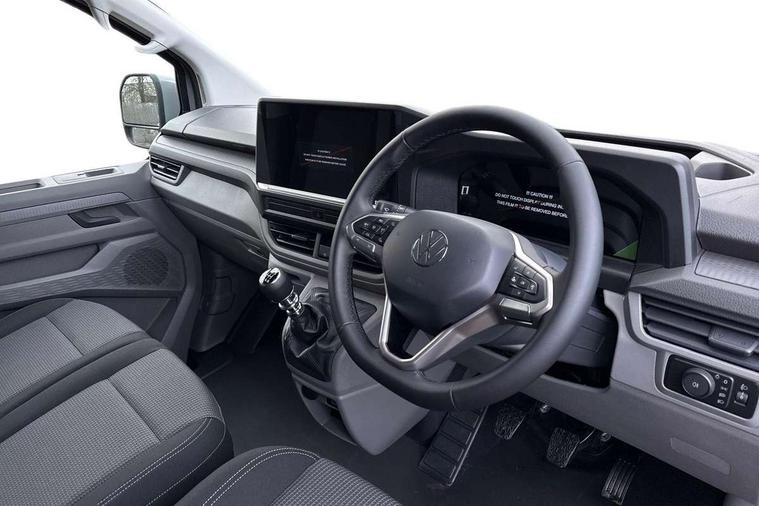 12" digital drivers display, 13" touchscreen infotainment display with wireless app connect and DAB radio, 5G Modem, Adaptive cruise control, Apple CarPlay and Android Auto, Dynamic road sign display, eCall emergency system, Electromechanical speed sensitive power steering, height and longitudinally adjustable steering column, Lane and blind spot assist with exit warning system, Preparation of VW connect and connect plus, Wireless mobile phone charging, Wrong way driver warning, Body colour bumpers, Body coloured door handles, Body coloured door mirrors, Body coloured radiator grille, Electrically heated, adjustable and folding door mirrors, Heat reflecting side window glass, Mud flaps front and rear, Rear Transporter nameplate in black grained decorative trim, Vehicle opening configuration 1x 1st row of seats, 2x all doors, 12V outlet in centre console and 12V outlet on rear right D-pillar, 2x 15-W USB data/charging ports in dashboard and 1x USB-C, 1x USB-A center bottom, 2x LED lights in load compartment, 3x additional super bright LED lights in load compartment, 4 way height and tilt adjustable head restraints, 5 additional USB-C charging ports, Black plastic scuff plate for sliding door in cargo without illumination, Cabin interior lighting, Glasses compartment in driver side roof, Grab handle on A-pillar passenger side, Illuminated lockable glovebox, Lashing rings for reinforced floor covering, Leatherette gear lever, Narrow centre console with cup holder and compartment for mobile phone, Overhead storage compartment, Rubber floor covering in cab, Striped fabric upholstery, Without passenger seats in load compartment, Driver and front passenger airbag with front passenger airbag deactivation, Dual tone horn, Front and curtain airbags for driver and front passenger, Seat belt pretensioner for driver seat, Anti theft alarm system with interior monitoring in cab, backup horn and towing protection, Electronic immobiliser, Lockable wheel bolts, Preparation for alcohol ignition interlock, 5+ Promise, Alternator - 230A, Electromechanical brake booster, Electronic stability control, ABS, ASR with deactivation button, hill start assist and brake assist system,