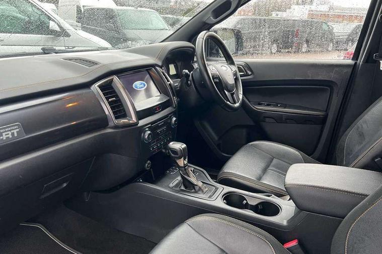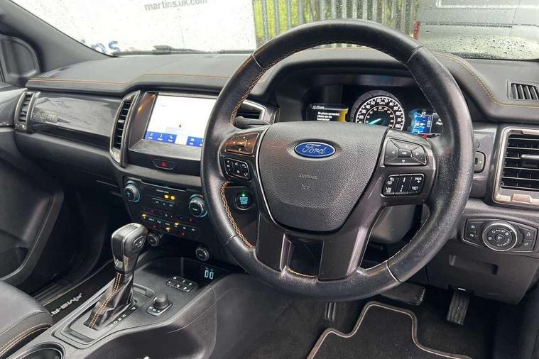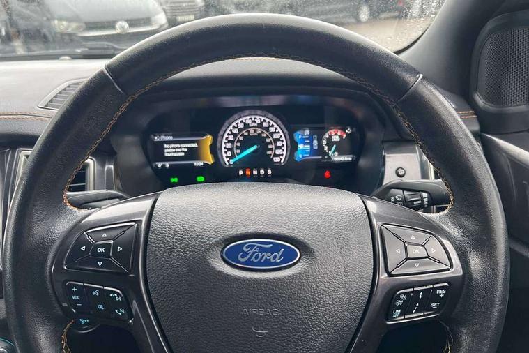 2 key fob, Collision mitigation braking system, Electric power assisted steering, Fixed rear view camera, Intelligent speed assistance, Lane keeping aid, Traffic sign recognition, Trip computer, Body coloured plastic front bumper, Boulder grey exterior door handle, Boulder grey exterior door mirror, Boulder grey radiator grille, Daytime running lights, Dual power heated fold back door mirror with puddle lamp and signal, Electrically operated windows with one shot driver's window, Electrochromic interior mirror, Front splash guard and mud flaps, Heated windshield and rear window, High mounted stop lamp with cargo area light, LED Front fog lamp, LED projector headlamps, Moulded in colour tailgate handle, Painted front fender grille, Privacy glass, Rain sensitive windshield wipers, Rear bumper chrome under-bar, Rear bumper step in boulder grey, Rear mudflaps, Roof rails, Side step with brushed inserts, Tailgate - Easy-lift/lower mechanism, Under hood engine cover, Underbody protection, Centre console coolbox, Chrome interior door handle, Driver seat back mounted map pocket, Dual control system - Electronic air temperature control (EATC), Ebony headliner, Heated front seat, Journey grain partial leather upholstery with Wildtrak logo, Leather gearknob, LED ambient interior lighting, Power adjustable 8 way driver seat, Premium front and rear floor mats with Wildtrak logo, Reach and rake adjustable steering column, Roof storage for driver sunglasses, Sport leather stitched steering wheel, Tie down rails and rope hooks, Wildtrak door trim panel insert, ICE feature pack 129 - Ranger, Driver and front passenger airbag, side airbag, curtain airbag and driver knee airbag, ISOFIX child safety seat attachment, Tyre pressure sensors, Double locking power door lock with flip key, Immobiliser, Locking wheel nuts, Passive anti theft system, Passive keyless entry and start system, Power tailgate lock, Spare wheel lock, Thatcham category 1 alarm security system, ABS, ESP and roll over mitigation, Emergency brake assist, Engine start/stop system, Locking rear axle, Power converter,