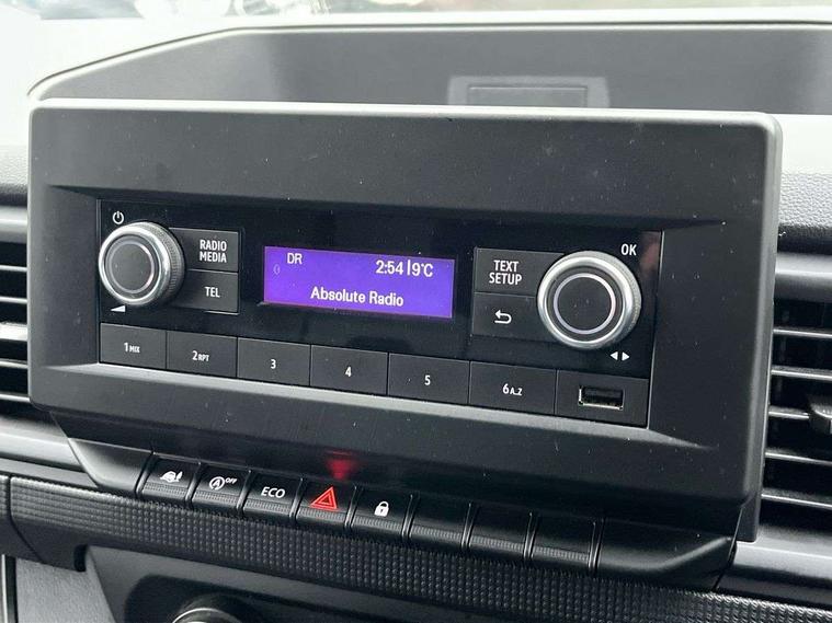 Cruise control with speed limiter, ECO mode button, Gearshift indicator, PAS, Trip computer, Black door mirrors, Black door rail, Black front bumper, Black rear tail column, Electric front windows with one touch drivers window, Full LED headlights with C-shaped DRL, Heated with electric adjustment door mirrors and external temperature sensors, Roof bar fixings, 12V power socket in front, 16 load anchorage points, Closed glovebox, Dashboard with geometric grain, Height adjustable drivers seat with armrest and lumbar adjustment, Interior cabin lighting, Kompo cloth upholstery, Passenger seat bench, Reach and rake adjustable steering column, 3 point height adjustable seatbelts with pretensioners and load limiter, Driver and passenger seatbelt reminder, Driver's airbag, Alarm - Thatcham T2 volumetric alarm, Deadlocking, Electronic immobiliser, Remote central locking, 12v socket in loadspace, 20L AdBlue tank, 4 disc brakes, 80 litre fuel tank, ABS with EBD (Electronic Brake force Distribution), ESC (Electronic Stability Control) with Hill Start Assist and Grip Xtend,