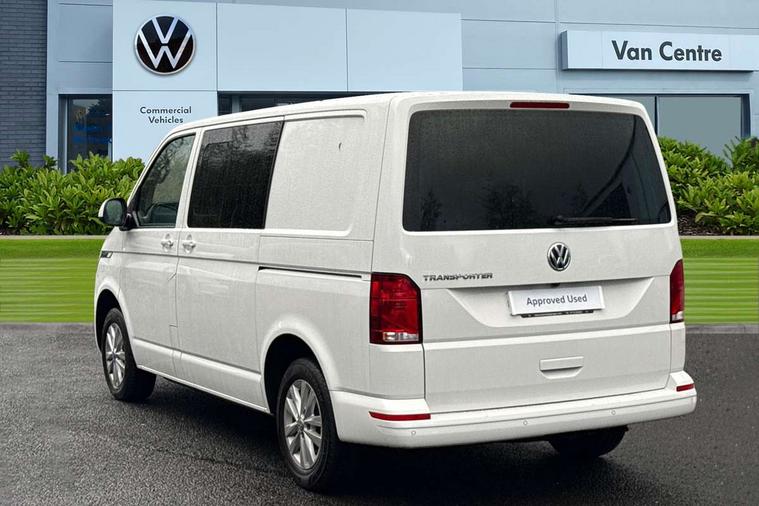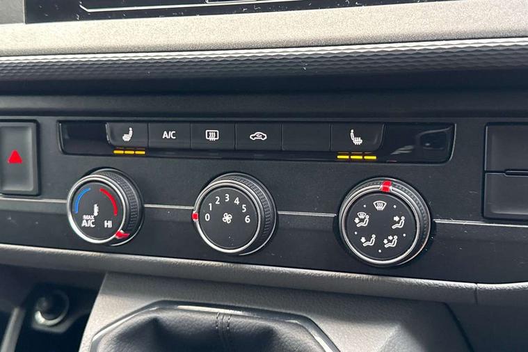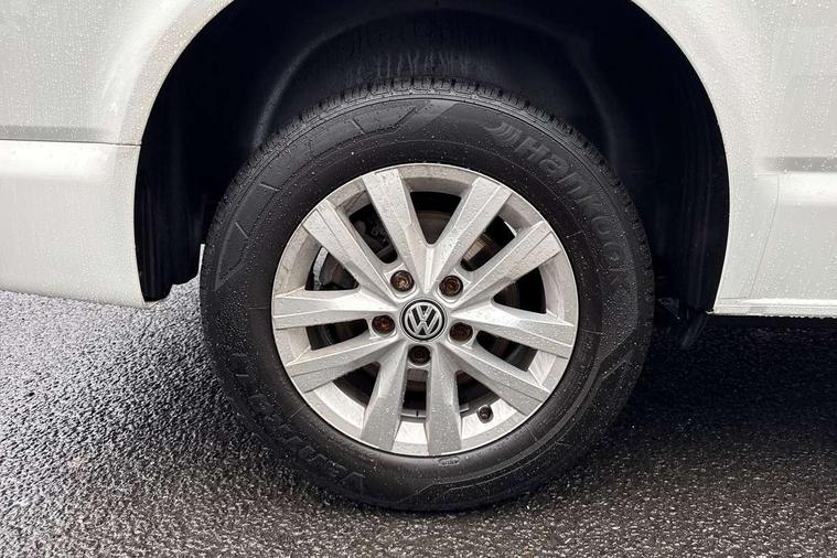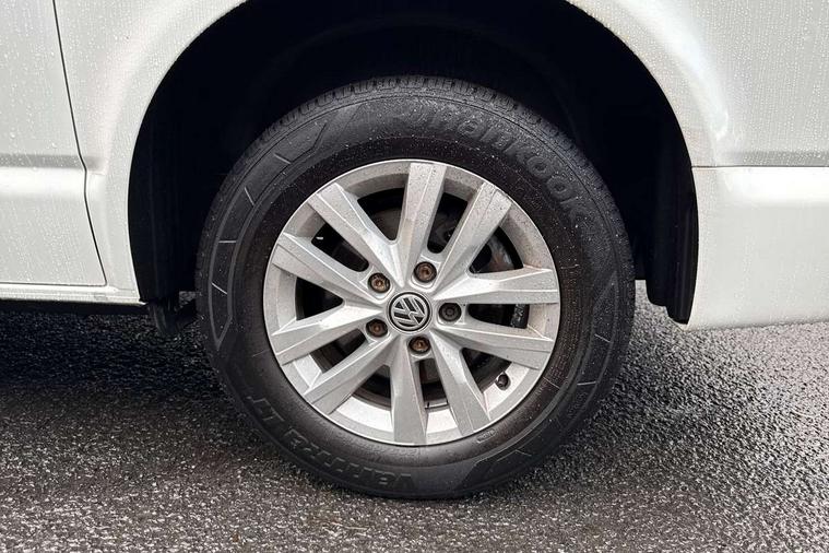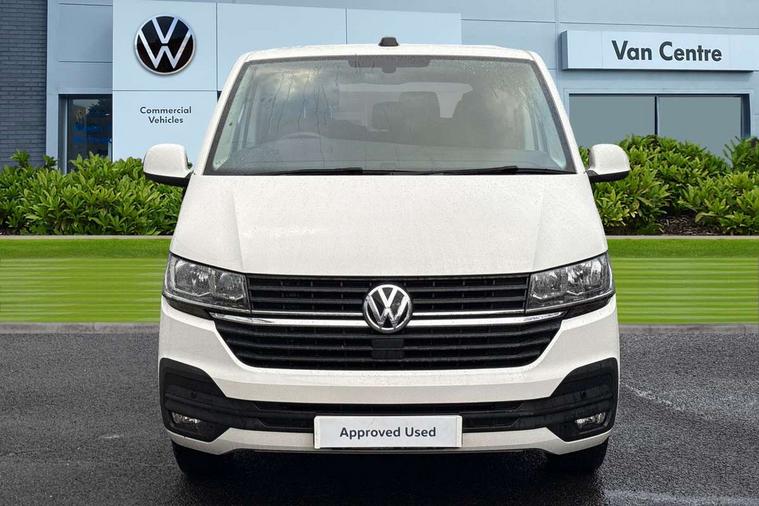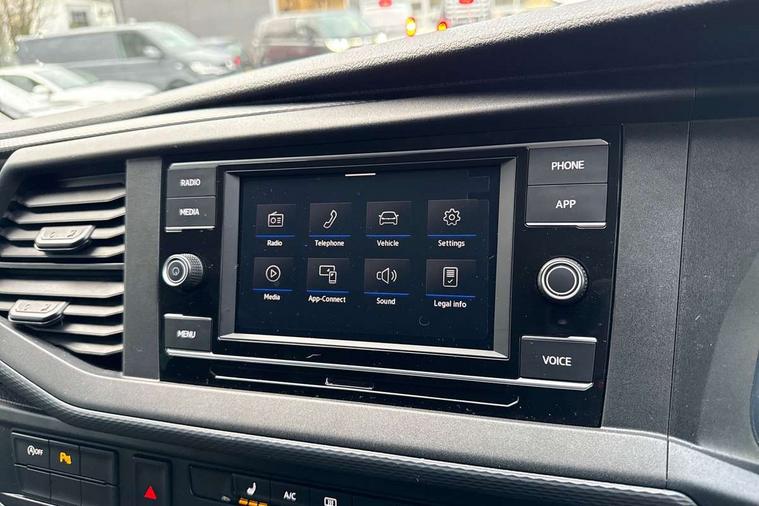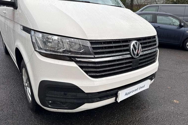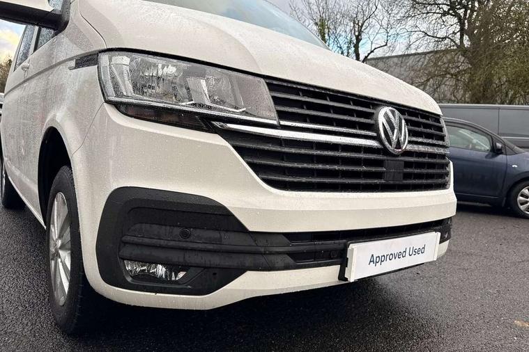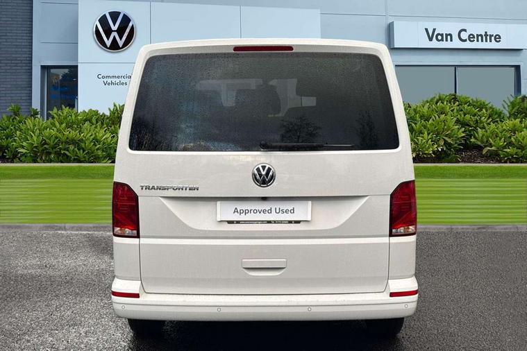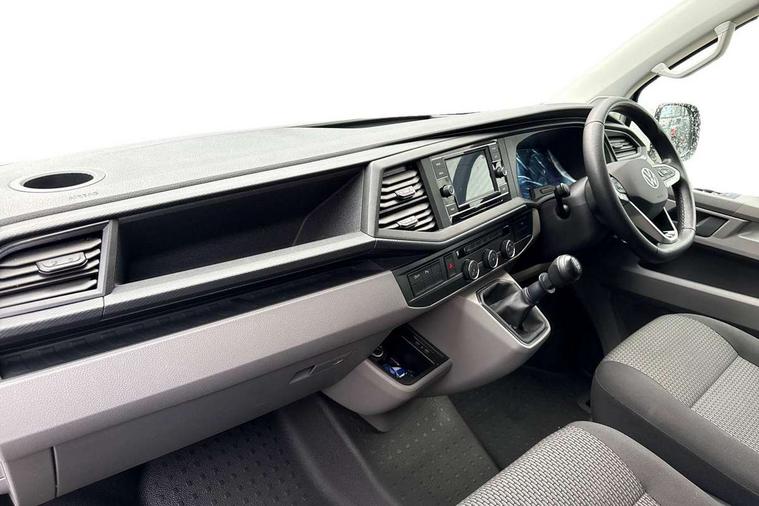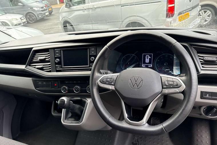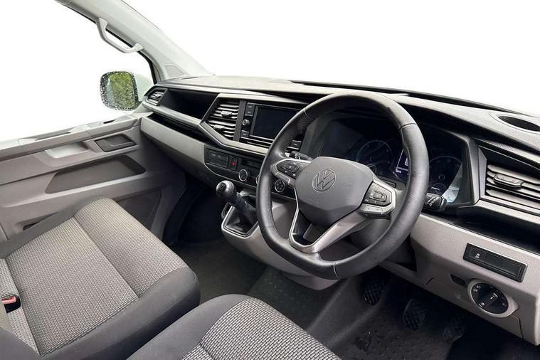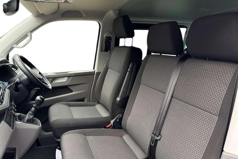 Adaptive cruise control, Child seat anchors ISOFIX and top tether in 2nd row of seats, Cross wind assist, Dimmable illuminated instruments, Driver alert with black and white multi function display plus, eCall emergency system, Forward collision warning front assist with autonomous emergency braking, Headlight range control, Mobile phone interface, Without voice control, 2 USB interfaces type C in dashboard, 4 speakers with 2 tweeters and 2 woofers, Composition colour radio with 6.5" touchscreen, Digital radio reception (DAB+), Volkswagen app connect, Automatic headlight control, leaving home and manual coming home feature, Front fog lamps with cornering light, Green heat insulating glass, Heated front windscreen, Illuminated steps in passenger/load compartment, Left convex exterior mirror, Power folding adjustable door mirrors with separately heated, Privacy glass from the B-pillar and heat-insulating glass in front, Radiator grille with 2 chrome trims, Rear window with heated insulating glass, heated rear window wiper and washer system, Right convex exterior mirror, Tailgate closing with unlatching from the inside, Transporter nameplate on the rear fender, Windshield wiper intermittent control with rain sensor for windshield wipers, Without adhesive film, 3 spoke leather wrapped multi function steering wheel, Additional sound deadening measures in cab and passenger compartment, Auto dimming breakaway interior rear view mirror, Comfort headliner in cab, hardboard roof trim in passenger and load compartment, Dust/pollen filter, Folding grab handles and storage compartments on cab seats, reading light, Front seats on the right in 1st row of seat, Glove compartment with illumination, Heavy duty tool kit and jack, Interior plastic loading edge protection, Lashing rings for load restraint system, LED Interior lighting in load and passenger compartment, Manual height adjustable and lumbar support for driver and single passenger seats, Medium height for vehicles with window aperture hardboard side trim panels in passenger/load compartment, Refrigerant R134a, Standard lower part dashboard in palladium, Without partition, Without seats in 3rd row of seats, Comfort pack - Transporter, Exterior pack without fog light- Transporter, Light and vision pack - Transporter, Non smoker pack - Transporter, 3 point height adjustable seat belts on outer seats cab with electric pretensioners, Driver and front passenger airbag with front passenger airbag deactivation, Power operated child safety lock, Warning buzzer and light for driver seat belt not fastened, Anti theft alarm system with interior monitoring in cab, backup horn and towing protection, Lockable wheel bolts, 16" chassis with 16" brake system, Additional 12V socket, Diesel particulate filter, Electronic stability control, ABS, ASR with deactivation button, hill start assist and brake assist system, Speed limiter, Start/stop system with regenerative breaking, 16" Clayton alloy wheels, Wheel trims,