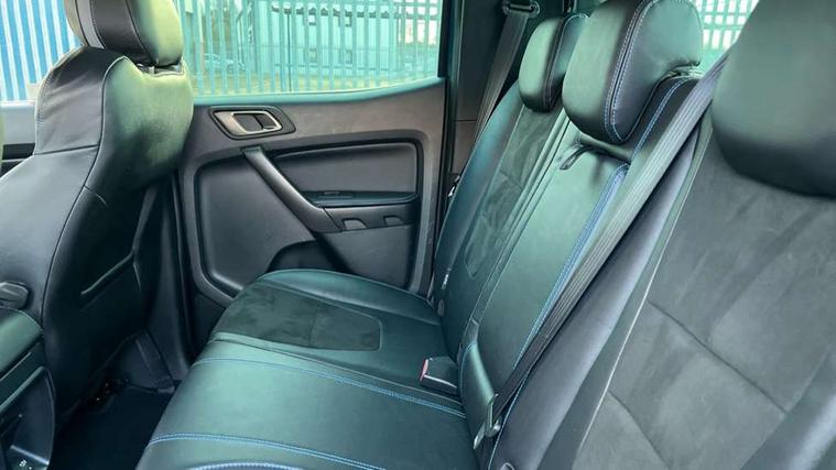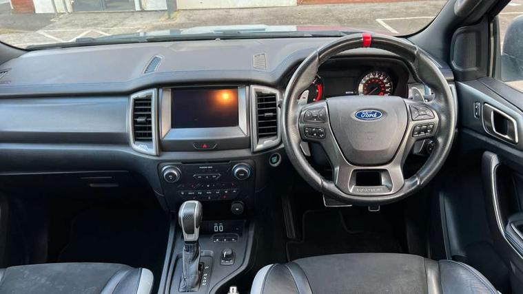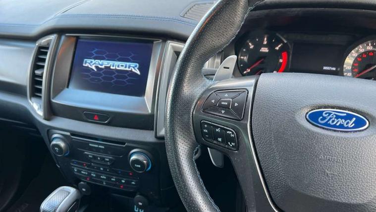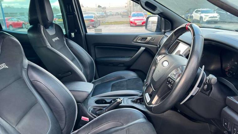 2 key fob, Collision mitigation braking system, Electric power assisted steering, Fixed rear view camera, Intelligent speed assistant, Lane keeping aid, Speed control with ASLD, AEB and ISA, Speed sign recognition, Trip computer, Automatic headlights, Black door mirrors, Black front fender grille, Black plastic front bumper, Black radiator grille, Black side steps with Raptor logo, Black tailgate handle, Daytime running lights, Dual power heated fold back door mirror with puddle lamp and signal, Dyno grey exterior door handle, Dyno grey painted rear bumper, Dyno grey sports hoop with side rails, Electrically operated windows with one shot driver's window, Electrochromic interior mirror, Front splash guard and mud flaps, Heated windshield and rear window, Heavy body construction, High mounted stop lamp with cargo area light, LED Front fog lamp, LED headlamps, Low speed crash foam in bumper, Power rear side window, Privacy glass, Rain sensitive windshield wipers, Rear bumper sensor device, Rear splash guard, Single rear fog lamp, Tailgate - Easy-lift/lower mechanism, Under hood engine cover, Underbody protection, Cargo management system, Centre console coolbox, Chrome interior door handle, Driver seat back mounted map pocket, Dual control system - Electronic air temperature control (EATC), Ebony headliner, Front roof interior assist handle, Heated front seat, Leather gearknob, Leather handbrake with chrome button, Load box bedliner including power point and tie down hook, Mountain top lockable cover and load bars, Power adjustable 8 way driver seat, Power adjustable 8 way passenger seat, Premium front and rear floor mats with Raptor logo, Reach and rake adjustable steering column, Rear seat centre armrest, Roof storage for driver sunglasses, Second row bench seat, Single driver sunvisor with illuminated vanity mirror and ticket holder + sliding rod, Single passenger sunvisor with illuminated vanity mirror + sliding rod, Soho grain premium leather upholstery with Raptor logo, Unique leather stitched steering wheel, Vinyl door trim panel insert, Washer tank level warn lamp, ICE feature pack 129 - Ranger, Trailer tow pack - Ranger, 3 point inertia rear seatbelts, Child proof rear door locks, Driver and front passenger airbag, side airbag, curtain airbag and driver knee airbag, ISOFIX hardpoint attachment, Passenger airbag disable lamp, Seat mounted Thorax side airbags, Seatbelt reminders for driver and front passenger, 433 MHz high power door lock frequency, Double locking power door lock, Immobiliser, Locking wheel nuts, Passive keyless entry and start system, Power tailgate lock, Security lock group 5, Thatcham security system, Volumetric remote alarm system with less battery backup, ABS, ESP, RSC and Terrain management, Emergency brake assist, Loadbox power point plug, Locking rear axle, Performance suspension, Power converter, Standard electic starter, 17" Dyno grey alloy wheels and Dyno grey alloy spare wheel, All terrain tyres,