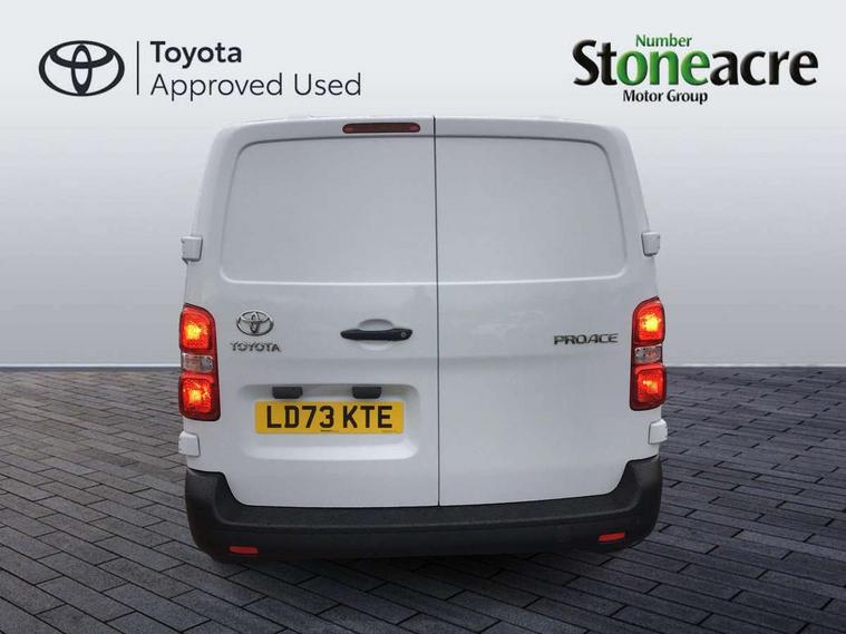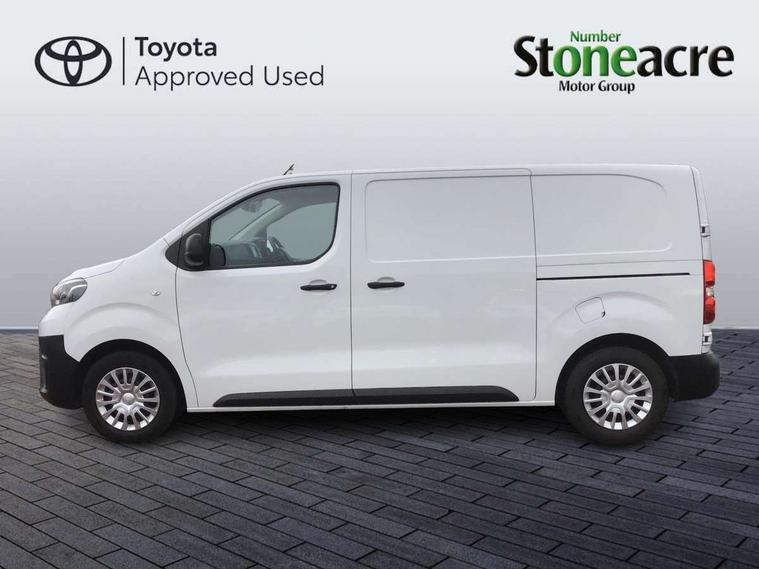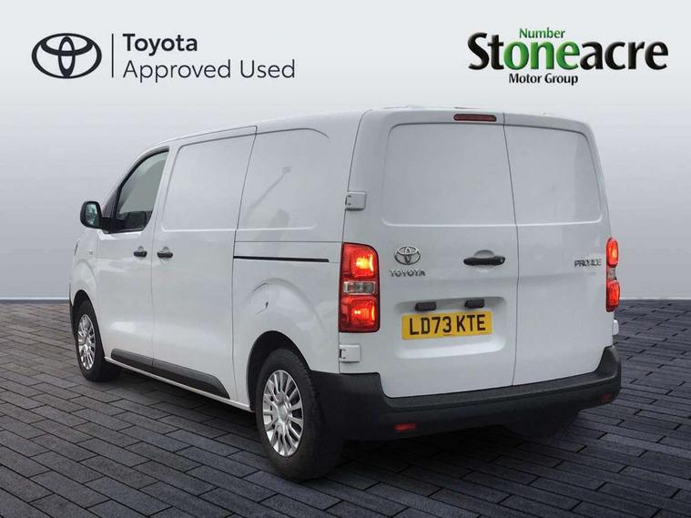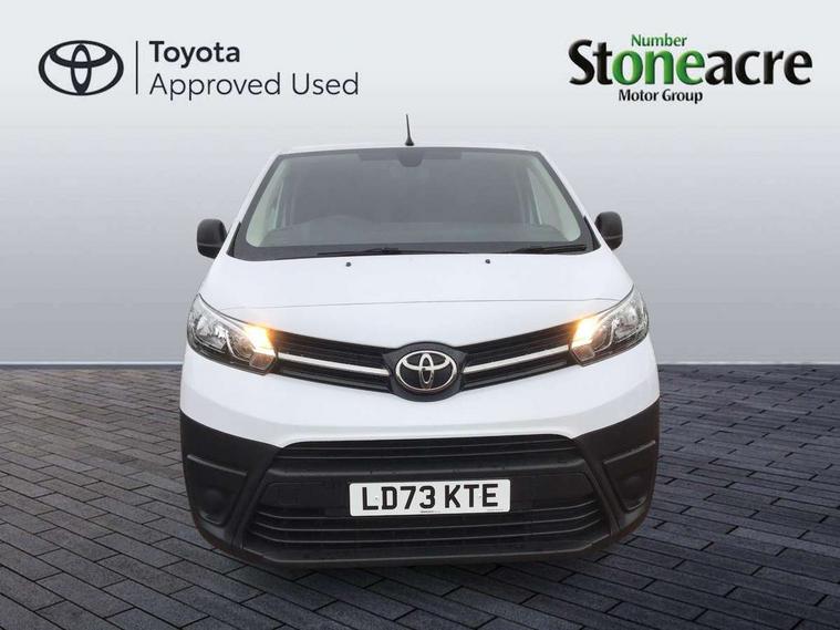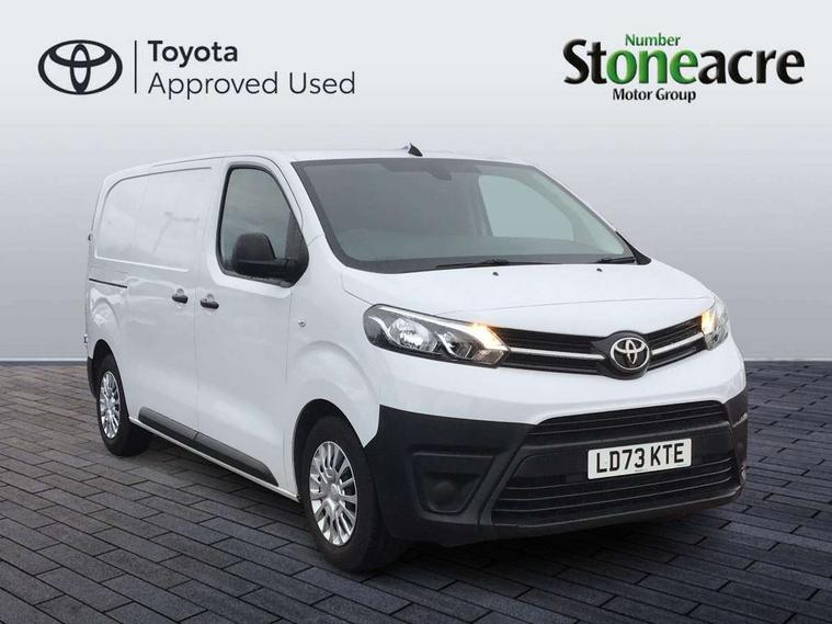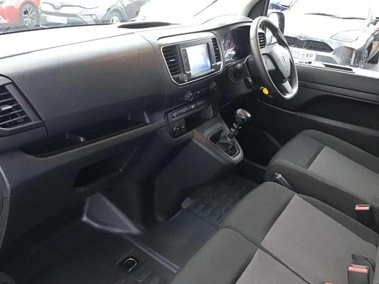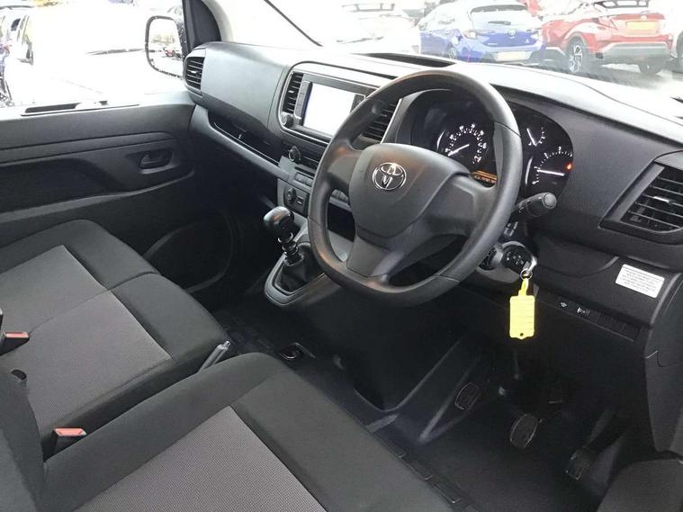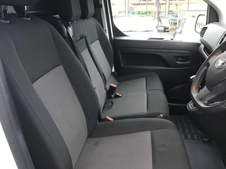 Bluetooth handsfree connectivity, Cruise control, PAS, Tyre pressure warning system (TPWS), 4 speakers, Digital radio (DAB), Radio/CD player, USB connector, 180 degree opening rear doors, Acoustic windscreen, Auto Headlights, Auto wipers, Black bumpers, Black door handles, Black protection moulding on side door, Body Coloured roof, Daytime running lights, Front power windows, Headlight cut-off reminder, Heated door mirrors, LED High mounted stop light, Manually adjustable day/night rear view mirror, Multi reflector halogen headlights, Panel rear wing doors, Power adjustable door mirrors, Rear combination lights, Short Antenna, Smoke tinted (30%) privacy glass on rear passenger window, Two manual sliding side doors, 2 seat front passenger bench, Driver seat armrest, Fabric seats, Front cup holders, Front room lights, Glovebox light, LED Driver and front passenger personal lights, Lighted and chilled upper glove box, Manually reclining and sliding driver and front passenger seats, Open upper dashboard storage compartment, Panel bulkhead with window and protective grille, Storage under passenger bench, Air conditioning and Smart cargo pack - Proace, Parking pack - Proace, Double front passenger airbag, Front passenger airbag on/off switch, Supplement restraint system (SRS) 2 airbags, Alarm, Deadlocks + 2 remote keys, Power door locks, 12V power front outlet, 12v socket in dashboard and rear, Adjustable speed limiter (ASL), Anti lock braking system (ABS), Brake Assist (BA), Stop/start function, Toyota traction select, Vehicle stability control (VSC) and hill start assist control (HAC), Full size spare wheel, Full wheel covers,
