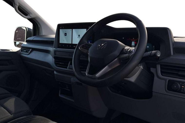 12" digital drivers display, 13" touchscreen infotainment display with wireless app connect and DAB radio, 5G Modem, Adaptive cruise control, Apple CarPlay and Android Auto, Dynamic road sign display, eCall emergency system, Electromechanical speed sensitive power steering, height and longitudinally adjustable steering column, Lane and blind spot assist with exit warning system, Preparation of VW connect and connect plus, Traffic jam assist, Wireless mobile phone charging, Wrong way driver warning, Body colour bumpers, Body coloured door handles, Body coloured door mirrors, Body coloured radiator grille, Electrically heated, adjustable and folding door mirrors, Heat reflecting side window glass, Mud flaps front and rear, Rear Transporter nameplate in black grained decorative trim, Vehicle opening configuration 1x 1st row of seats, 2x all doors, 12V outlet in centre console and 12V outlet on rear right D-pillar, 2x 15-W USB data/charging ports in dashboard and 1x USB-C, 1x USB-A center bottom, 2x LED lights in load compartment, 3x additional super bright LED lights in load compartment, 4 way height and tilt adjustable head restraints, 5 additional USB-C charging ports, Black plastic scuff plate for sliding door in cargo without illumination, Cabin interior lighting, Gear selector lever on steering wheel, Glasses compartment in driver side roof, Grab handle on A-pillar passenger side, Illuminated lockable glovebox, Lashing rings for reinforced floor covering, Narrow centre console with cup holder and compartment for mobile phone, Overhead storage compartment, Rubber floor covering in cab, Striped fabric upholstery, Without passenger seats in load compartment, Driver and front passenger airbag with front passenger airbag deactivation, Dual tone horn, Front and curtain airbags for driver and front passenger, Seat belt pretensioner for driver seat, Anti theft alarm system with interior monitoring in cab, backup horn and towing protection, Electronic immobiliser, Lockable wheel bolts, Preparation for alcohol ignition interlock, 5+ Promise, Alternator - 230A, Electromechanical brake booster, Electronic stability control, ABS, ASR with deactivation button, hill start assist and brake assist system,