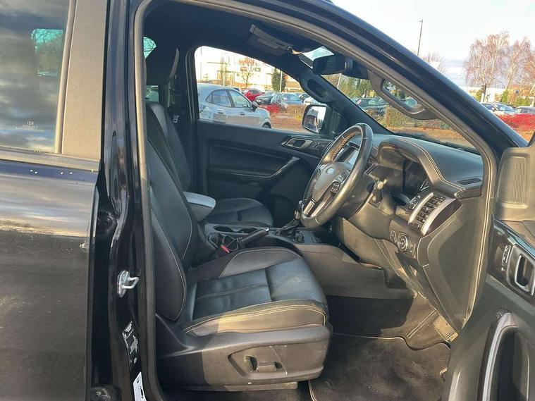 2 key fob, Collision mitigation braking system, Electric power assisted steering, Fixed rear view camera, Intelligent speed assistant, Lane keeping aid, Traffic sign recognition, Trip computer, Automatic headlights, Body coloured plastic front bumper, Boulder grey exterior door handle, Boulder grey exterior door mirror, Boulder grey radiator grille, Daytime running lights, Dual power heated fold back door mirror with puddle lamp and signal, Electrically operated windows with one shot driver's window, Electrochromic interior mirror, Front splash guard and mud flaps, Heated windshield and rear window, High mounted stop lamp with cargo area light, LED Front fog lamp, LED projector headlamps, Moulded in colour tailgate handle, Painted front fender grille, Privacy glass, Rain sensitive windshield wipers, Rear bumper chrome under-bar, Rear bumper step in boulder grey, Rear mudflaps, Roof rails, Side step with brushed inserts, Sports bar, Tailgate - Easy-lift/lower mechanism, Under hood engine cover, Underbody protection, Centre console coolbox, Chrome interior door handle, Driver seat back mounted map pocket, Dual control system - Electronic air temperature control (EATC), Ebony headliner, Heated front seat, Journey grain partial leather upholstery with Wildtrak logo, Leather gearknob, LED ambient interior lighting, Power adjustable 8 way driver seat, Premium front and rear floor mats with Wildtrak logo, Reach and rake adjustable steering column, Roof storage for driver sunglasses, Sport leather stitched steering wheel, Tie down rails and rope hooks, Wildtrak door trim panel insert, ICE feature pack 129 - Ranger, 3 point inertia rear seatbelts, Driver and front passenger airbag, side airbag, curtain airbag and driver knee airbag, ISOFIX child safety seat attachment, Seatbelt reminders for driver and front passenger, Tyre pressure sensors, Double locking power door lock with flip key, Immobiliser, Locking wheel nuts, Passive anti theft system, Passive keyless entry and start system, Power tailgate lock, Spare wheel lock, Thatcham category 1 alarm security system, ABS, ESP and roll over mitigation, Emergency brake assist, Engine start/stop system, Locking rear axle, Power converter,