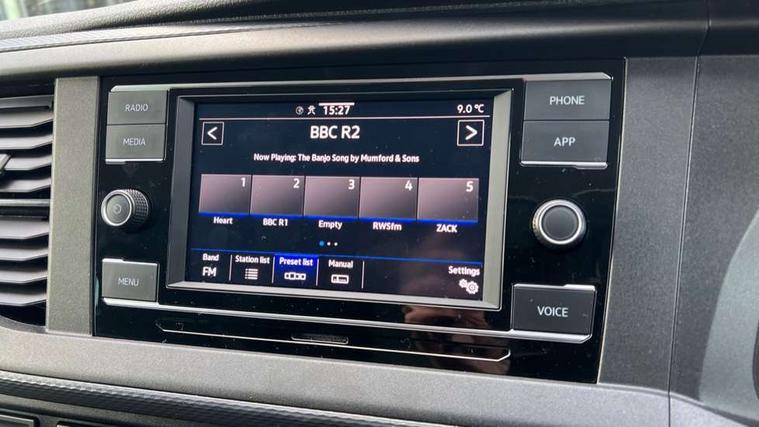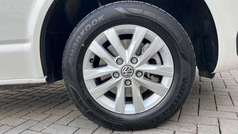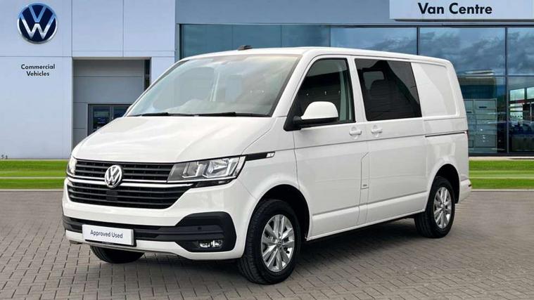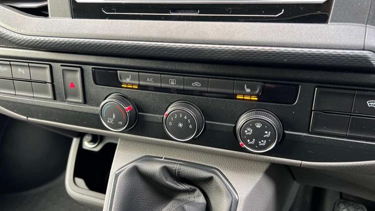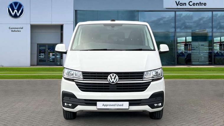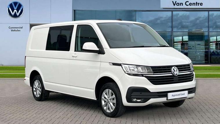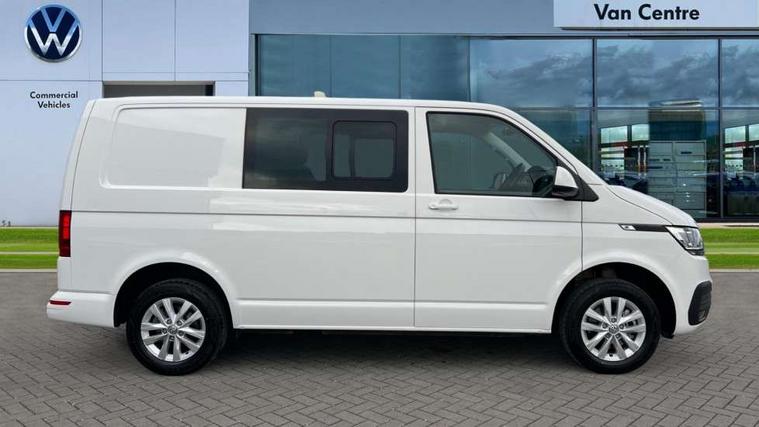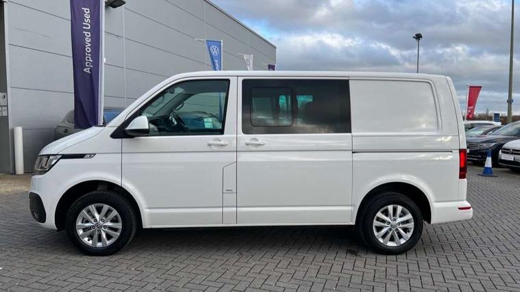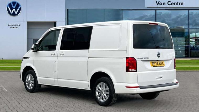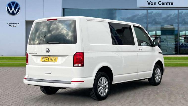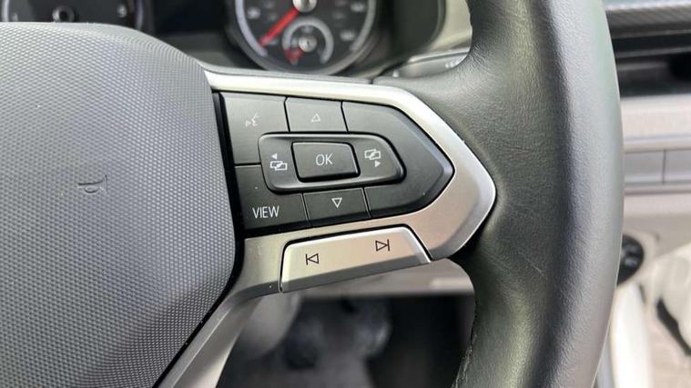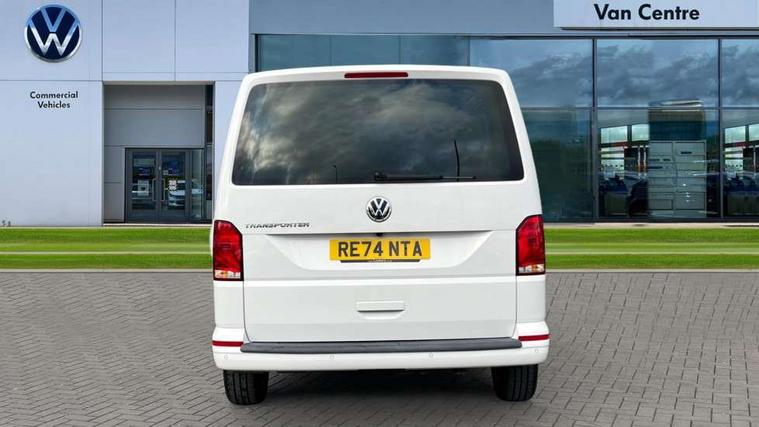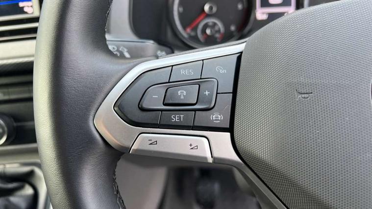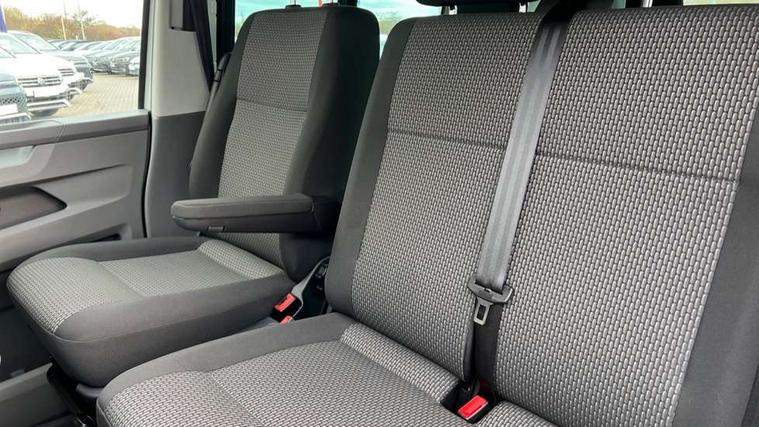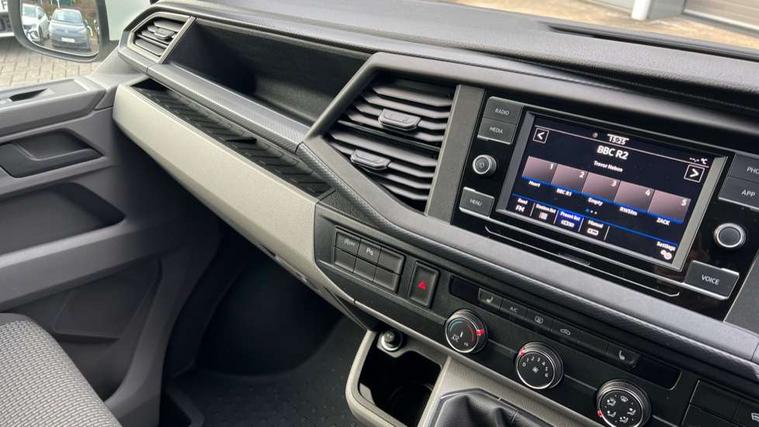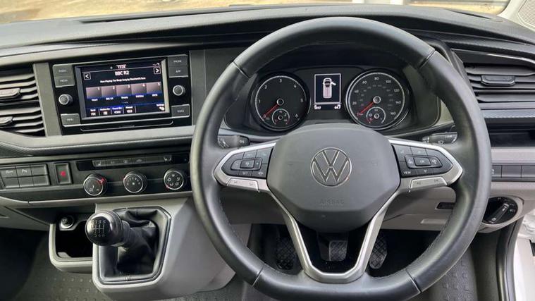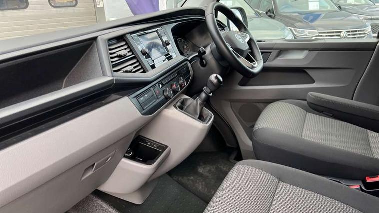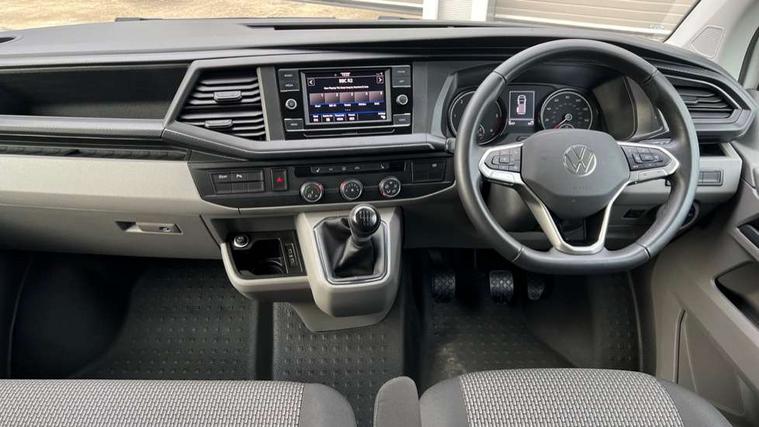 Adaptive cruise control, Child seat anchors ISOFIX and top tether in 2nd row of seats, Cross wind assist, Dimmable illuminated instruments, Driver alert with black and white multi function display plus, eCall emergency system, Forward collision warning front assist with autonomous emergency braking, Headlight range control, Mobile phone interface, Without voice control, 2 USB interfaces type C in dashboard, 4 speakers with 2 tweeters and 2 woofers, Composition colour radio with 6.5" touchscreen, Digital radio reception (DAB+), Volkswagen app connect, Automatic headlight control, leaving home and manual coming home feature, Front fog lamps with cornering light, Green heat insulating glass, Heated front windscreen, Illuminated steps in passenger/load compartment, Left convex exterior mirror, Power folding adjustable door mirrors with separately heated, Privacy glass from the B-pillar and heat-insulating glass in front, Radiator grille with 2 chrome trims, Rear window with heated insulating glass, heated rear window wiper and washer system, Right convex exterior mirror, Tailgate closing with unlatching from the inside, Transporter nameplate on the rear fender, Windshield wiper intermittent control with rain sensor for windshield wipers, Without adhesive film, 3 spoke leather wrapped multi function steering wheel, Additional sound deadening measures in cab and passenger compartment, Auto dimming breakaway interior rear view mirror, Comfort headliner in cab, hardboard roof trim in passenger and load compartment, Dust/pollen filter, Folding grab handles and storage compartments on cab seats, reading light, Front seats on the right in 1st row of seat, Glove compartment with illumination, Heavy duty tool kit and jack, Interior plastic loading edge protection, Lashing rings for load restraint system, LED Interior lighting in load and passenger compartment, Manual height adjustable and lumbar support for driver and single passenger seats, Medium height for vehicles with window aperture hardboard side trim panels in passenger/load compartment, Refrigerant R134a, Standard lower part dashboard in palladium, Without partition, Without seats in 3rd row of seats, Comfort pack - Transporter, Exterior pack without fog light- Transporter, Light and vision pack - Transporter, Non smoker pack - Transporter, 3 point height adjustable seat belts on outer seats cab with electric pretensioners, Driver and front passenger airbag with front passenger airbag deactivation, Power operated child safety lock, Warning buzzer and light for driver seat belt not fastened, Anti theft alarm system with interior monitoring in cab, backup horn and towing protection, Lockable wheel bolts, 16" chassis with 16" brake system, Additional 12V socket, Diesel particulate filter, Electronic stability control, ABS, ASR with deactivation button, hill start assist and brake assist system, Speed limiter, Start/stop system with regenerative breaking, 16" Clayton alloy wheels, Wheel trims,
