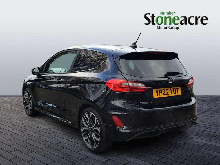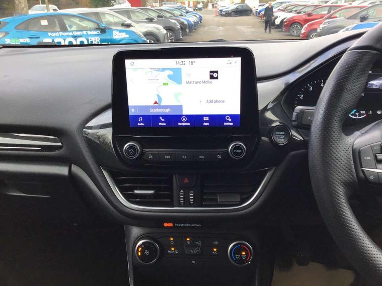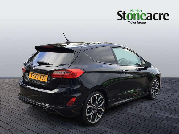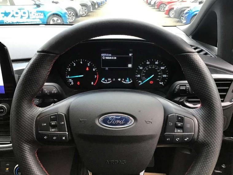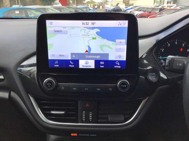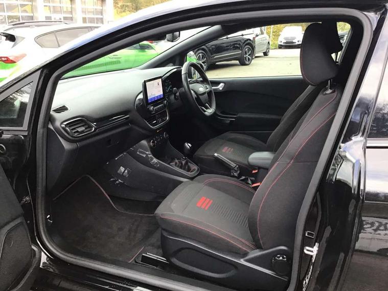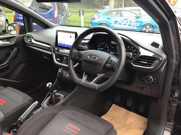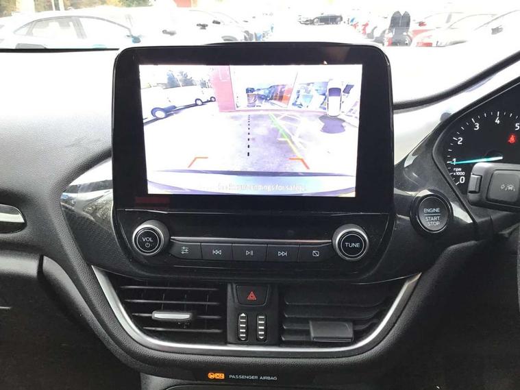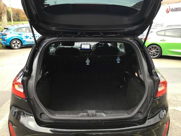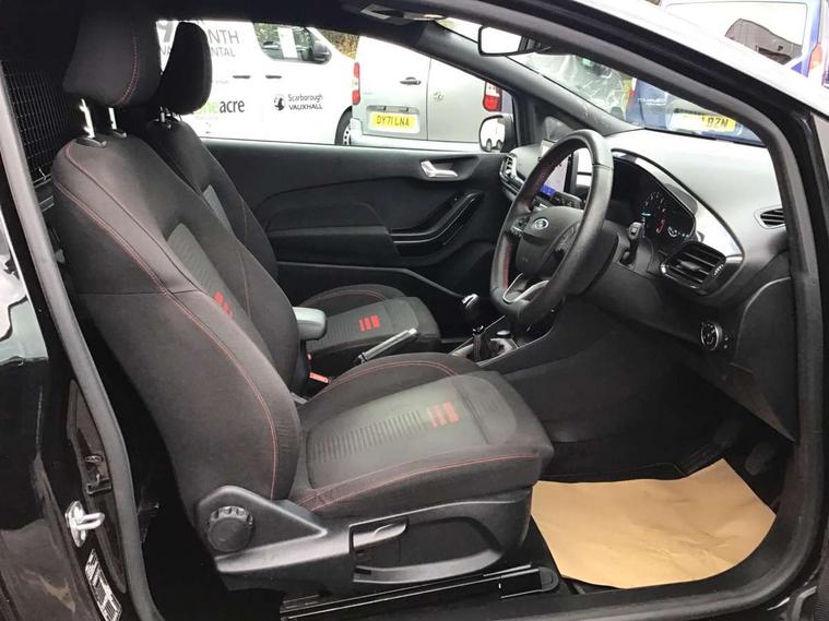 Easy fuel capless refuelling system, Less embedded modem, On board modem with FordPass Connect, PAS, Trip computer, Tyre pressure monitor, Warning indicators, Active grille shutter, Auto High Beam Assist, Automatic headlights, Black sport honeycomb grille, Body colour tailgate handle, Body coloured door handles, Body coloured exterior mirrors, Body coloured rocker panel, Body coloured sport front bumper, Body coloured sport rear bumper, Chrome exhaust extension, Electric windshield defroster, Emergency brake light flashing, Fiesta carline badge, Front headlamp leveling, Front variable intermittent and anti drip wipers, High mounted stop lamp, Indicators in front door mirrors, Plastic rear door trim panel, Power front windows with one touch up/down, Quickclear heated windscreen, Rear beam bumper, Rear spoiler, Rear tail lights, Rear wash/wipe, 4 Lashing points, Adjustable head restraints, Cargo area light, Courtesy light, Door trim panel level 2, Driver and passenger non illuminated sunvisor with covered vanity mirror, Driver seat map pocket, Eton cloth upholstery with eton bolsters, Full floor centre console with armrest, Hand stitched sensico soft touch steering wheel, Load floor liner, Manually adjustable 4 way driver seat, Mini overhead console with map lights, Passenger seat map pocket, Plastic handbrake grip, Pollen filter, Polyurethane gear shift knob, Premium floor mats, Reach and rake adjustable steering wheel, Recirculation heater, Rubber load floor cover, Sports dark headliner, Visibility pack - Fiesta Van, Window pack 9 - Fiesta Van, Breakdown warning triangle, Driver airbag restraint, Driver and passenger seatbelt reminder, Driver and passenger seatbelt tensioners, First aid retain strap, Fixed front seatbelt mount, Intelligent protection system, Passenger airbag deactivation switch, Passenger airbag restraint, Warning triangle retaining straps, Door entry remote control unit with 2 flip keys, Immobiliser, Locking lug nuts, Power door deadlocks, Special remote key for keyless start, Thatcham category 1 alarm, Electronic emergency brake sssist, Front disc and rear drum brakes, Front power point plug, Interactive vehicle dynamics/traction control, Non painted brake calipers, Sports suspension,