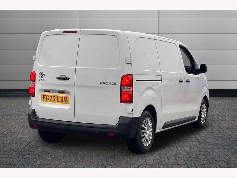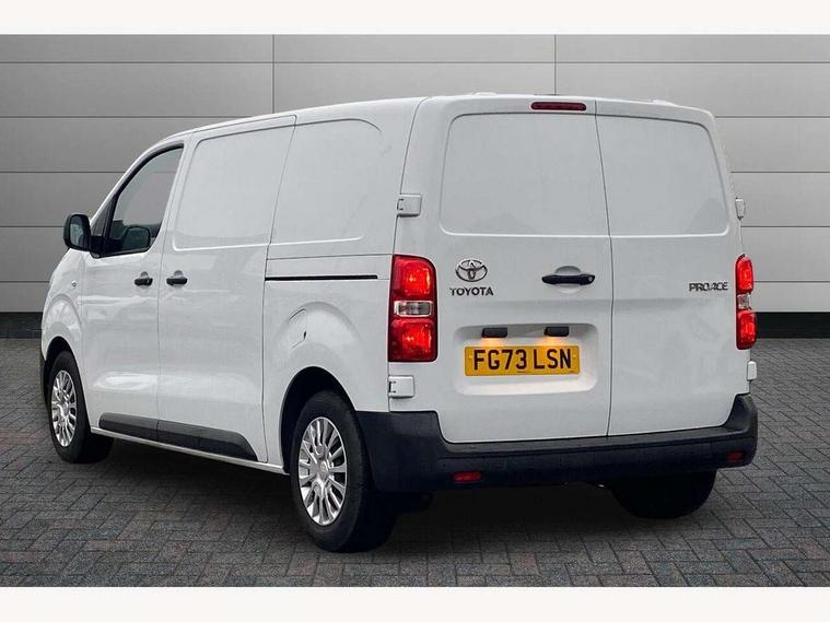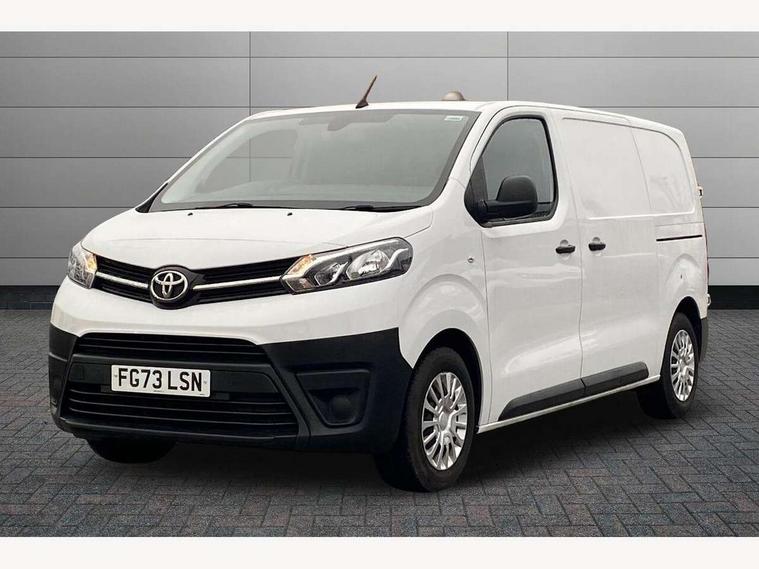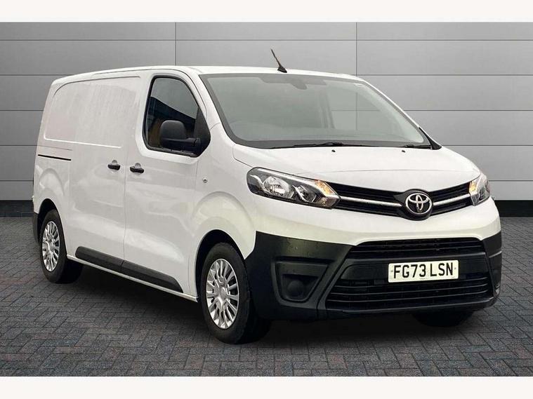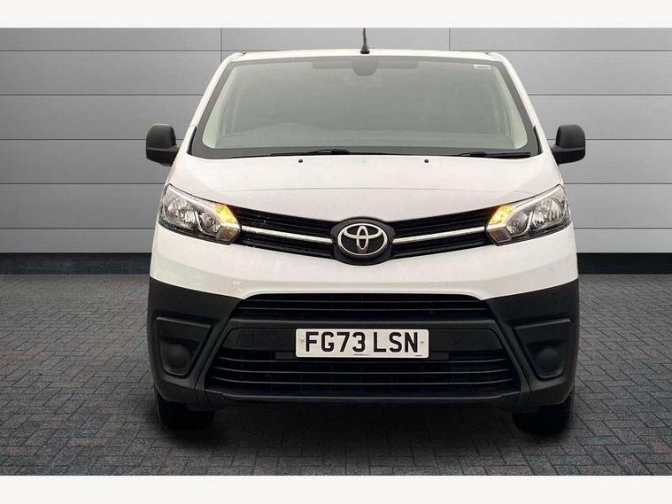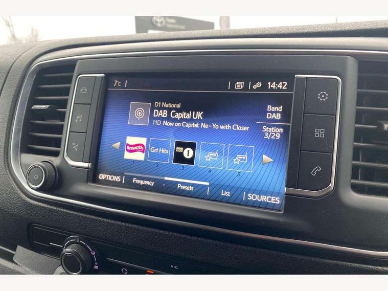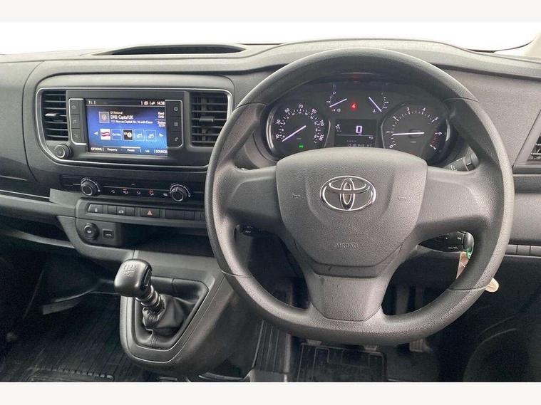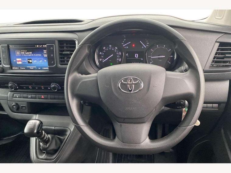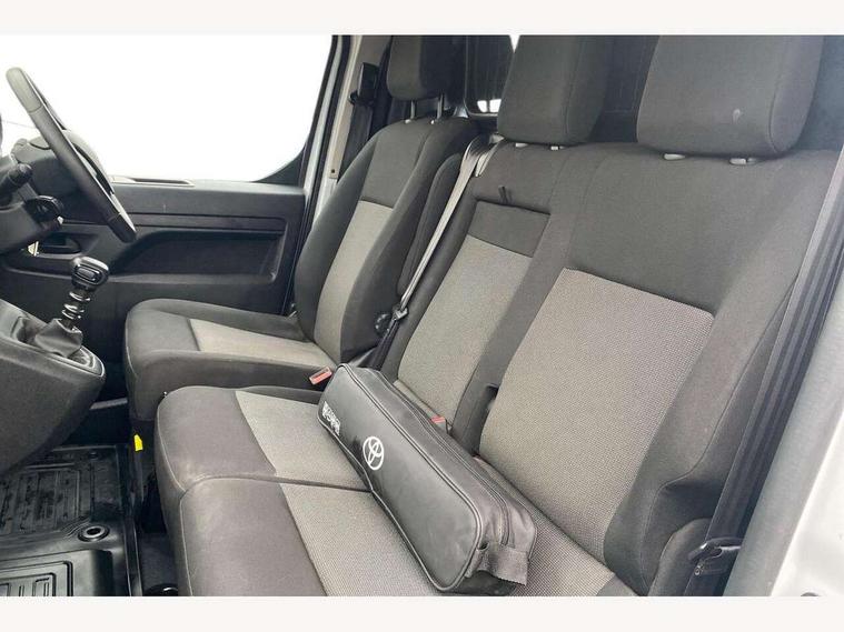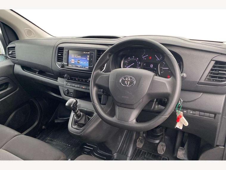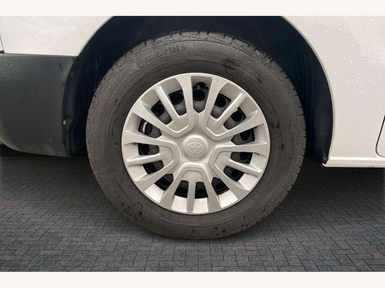 Bluetooth handsfree connectivity, Cruise control, PAS, Tyre pressure warning system (TPWS), 4 speakers, Digital radio (DAB), Radio/CD player, USB connector, 180 degree opening rear doors, Acoustic windscreen, Auto Headlights, Auto wipers, Black bumpers, Black door handles, Black protection moulding on side door, Body Coloured roof, Daytime running lights, Front power windows, Headlight cut-off reminder, Heated door mirrors, LED High mounted stop light, Manually adjustable day/night rear view mirror, Multi reflector halogen headlights, Panel rear wing doors, Power adjustable door mirrors, Rear combination lights, Short Antenna, Smoke tinted (30%) privacy glass on rear passenger window, Two manual sliding side doors, 2 seat front passenger bench, Driver seat armrest, Fabric seats, Front cup holders, Front room lights, Glovebox light, LED Driver and front passenger personal lights, Lighted and chilled upper glove box, Manually reclining and sliding driver and front passenger seats, Open upper dashboard storage compartment, Panel bulkhead with window and protective grille, Storage under passenger bench, Air conditioning and Smart cargo pack - Proace, Parking pack - Proace, Double front passenger airbag, Front passenger airbag on/off switch, Supplement restraint system (SRS) 2 airbags, Alarm, Deadlocks + 2 remote keys, Power door locks, 12V power front outlet, 12v socket in dashboard and rear, Adjustable speed limiter (ASL), Anti lock braking system (ABS), Brake Assist (BA), Stop/start function, Toyota traction select, Vehicle stability control (VSC) and hill start assist control (HAC), Full size spare wheel, Full wheel covers,