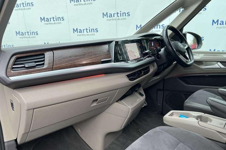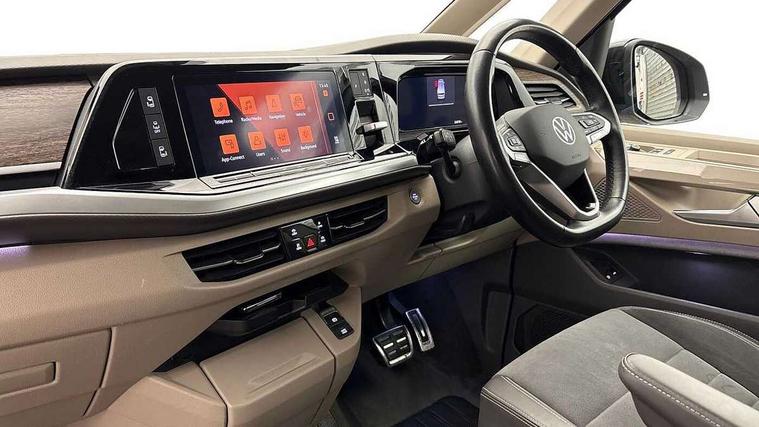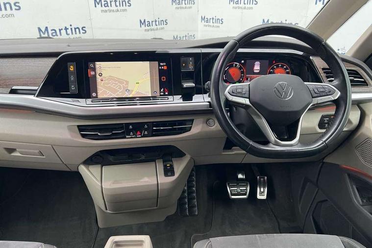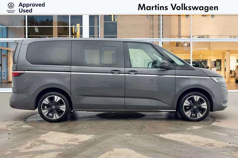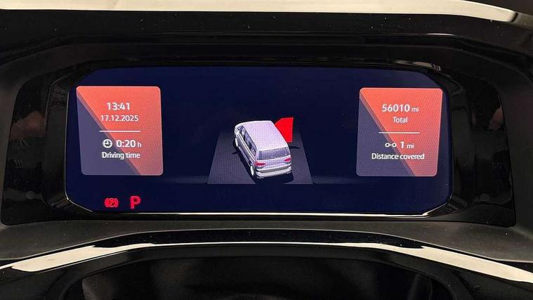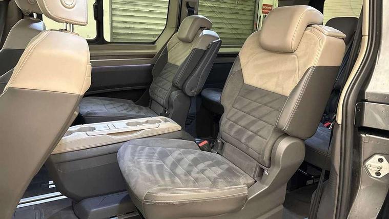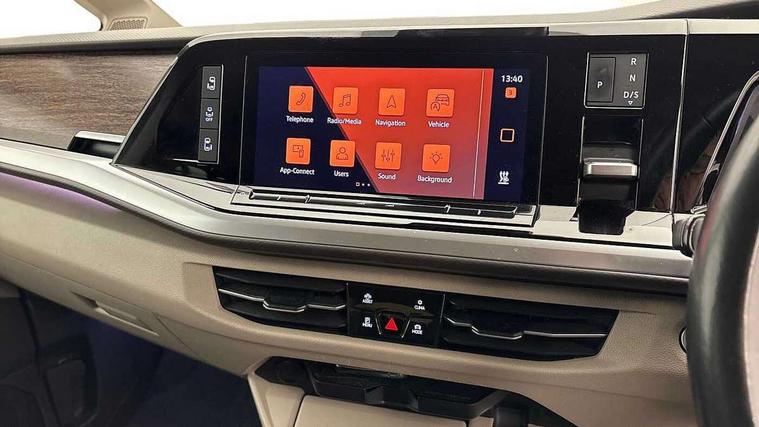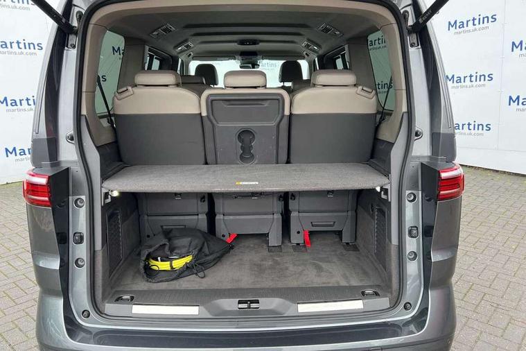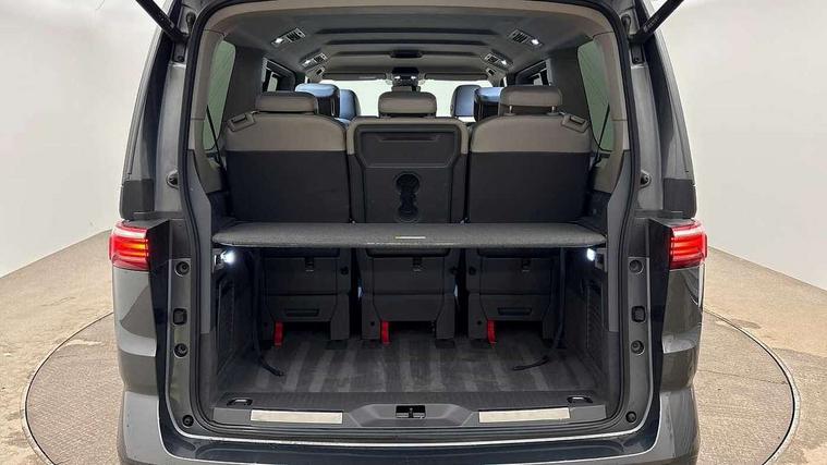Adaptive cruise control with C2X including front assist and city emergency braking system, App-Connect incl. App-Connect Wireless for Apple CarPlay and Android Auto, Digital Cockpit Pro with 10.25" Display, Driver alert system, Dynamic road sign display, eCall emergency system, Electric tailgate with virtual pedal, Electrically-operated tailgate opening and closing function (Easy open), operated via foot movement under rear tailgate, Emergency assist, Lane keeping system Lane Assist, Mobile phone interface, PAS, Semi-automated driving assistance, Socket AC Type 2, Travel assist, Voice control system including Alexa web app, We connect preparation, 1 x 6 metre charging cables - 16amp AC cable for wallbox chargepoints (mode 3), Electronic differential lock, 2 USB-C ports in front and 4 USB-C ports in passenger compartment, Digital radio reception (DAB+), Additional interior noise reduction measures, Advanced high beam control dynamic light assist for LED matrix headlamps, Automatic headlight control with welcome home lights, Body coloured exterior door handles, Break away auto dimming rear view interior mirror, Chrome trim decorative strip mid-way on side and rear, Dynamic headlight range control with dynamic cornering light, Electric sliding rear side door on the left/right with easy open feature, Electrically adjustable, heated and folding door mirrors, Front fog lights, Glossy black painted radiator grille with 2 illuminated chrome trims, Heated rear window with window wiper and washer system, Heated windscreen, High gloss black exterior mirror housing, IQ.Light LED matrix headlamps with LED separate daytime running light, Laminated safety glass windshield, heat and sound insulating, LED 3rd brake lamp, LED rear combination lamps, Rear wiper, Sliding windows in front sliding doors and fixed rear windows, Stainless steel tailgate trim, Surround lighting in door area and tailgate with logo projection in door area, Windshield wiper intermittent control with rain sensor, 1 x 12V sockets on the dash panel, 12V socket in passenger compartment, 3 seat bench in 3rd row, 30 colours ambient interior lighting and tailgate surround lighting, 7 single seats removable/movable, Carpet mats in cab, Climatronic 3 zone air conditioning with 2nd evaporator, auxiliary heater, air conditioned headliner and additional passenger control, Front and rear head restraints, Grab handles on A pillar for access, on driver and front passenger side, Heated steering wheel, Height adjustable seats, Height and longitudinal adjustment steering wheel with gear shift paddles, Illumination lockable glovebox compartment, ISOFIX (including i-size) and top tether in all seats in 2nd and 3rd rows, LED luggage compartment lighting X 2, Load compartment partition to 20kg with bag hooks and luggage net, Luggage compartment lid power latching with unlatching from inside, Multifunction leather steering wheel with tiptronic, Reinforced carpet floor covering in passenger compartment, Removable armrests for front seats with power adjustable lumbar support and folding table for 2nd row passenger seats, Removable armrests in 2nd row passenger seats, Single front passenger seat, Slidable multifunction table/centre console with 3 cup holders, Stainless steel pedals, Storage compartment under the 2nd and 3rd row seat and two waste bins, Sun visors with illuminated vanity mirrors and airbag warning label on front passenger sun visors, 3x3 point rear seat belts, ABS, Automatic post collision braking system, Autonomous emergency braking front assist with pedestrian and cyclist monitoring, Driver and front passenger airbag with front passenger airbag deactivation, Electric childproof lock, Electronic stability control (ESC) and Electromechanical brake booster, ESP, First aid kit with warning triangle and safety vest, Front disc brakes, Hill hold assist, Seat belt warning for the drivers and all passengers seats if unfastened, Side and curtain airbags for driver and front passenger, curtain airbags for outer seats in rear, centre airbag in front, Single tone horn, Traction control, Tyre pressure monitoring system, Anti theft alarm system with interior monitoring in cab, backup horn and towing protection, Central locking system keyless entry with touch two stage unlocking, Start/stop button on centre console, Dark woodgrain optic decorative inserts,